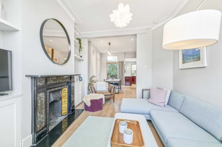 This apartment is arranged over the raised and lower ground floor of this charming white stucco building. It boasts a large reception room with exceptional ceiling height (2.9m), a modern designer kitchen with Miele appliances, a separate dining area as well as a practical laundry room with extra storage hidden under the stairs.