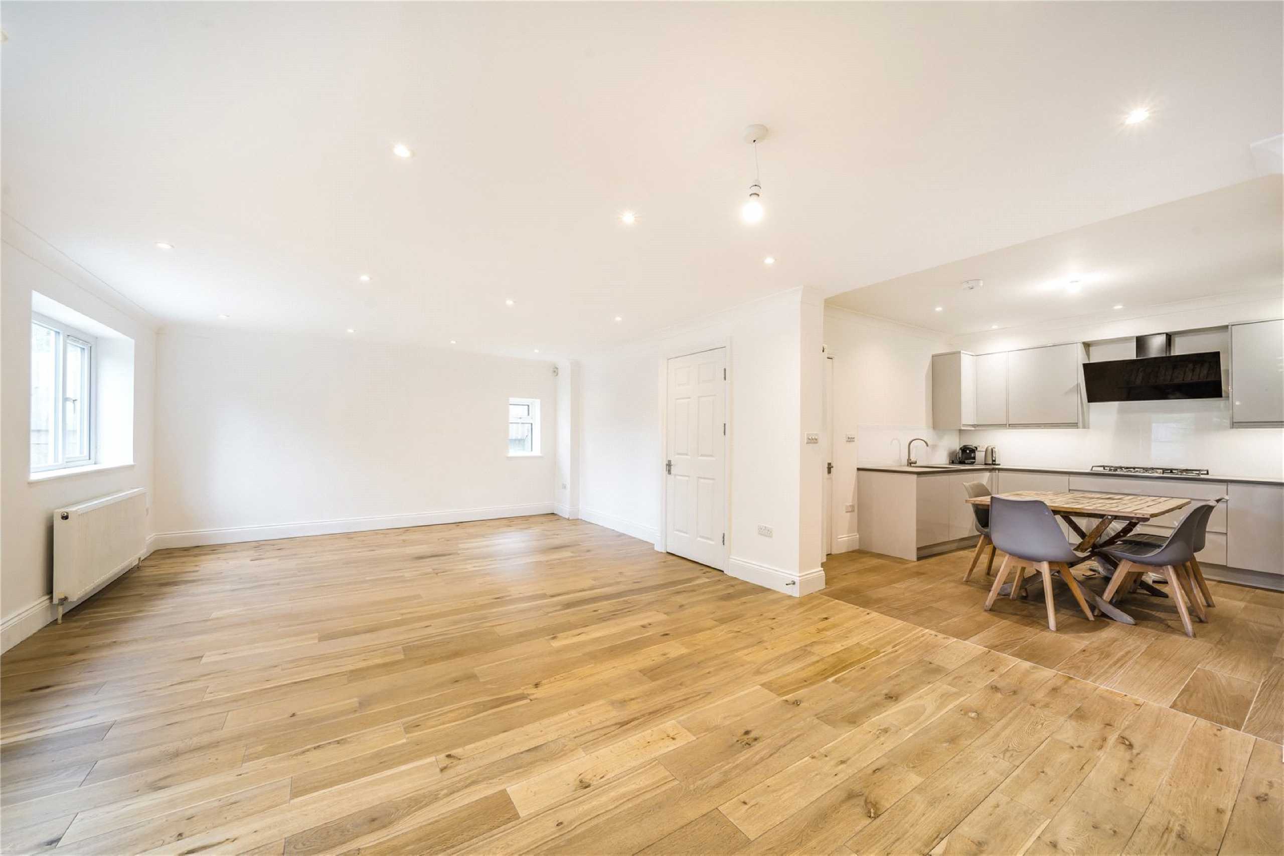 Step inside to find wood flooring, spotlights, and large bay windows that bring in plenty of natural light. The sleek, modern kitchen is seamlessly connected to a large dining/reception area, which opens directly onto a well-kept garden perfect for entertaining or relaxing outdoors.