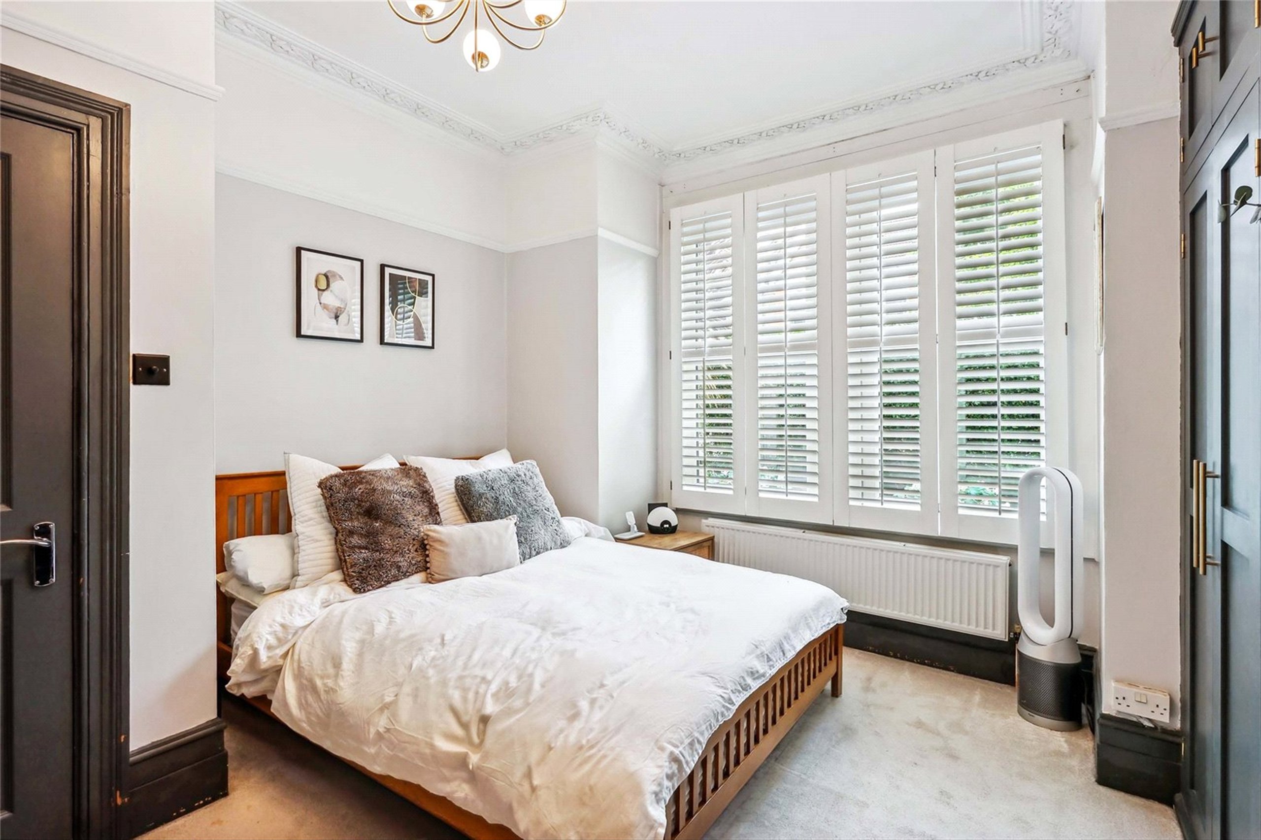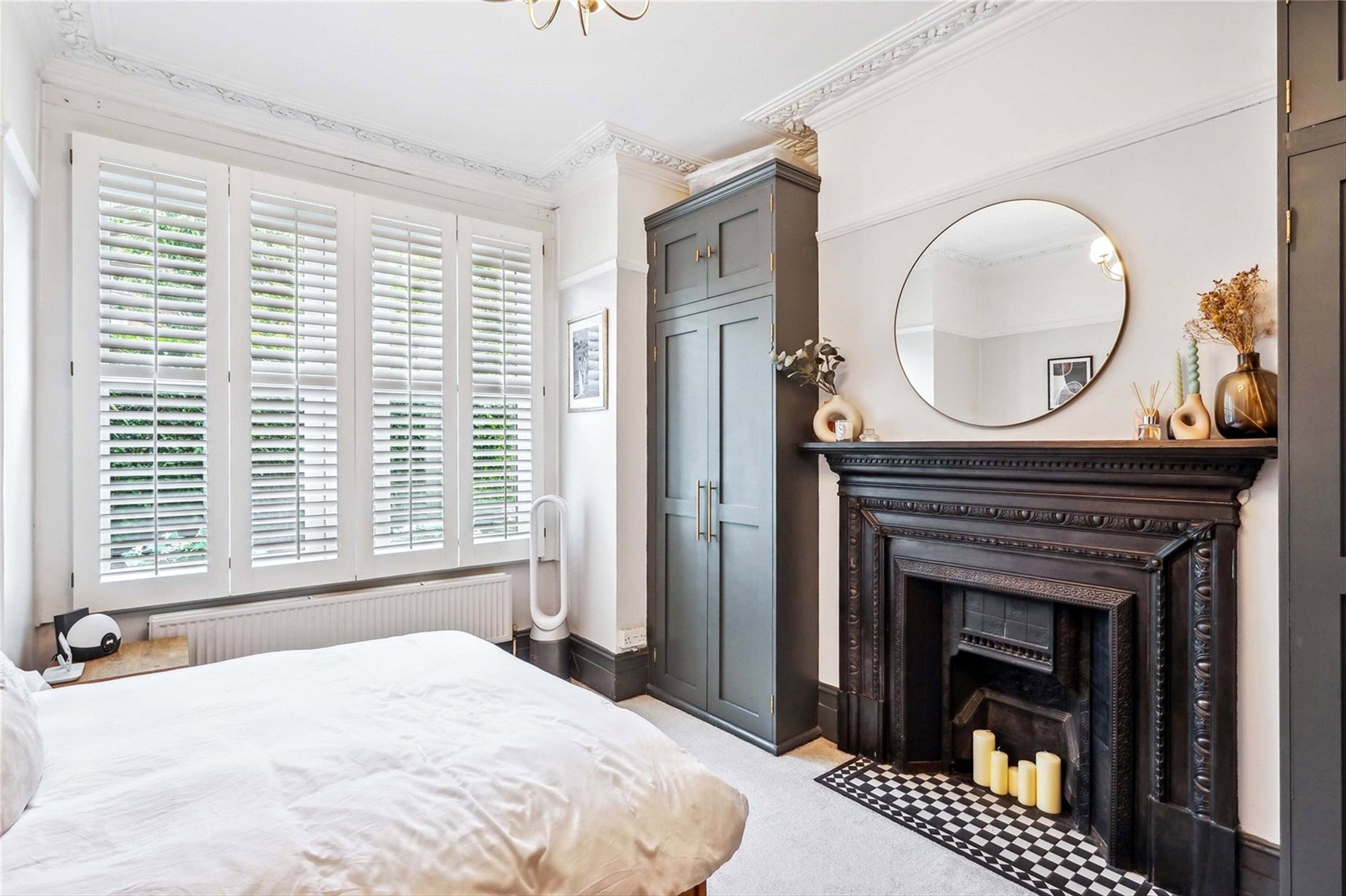 The front door opens into an entrance hall, to the front is the primary bedroom with a square bay window, fitted wardrobes, a feature fireplace and traditional cornicing. Behind this is a further double bedroom.