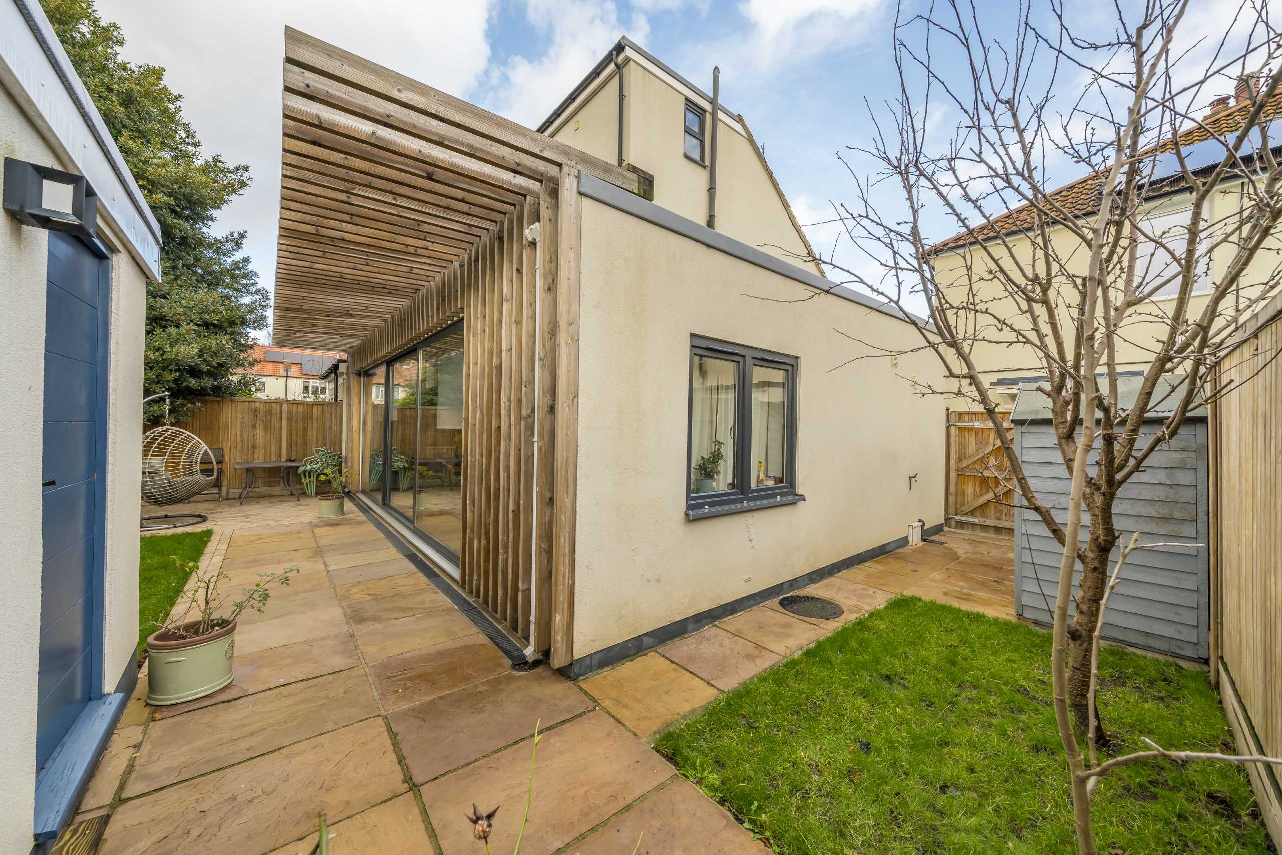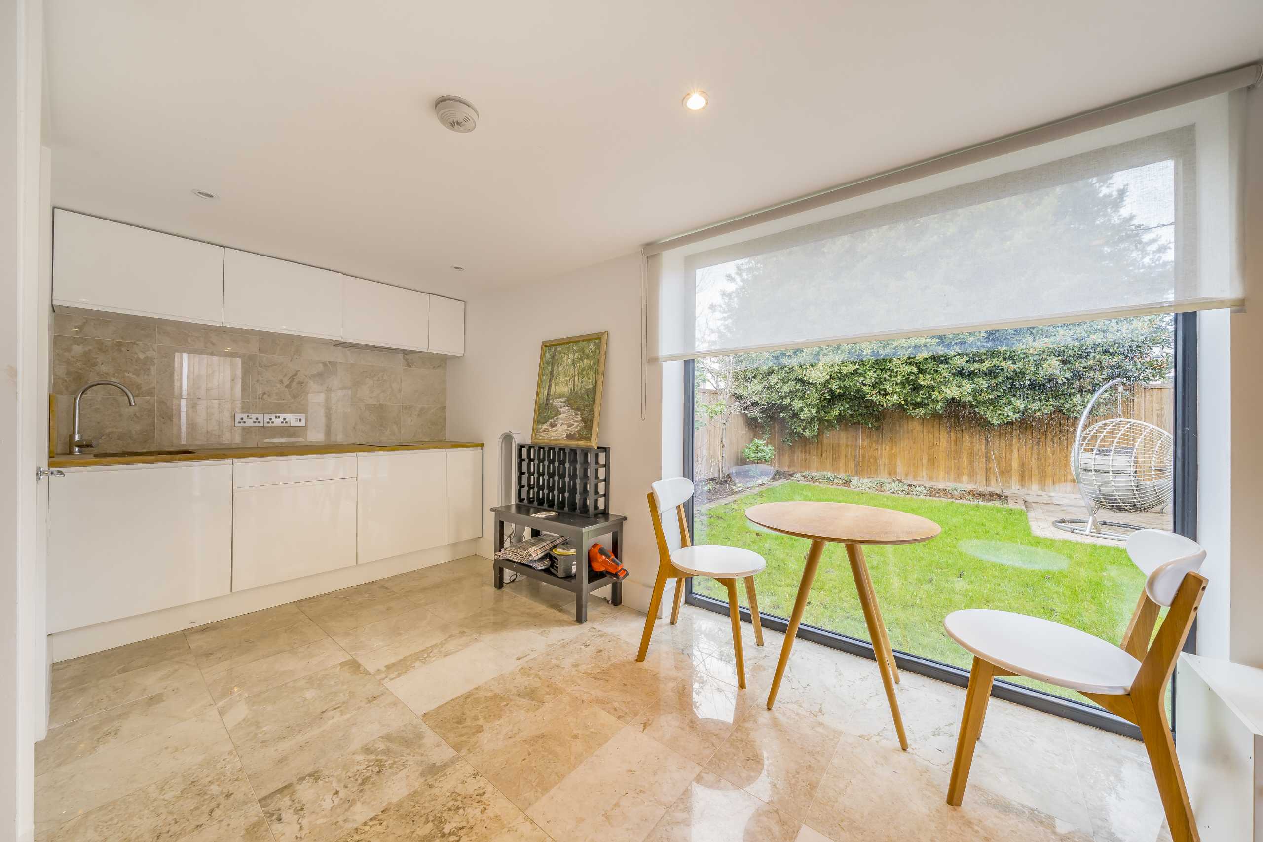 The entrance contains a spacious hallway leading to an open-plan kitchen/living room, which benefits from an abundance of natural light and underfloor heating throughout the ground floor. The fully-fitted kitchen has plenty of storage and there is a further utility room with outdoor access, ideal for busy family life. Floor to ceiling sliding glass doors from the living room lead out to a west facing garden with a self-contained studio, ideal for a home office and includes a compact kitchen, shower bathroom, WC and has under floor heating.