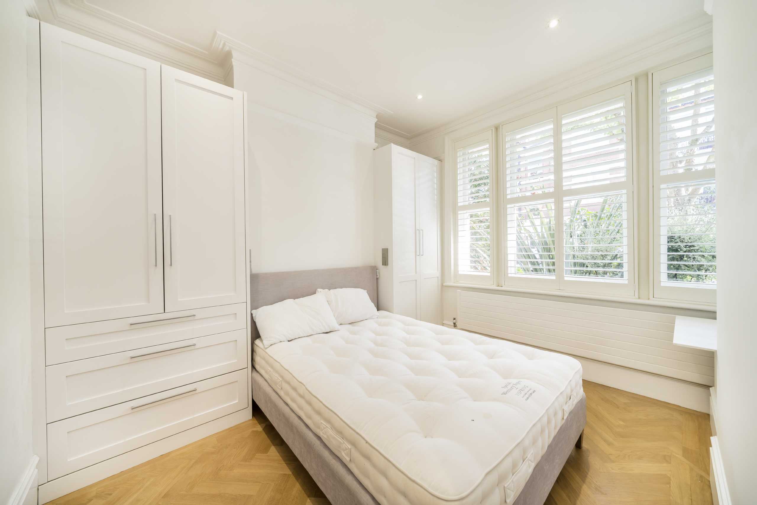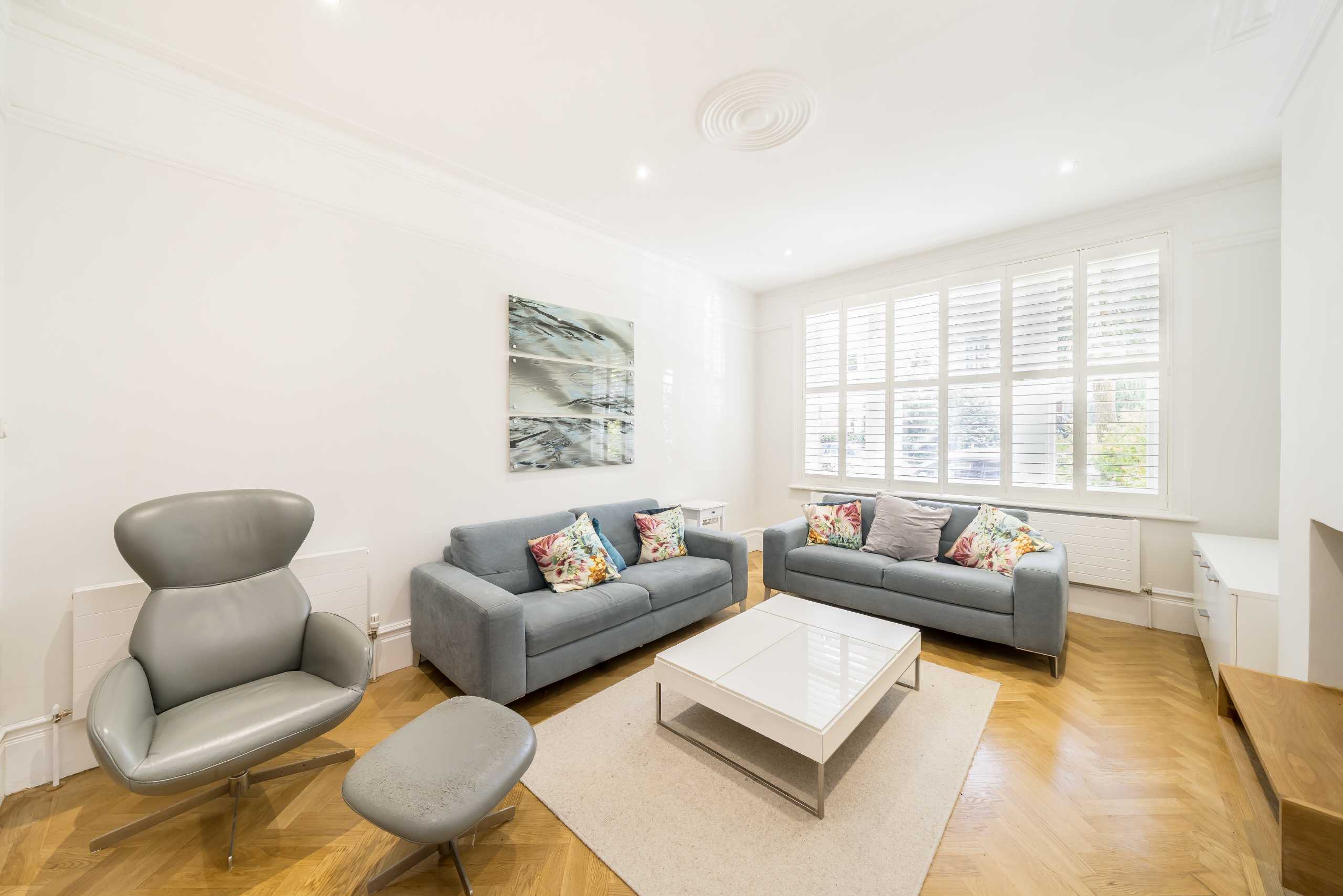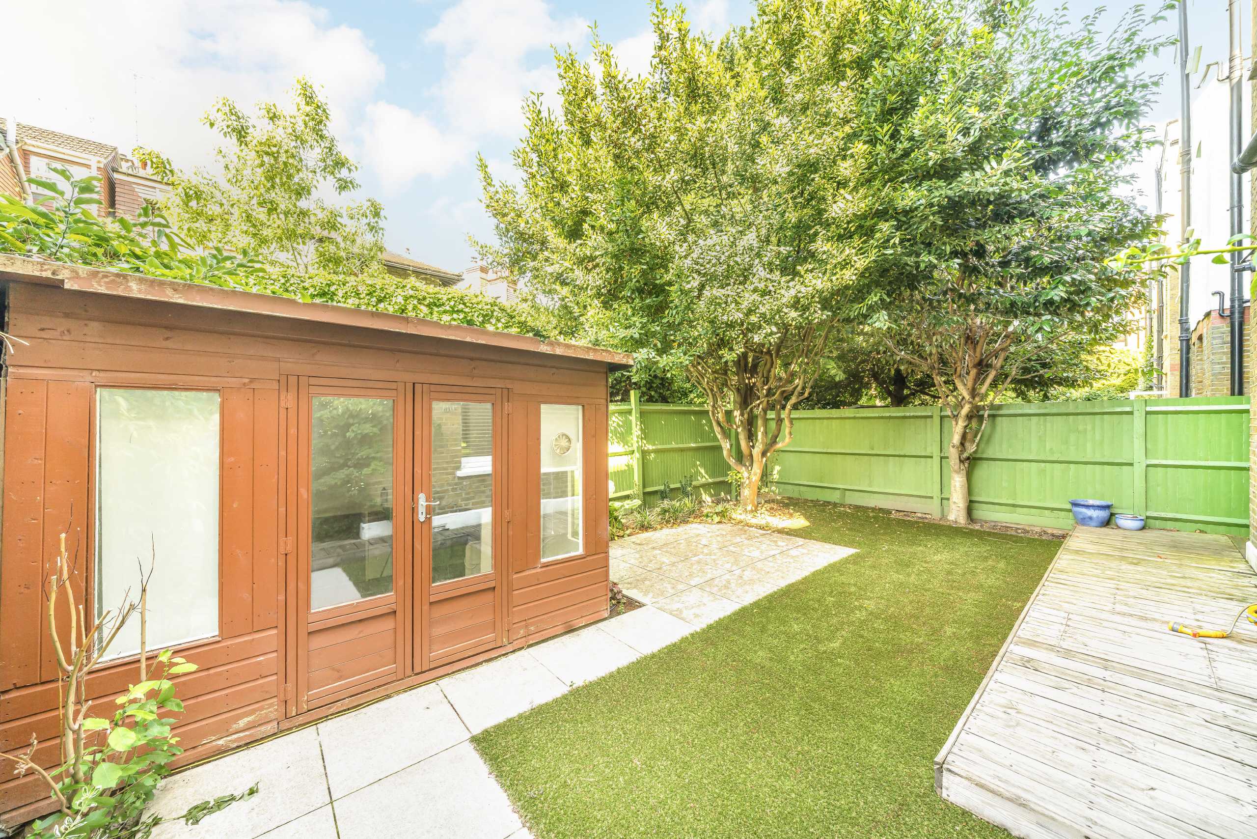 This charming ground floor flat in a sought-after riverside mansion block features high ceilings, abundant natural light, and original wooden floors. The open-plan layout includes a spacious reception room with a working fireplace, a large kitchen/dining area with ample storage, and French doors opening to a private south-facing garden with a separate studio. There are three double bedrooms with built-in wardrobes, a family bathroom, and access to expansive communal riverside gardens.