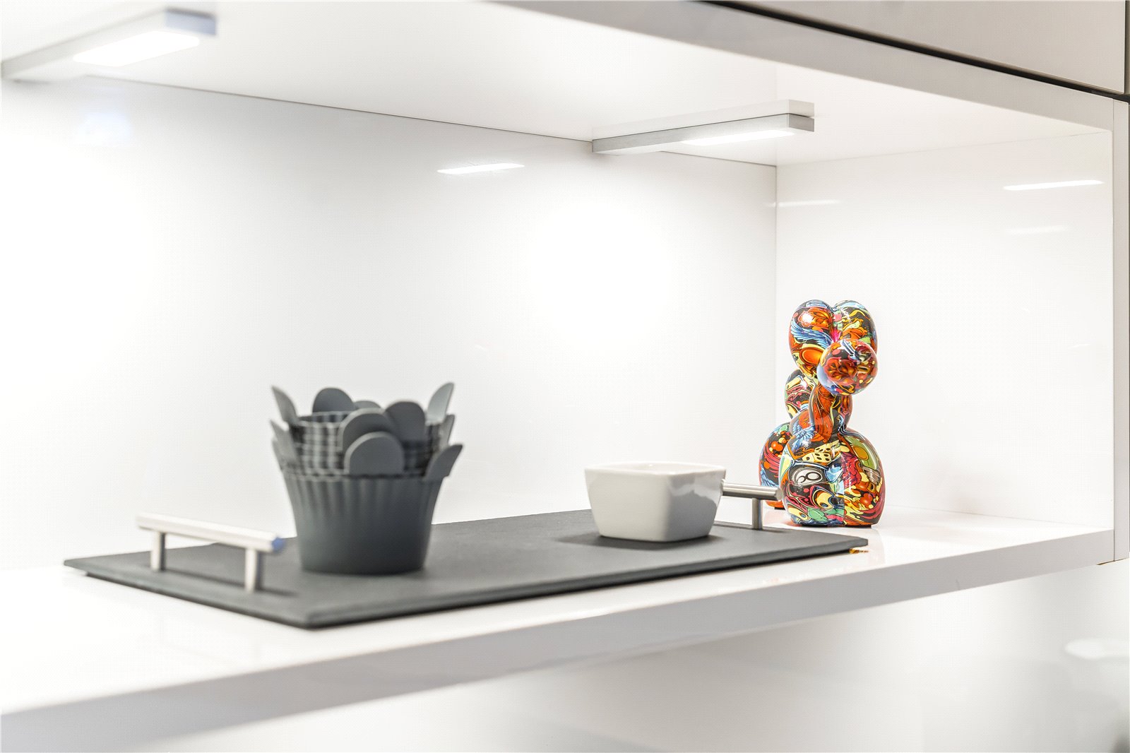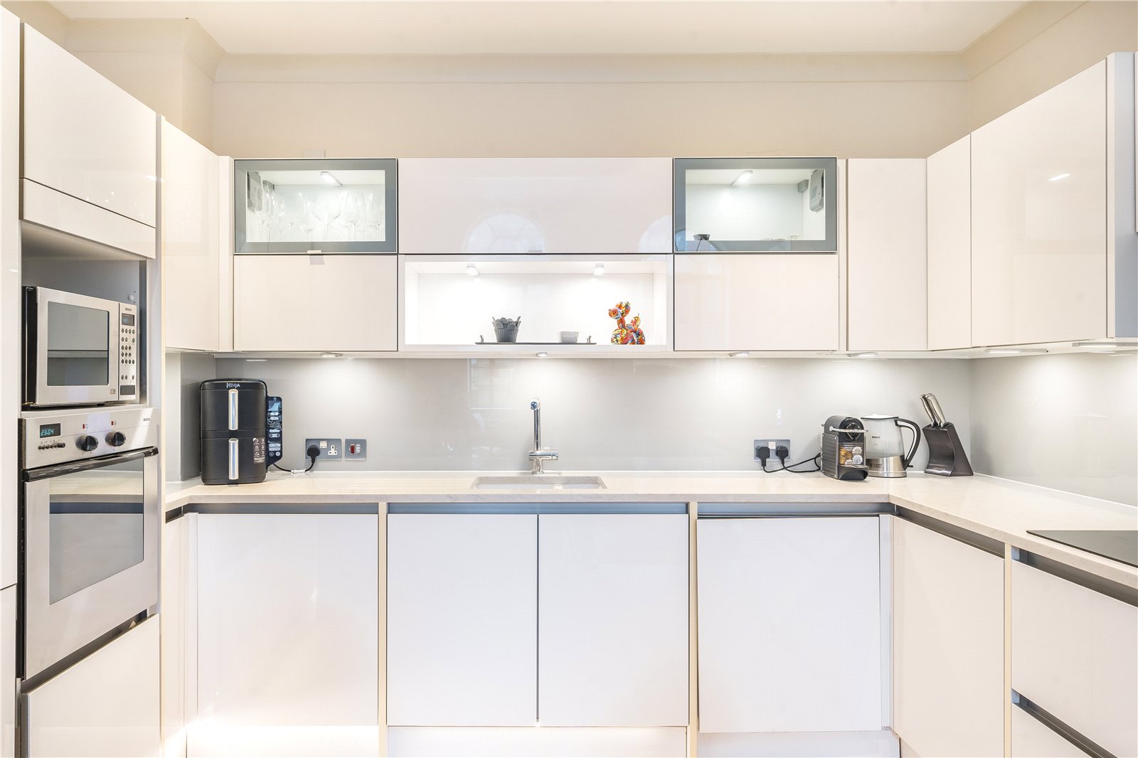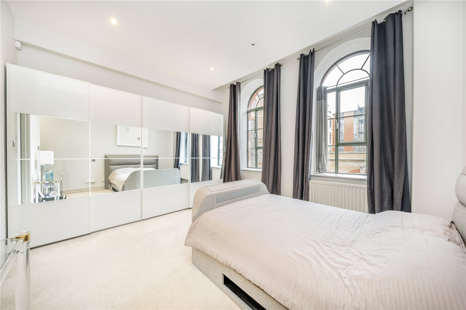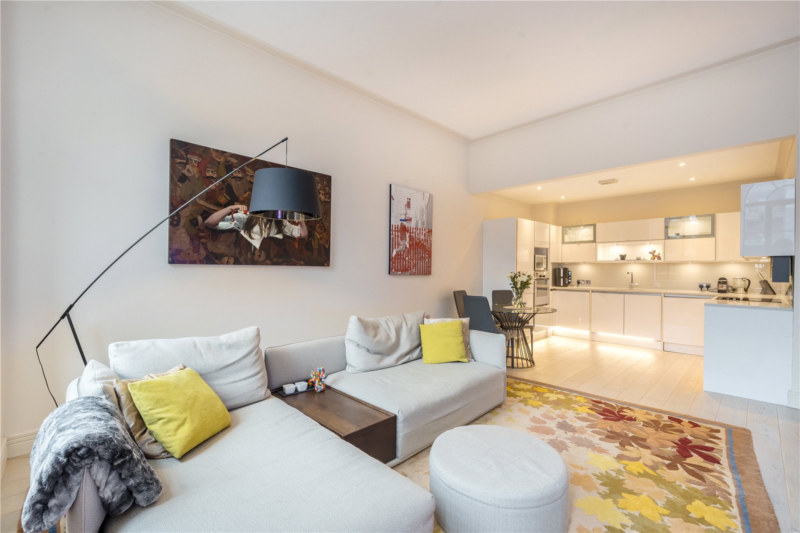 The flat comprises a large open plan reception/dining room offering scenic green views of the communal gardens. The reception space leads into a contemporary kitchen fully equipped with integrated appliances and cabinetry, maximising storage.