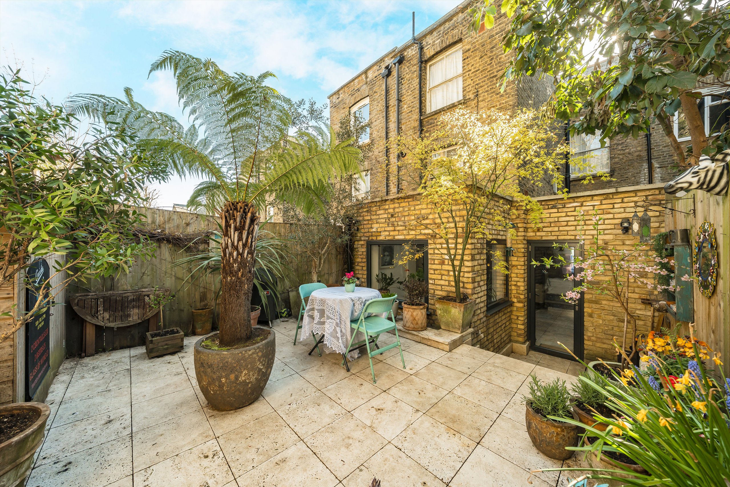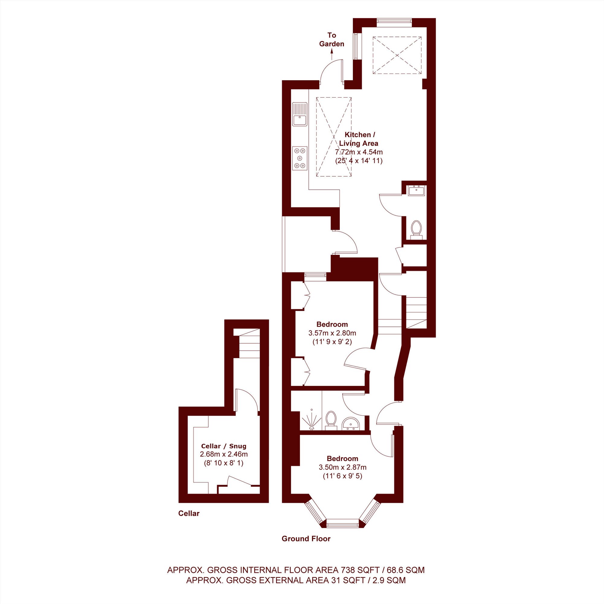 With a stunning interior, the property opens onto a stylish and well arranged open-plan kitchen/reception room with a fitted kitchen, a large seating and dining area, exposed brickwork, two generous double bedrooms and a three piece bathroom with an additional w/c. The property also retains a landscaped rear private garden and a large cellar boasting a snug area.