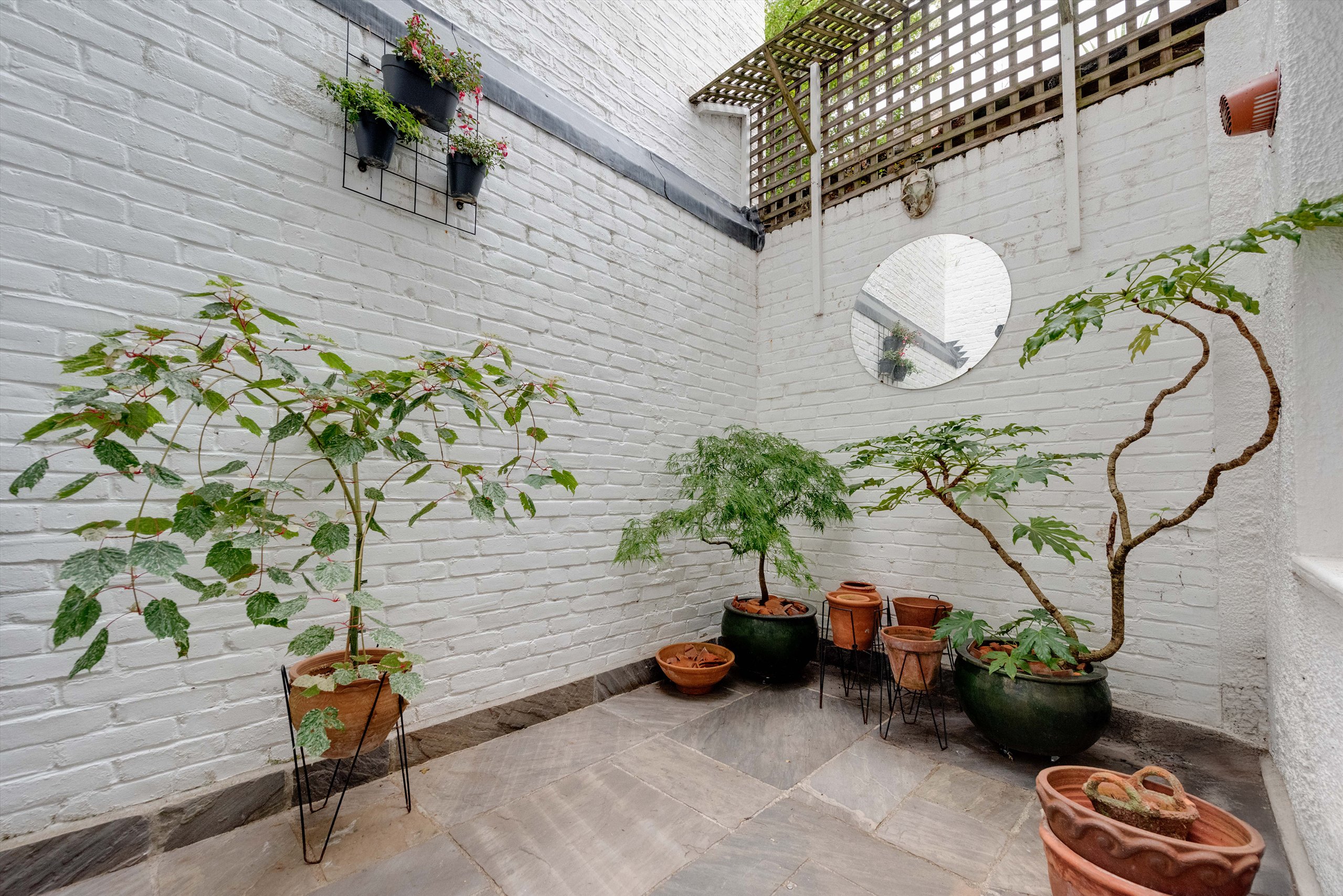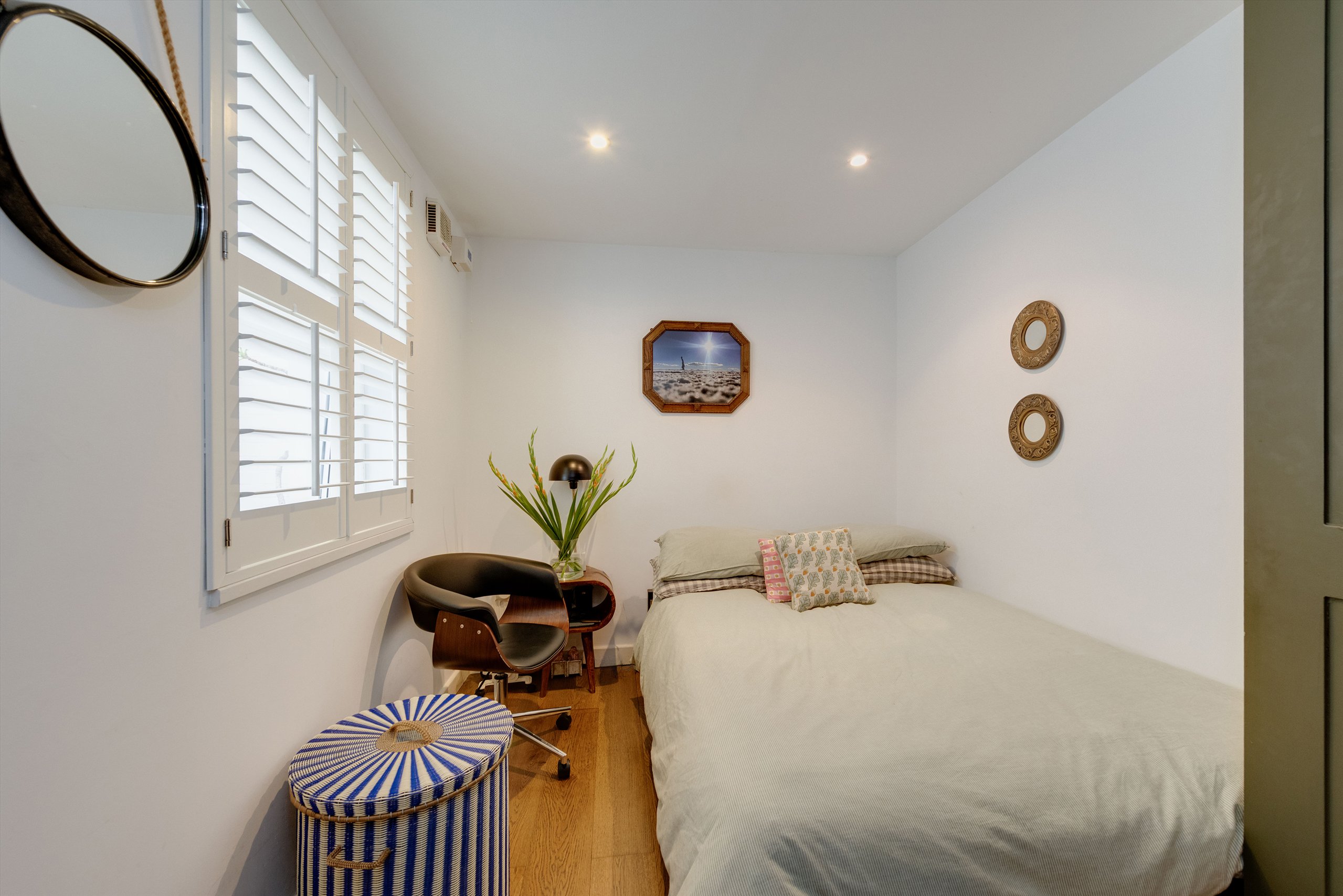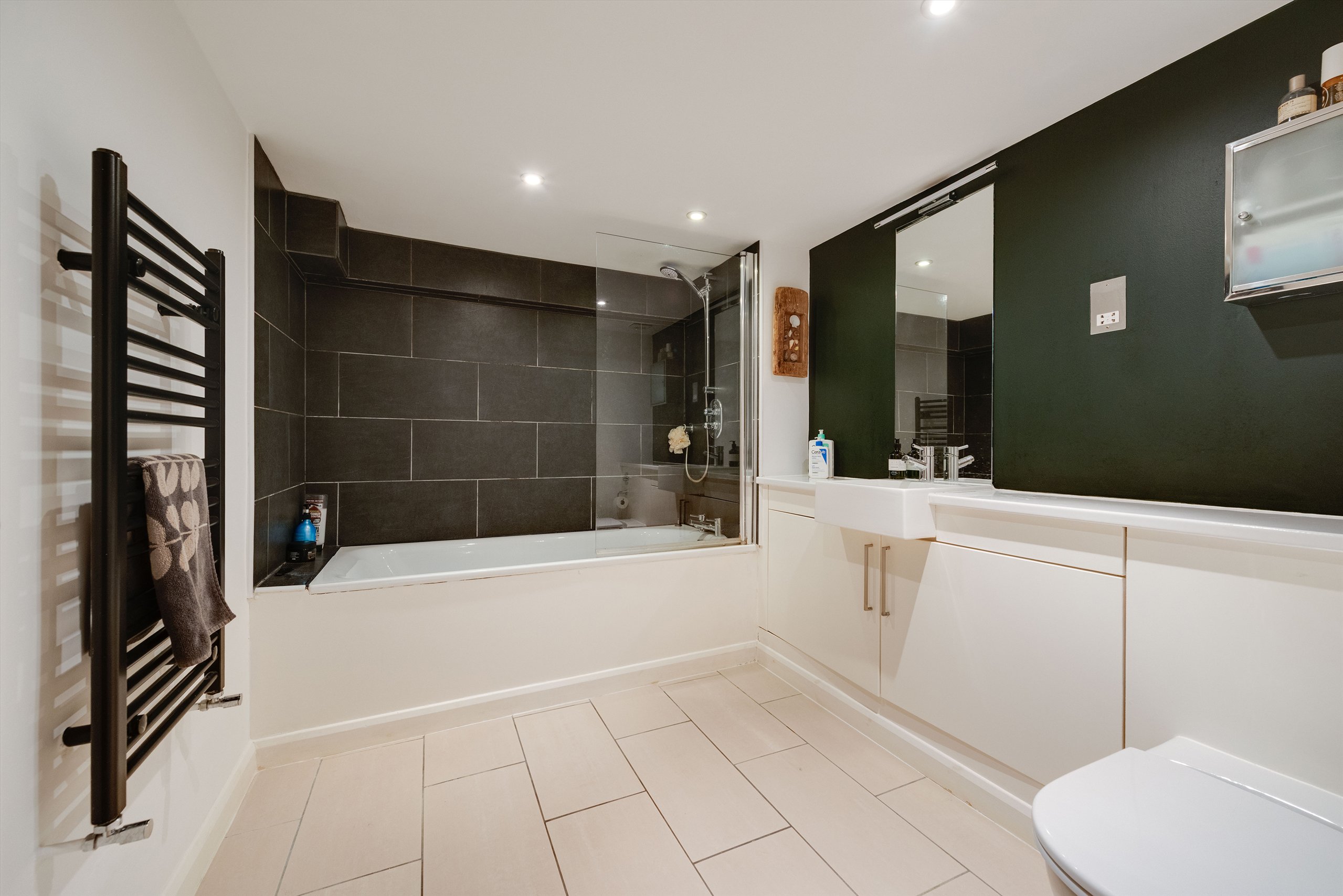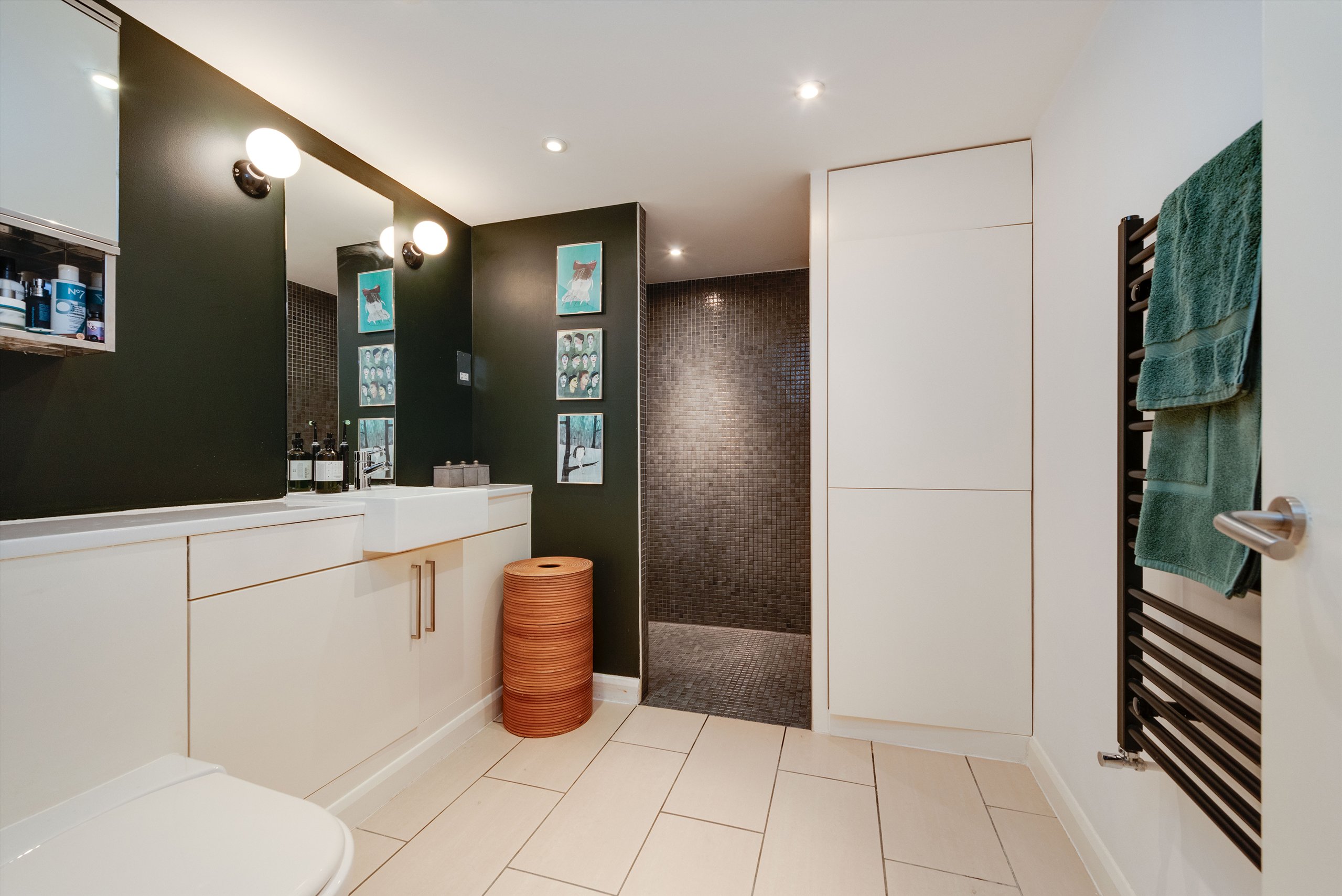 This split-level apartment, set over the ground and lower ground floors of a period conversion in central Camden, features a spacious living room with kitchen/diner, two double bedrooms, two bathrooms, and a private courtyard garden.