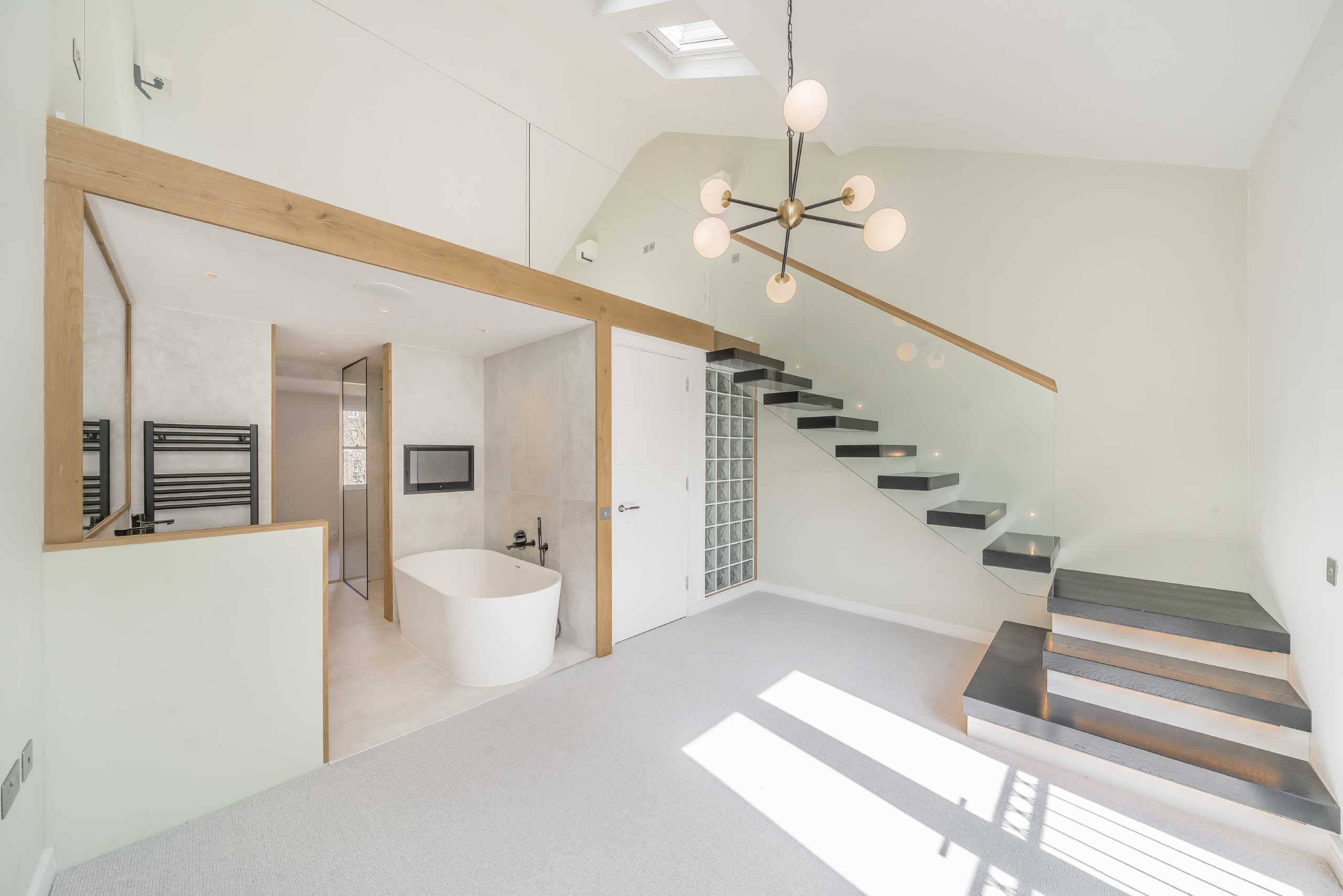 The living spaces are finished with flawless precision, featuring sleek design and premium materials. The current owners have prioritised bright, airy volume throughout. The crowning achievement is the stunning, mezzanine-style principal suite: a true architectural retreat boasting a luxurious en-suite with a freestanding soaking tub and walk-in shower, complete with a charming Juliet balcony overlooking the private garden.