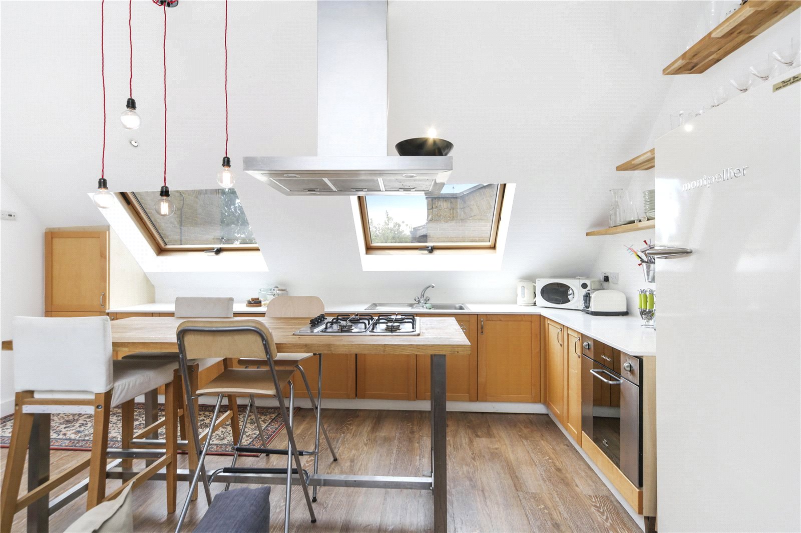 Located on the upper floor of a modern development, this exceptional two-bedroom flat has been completely renovated, and offers a unique open-plan living space with dual-aspect views. The property comprises two double bedrooms and a modern bathroom, which are on a raised level above the impressive kitchen/living area.