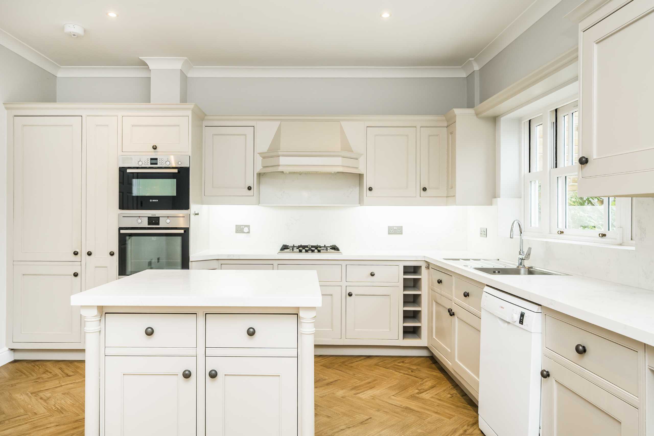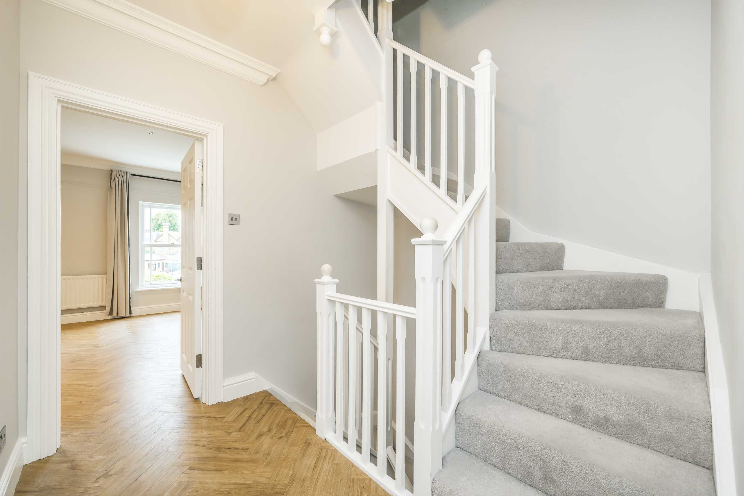 This stylish townhouse, set back from the road, offers off-street parking, an integrated garage, and spacious living over three floors. Decorated in fresh neutrals, it opens into a wide hallway with garage access and a fitted utility room. At the rear, a light-filled kitchen/dining/family room features bespoke units, a large island, and full-height glass doors to a landscaped garden with a circular terrace and mature planting.