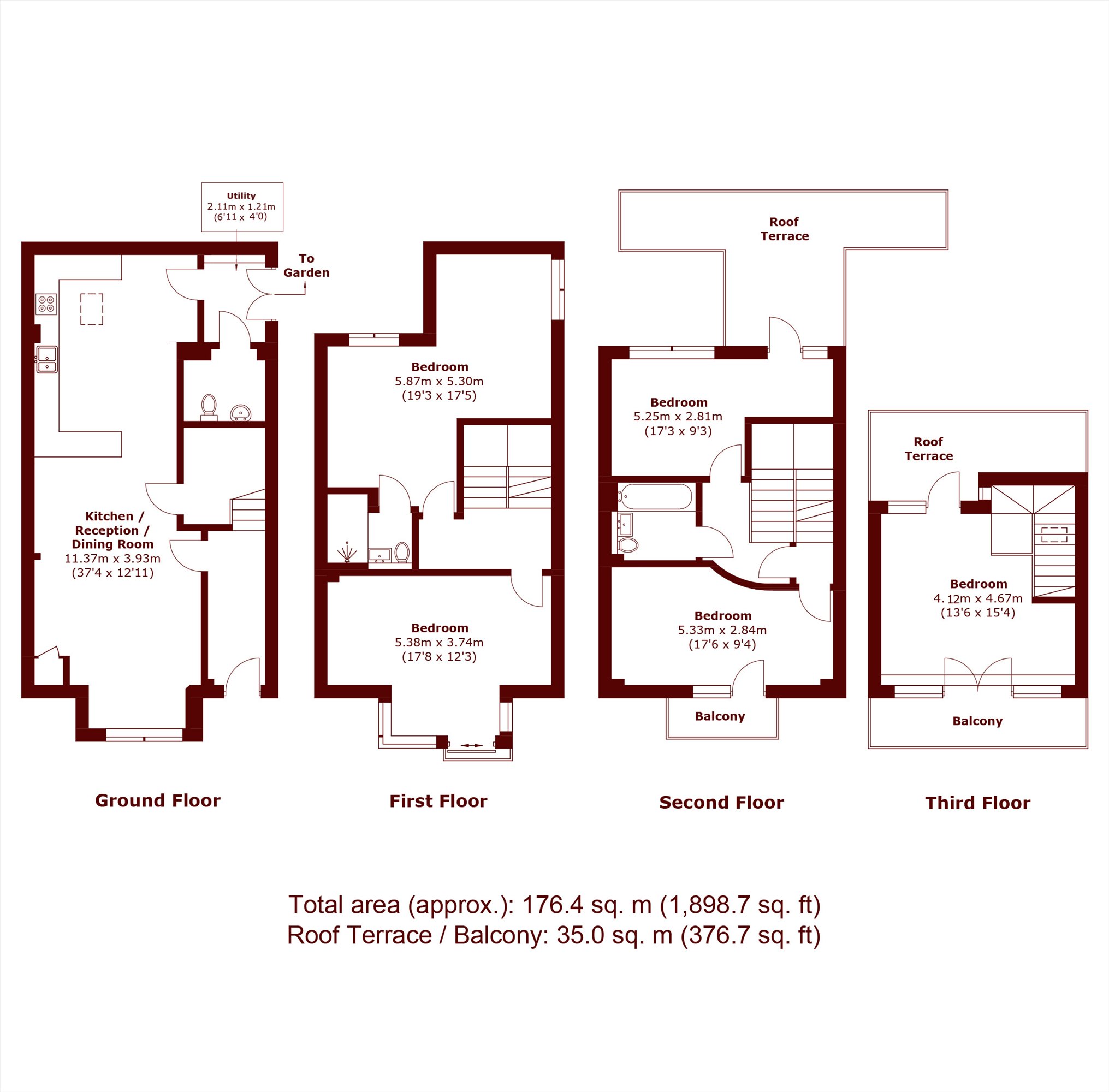 A superb five double bedroom freehold house in impeccable condition arranged over four floors, spanning just shy of 1900 sq ft and boasting multiple balconies and generous roof terraces.