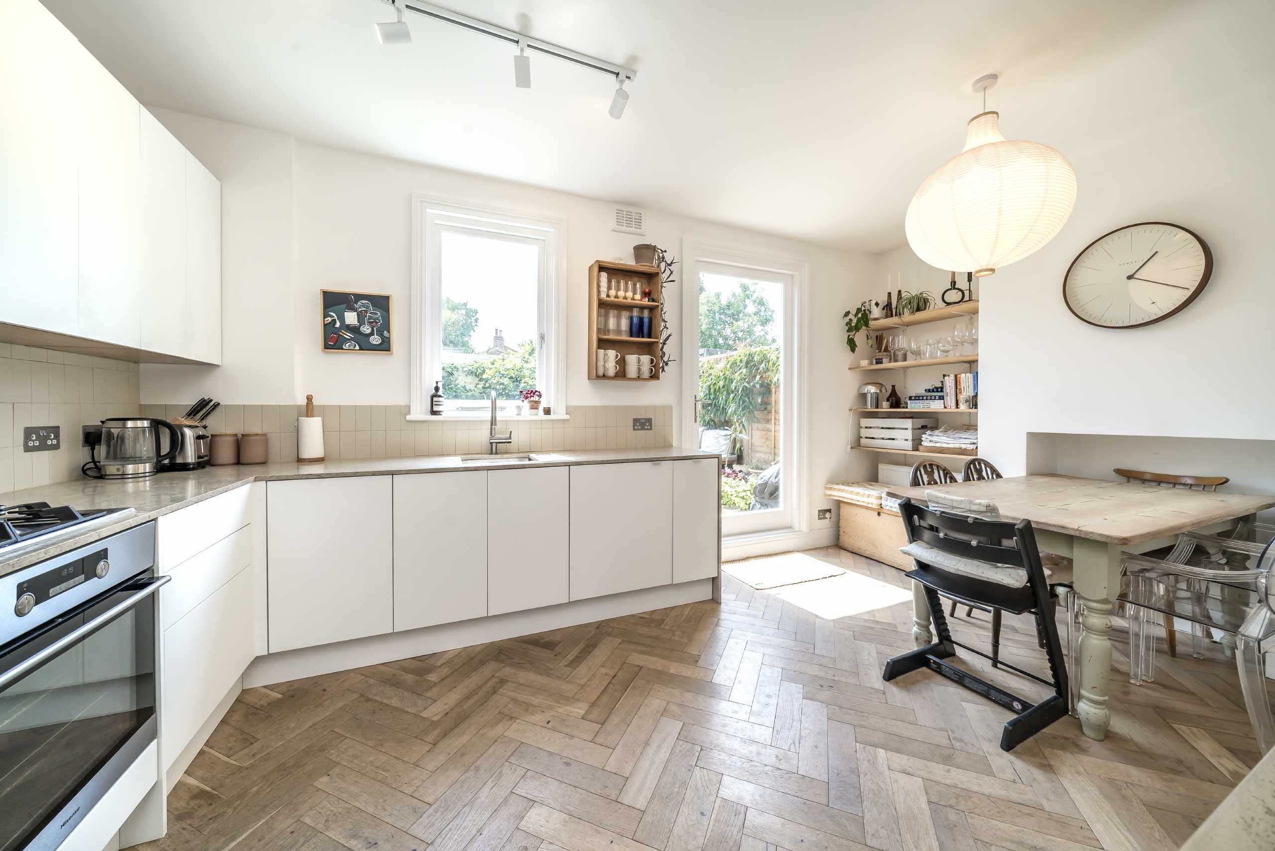 Benefitting from period features such as high ceilings, bay windows and a feature fireplace, this property comes to the market in pristine condition. The ground floor reception room has plenty of natural light due to the large bay window. It also offers built-in shelving and stunning wooden flooring. Double doors lead towards the open plan kitchen/dining area with a fully fitted kitchen and direct access to the neatly landscaped south facing garden. Raised stonework provides additional seating room creating the perfect outdoor dining/entertaining space. Two almost equal size double bedrooms are on the first floor alongside the family bathroom and the master bedroom can be found on the first floor which has skylight windows, a Juliet balcony and an en suite bathroom.