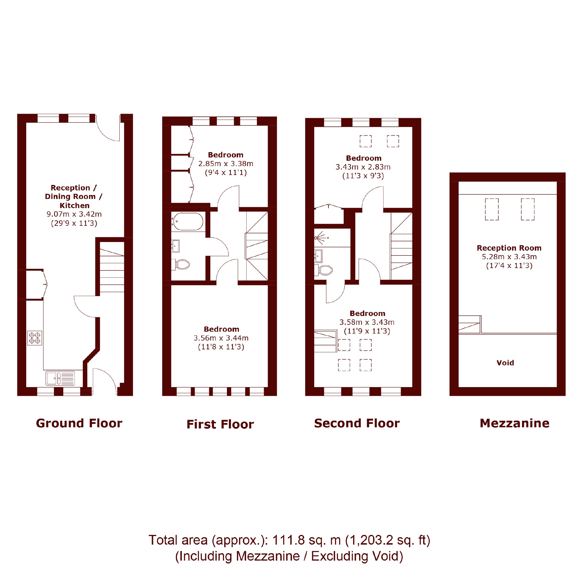 The property features a spacious open-plan kitchen-living-dining area over the ground floor leading directly out to a private garden. The first and second floors hosts four generous double bedrooms and two modern family bathrooms alongside a striking mezzanine level offering further living space perfect as a second lounge, office or studio.