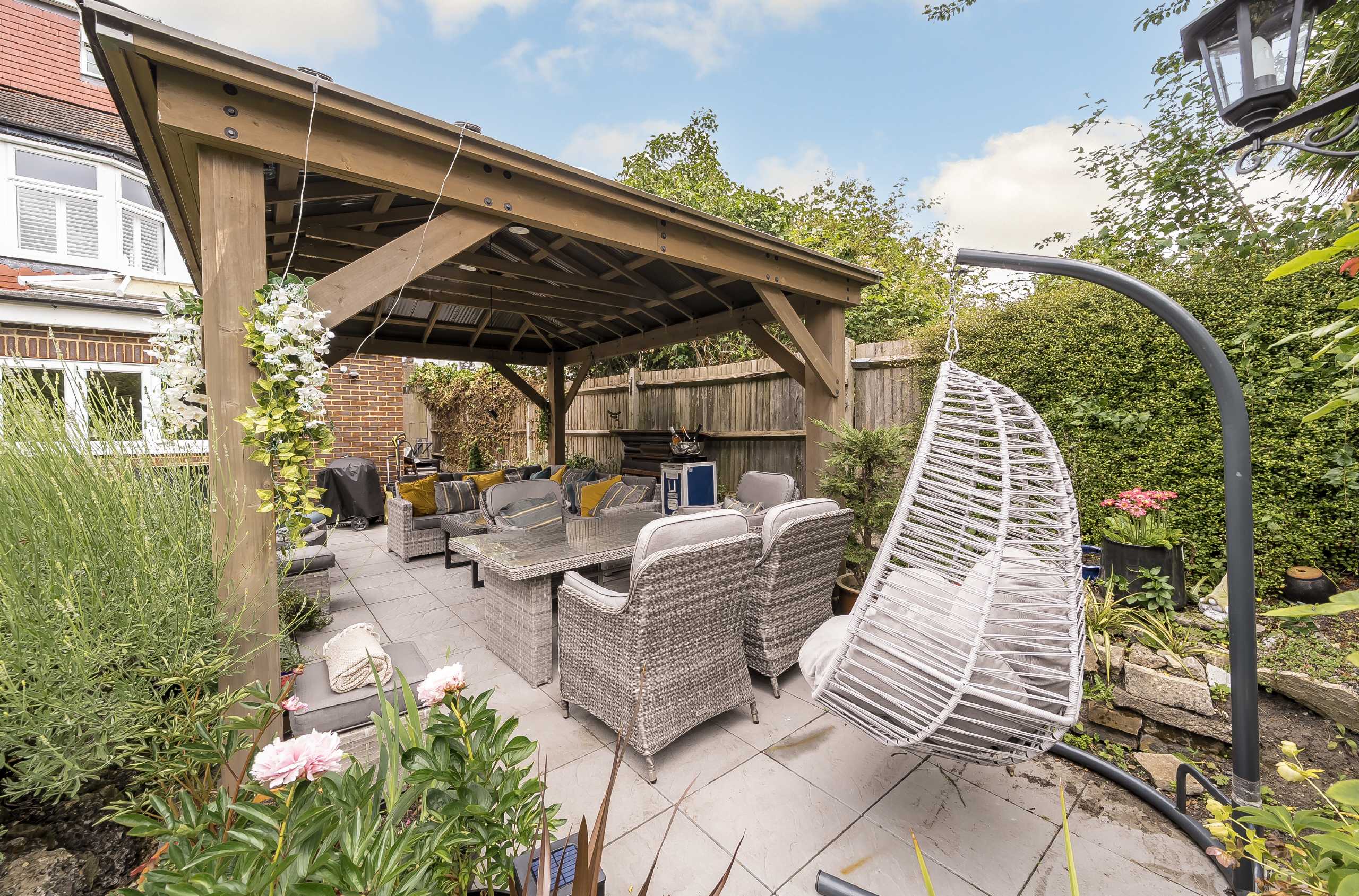 Outside, the beautifully landscaped three-tiered garden is a standout feature, offering a mix of lawn, seating, and entertaining areas. With covered outdoor seating, it provides year-round versatility.