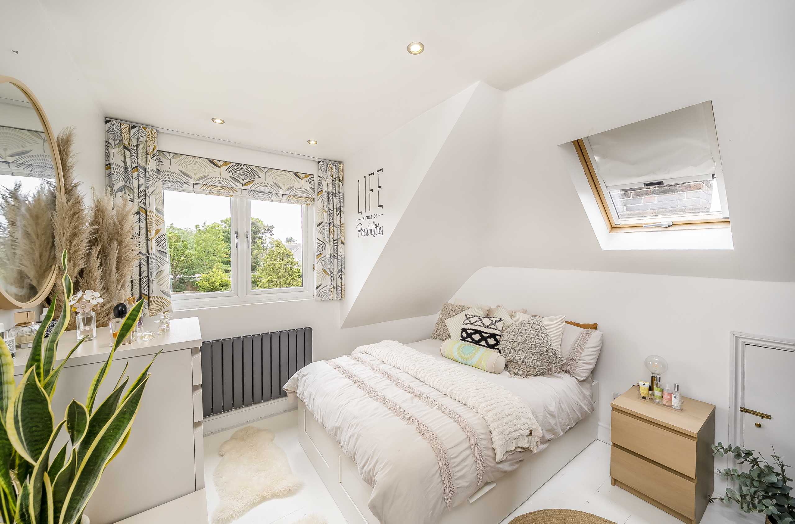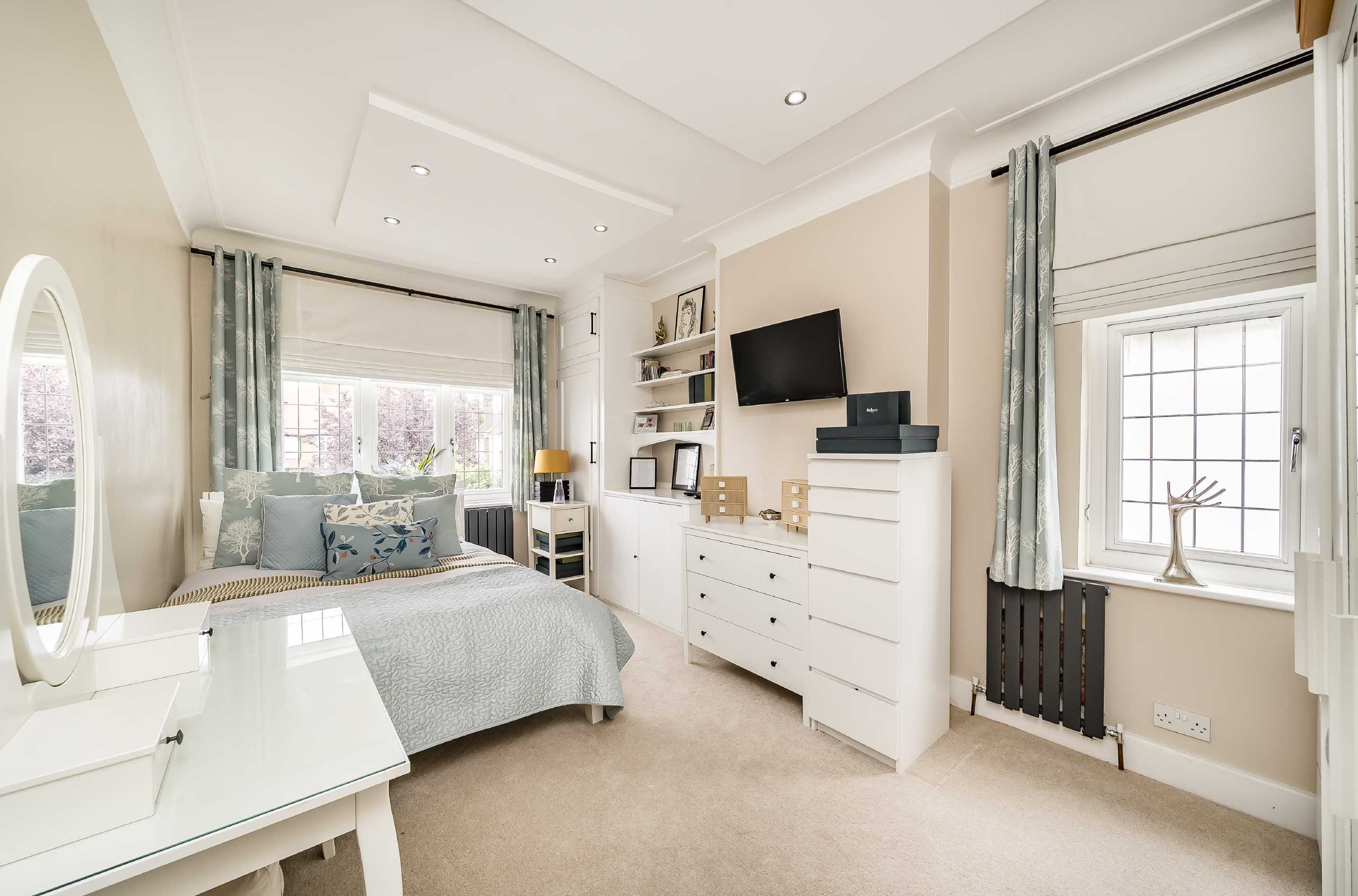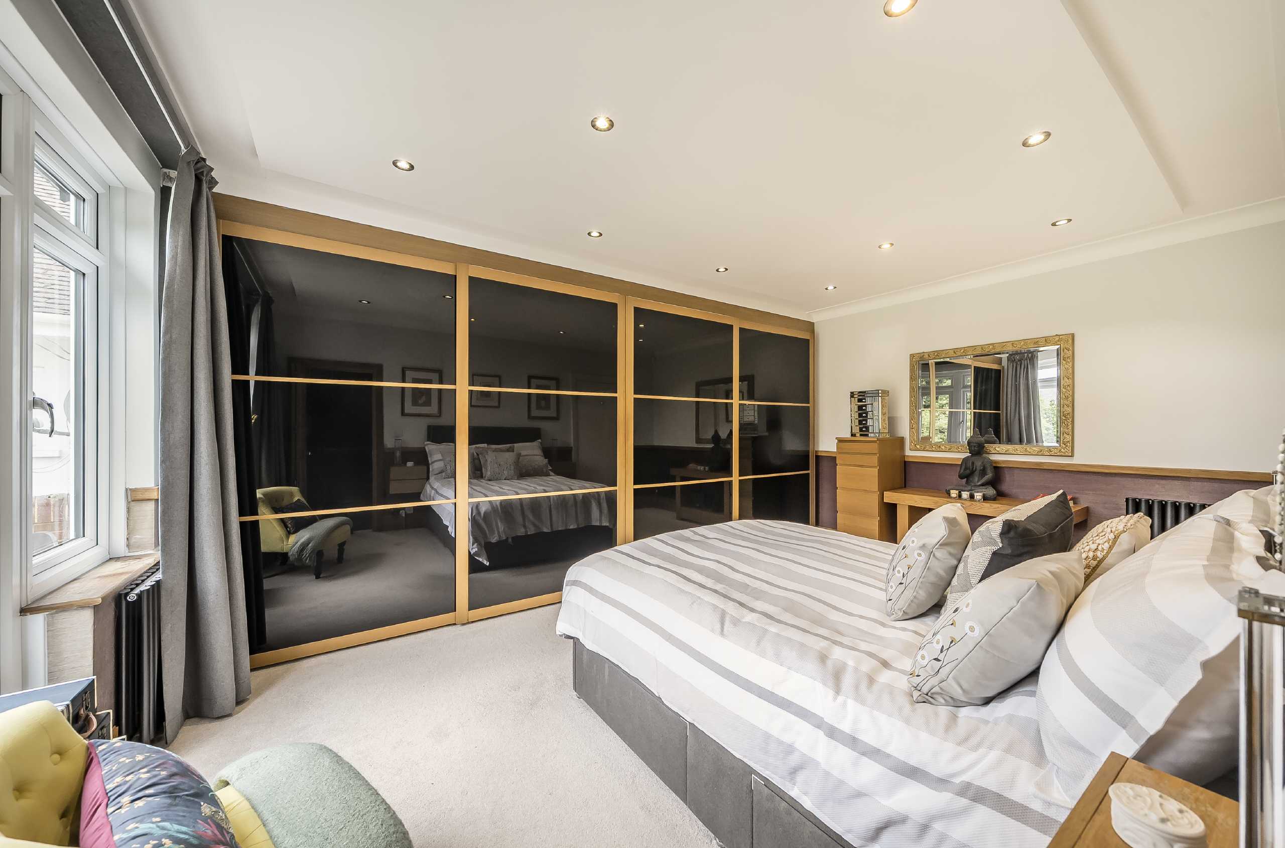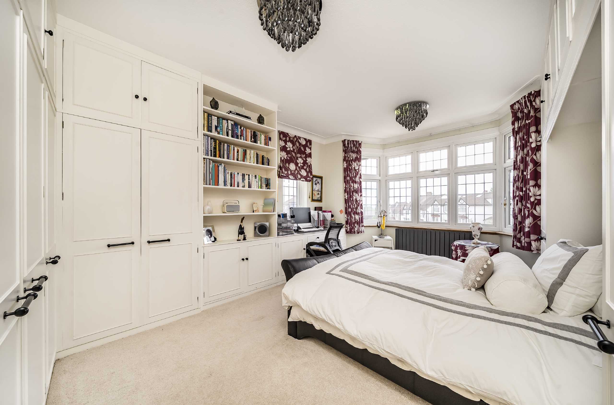 Upstairs on the first floor, the standout master bedroom is a true retreat, complete with built-in wardrobes and a luxurious en-suite bathroom with both a walk-in shower and a bath. The adjacent bedroom benefits from a charming bay window and built-in storage, while two further bedrooms and a well-appointed family bathroom complete the floor.