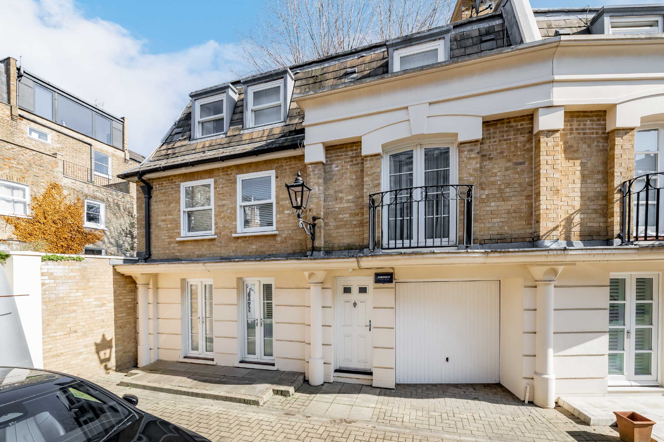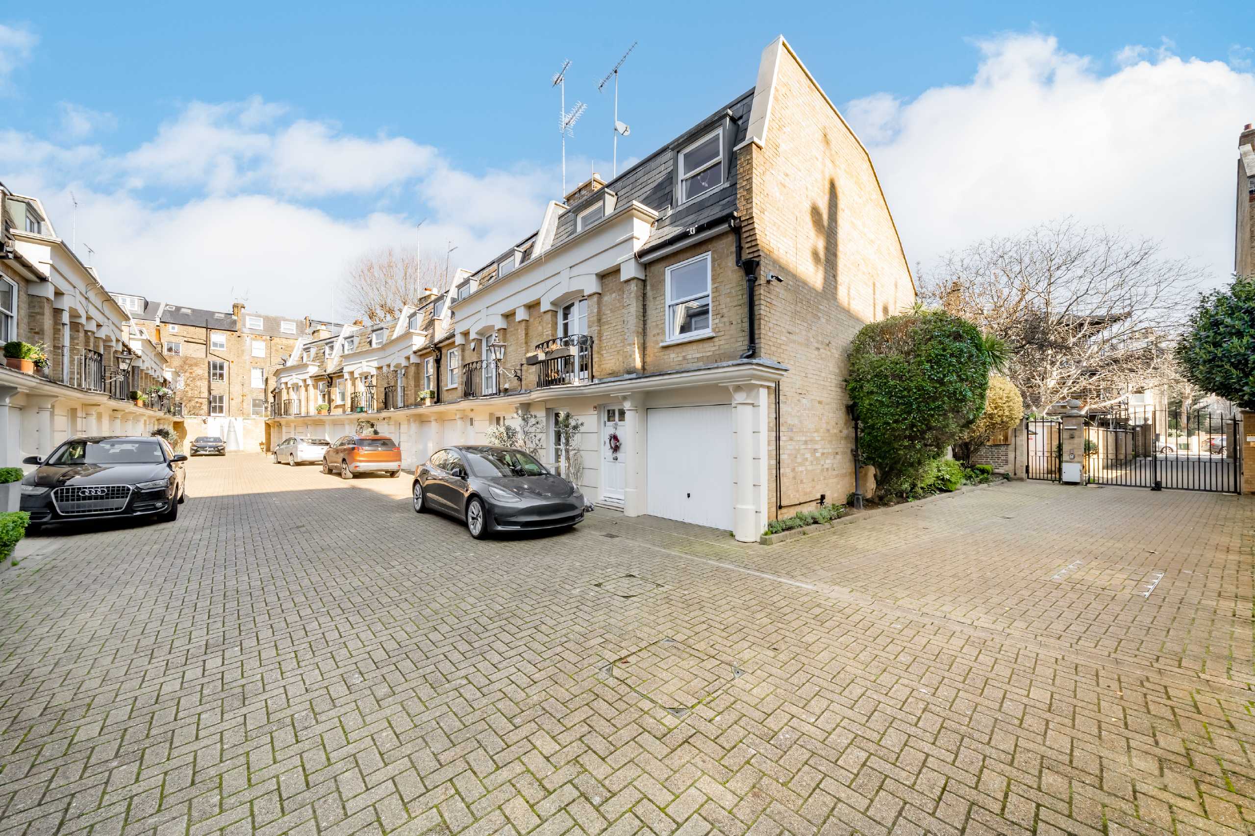 A rare opportunity to purchase a four bedroom terraced house set within a secure gated mews, arranged over three floors and offering a flexible layout. The ground floor features a generous reception or bedroom with French doors, a stylish kitchen/diner, guest WC and useful storage, while the first floor provides a bright reception room, family bathroom and two bedrooms. The top floor is dedicated to an impressive principal suite with en suite, built-in wardrobes and eaves storage.