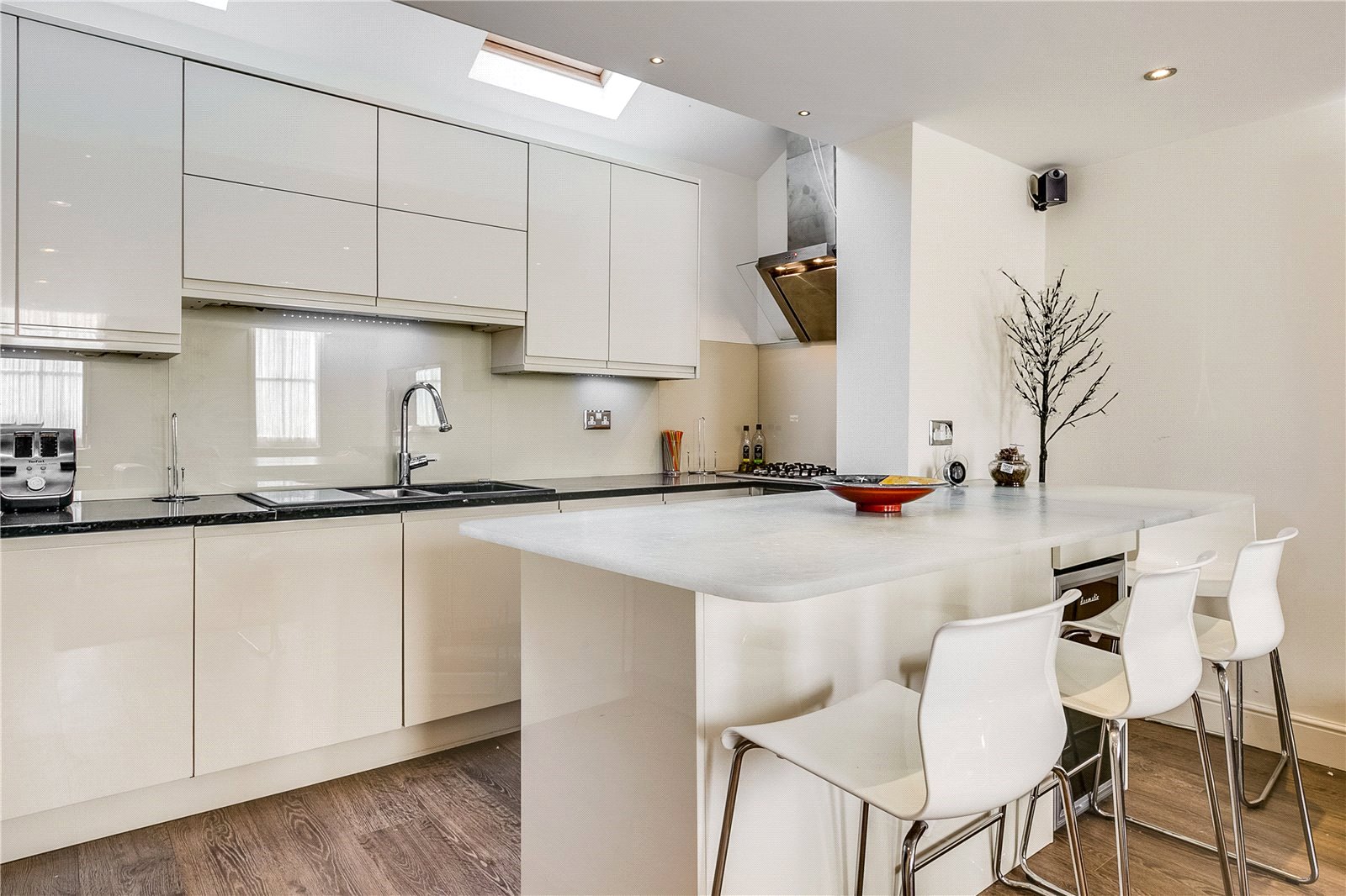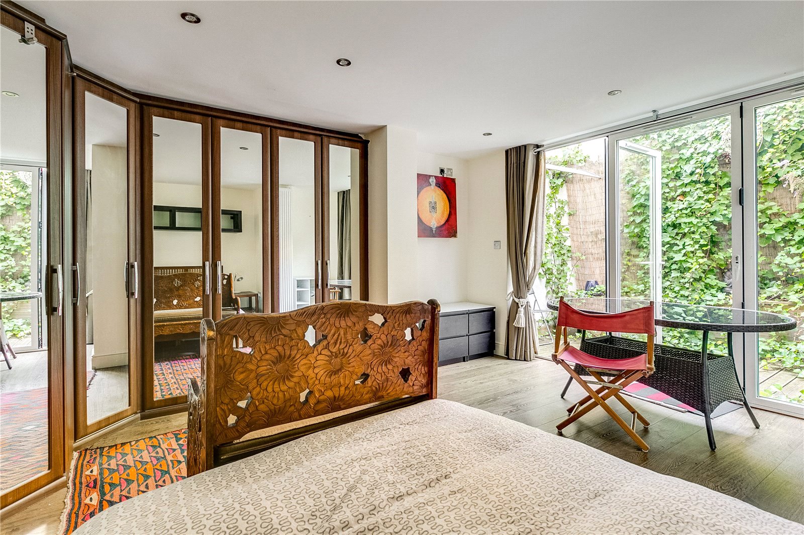 Nestled within a pleasant, cobbled mews, this two-bedroom/two-bathroom mews house is presented with modern interiors and benefits from a private patio garden and an allocated parking space within the mews. Arranged over three floors the large property comprises an inviting hallway with extensive storage leading to a stylish family bathroom and a large bedroom with fitted wardrobes and patio doors leading to the private patio garden, all on the ground floor. Stairs lead to a large reception room with an open plan and fully fitted kitchen with a breakfast bar and skylights to promote light. The top floor provides a large principal bedroom with en suite shower room and extensive storage. Hardwood flooring extends throughout the property which benefits from an intelligent design to maximise the use of space.