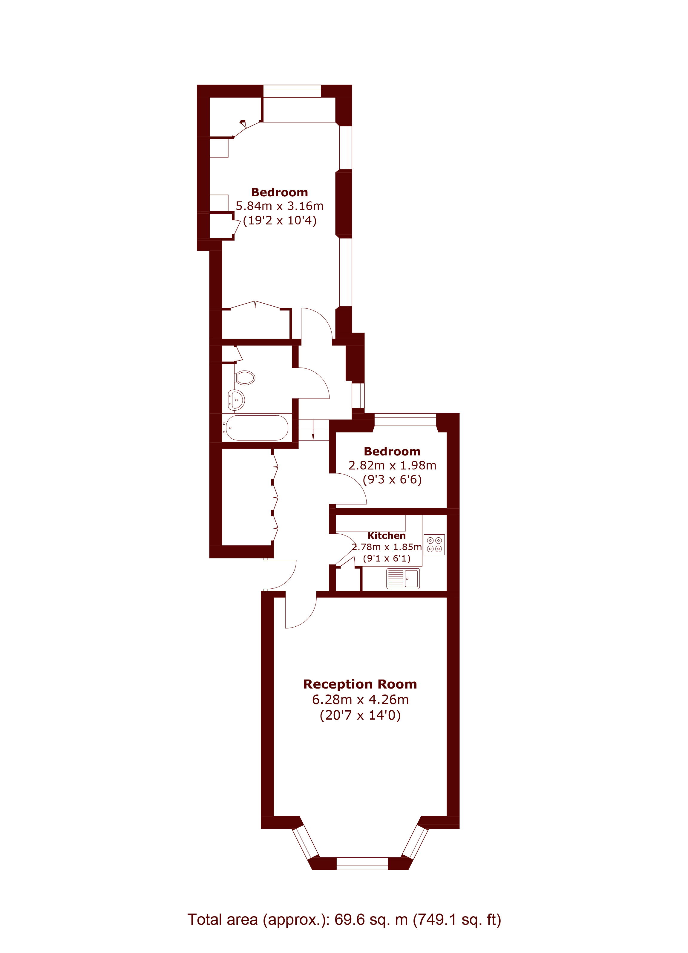 A two-bedroom raised ground floor Victorian conversion featuring high ceilings, long lease, excellent storage, neutral décor, bright bay-windowed reception/dining room, modern kitchen, spacious dual-aspect main bedroom, and contemporary bathroom.