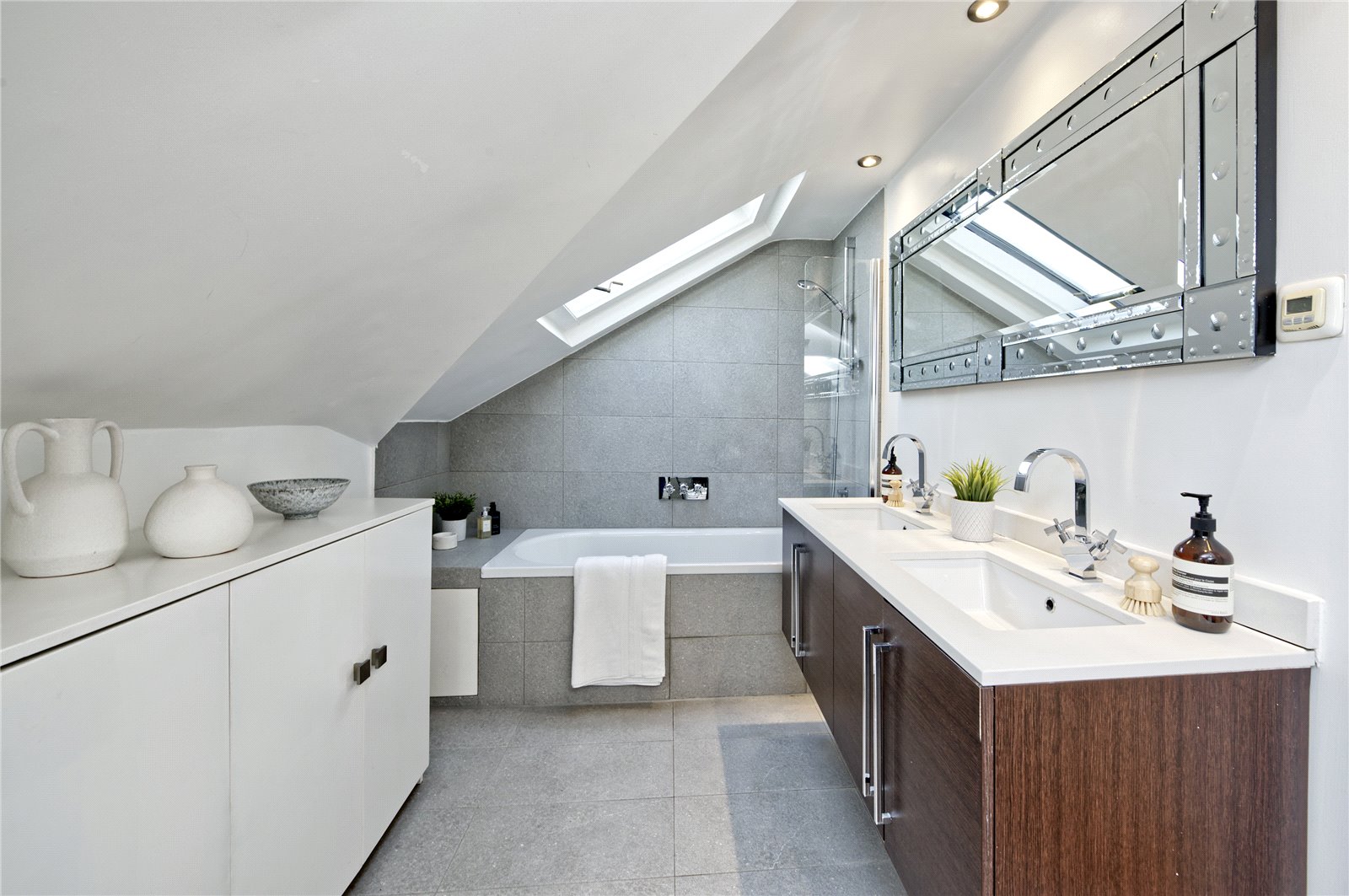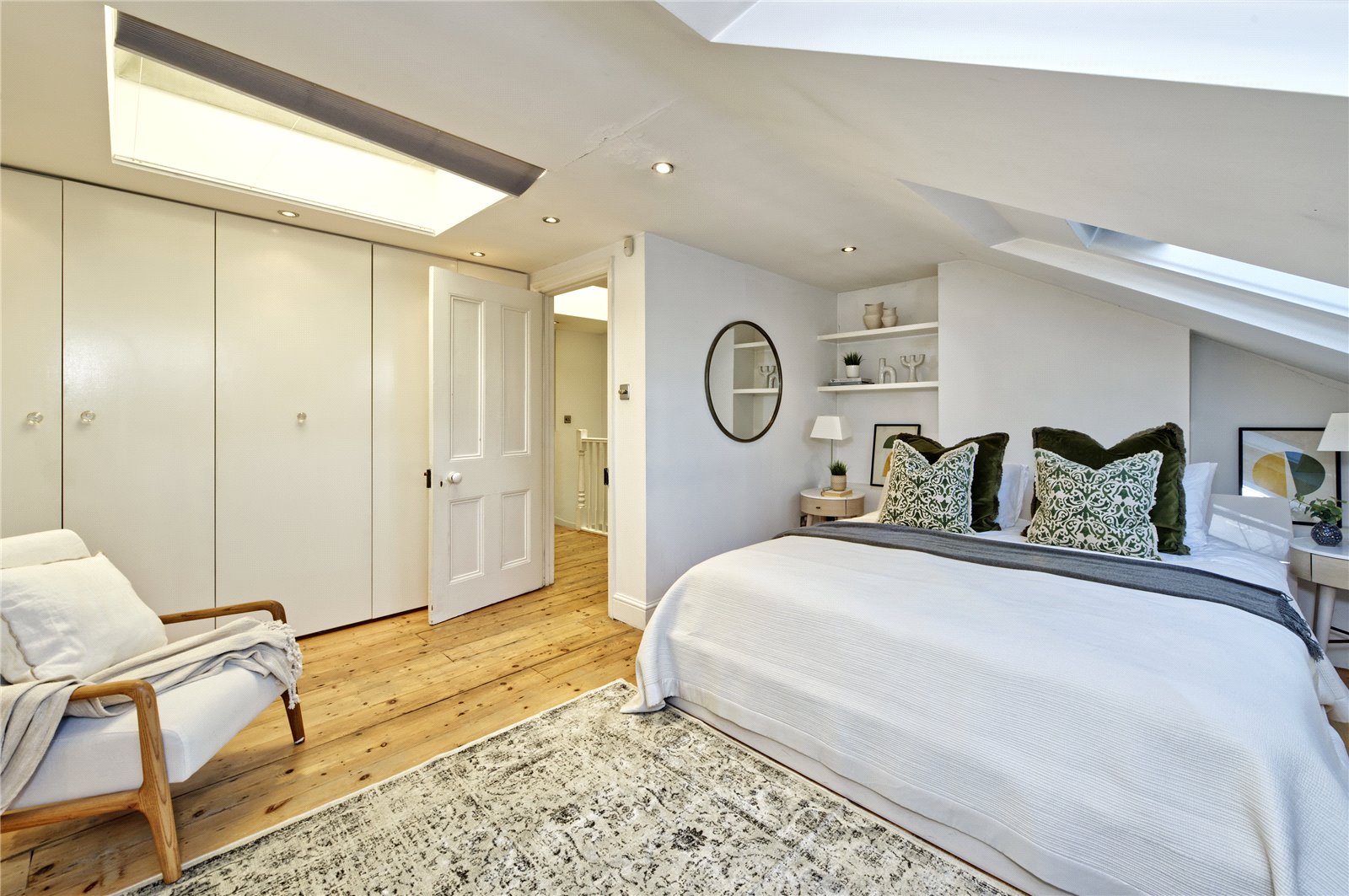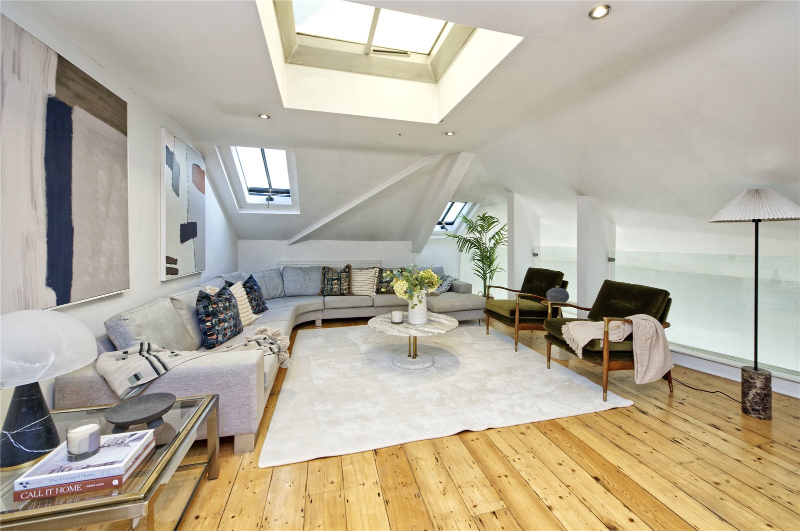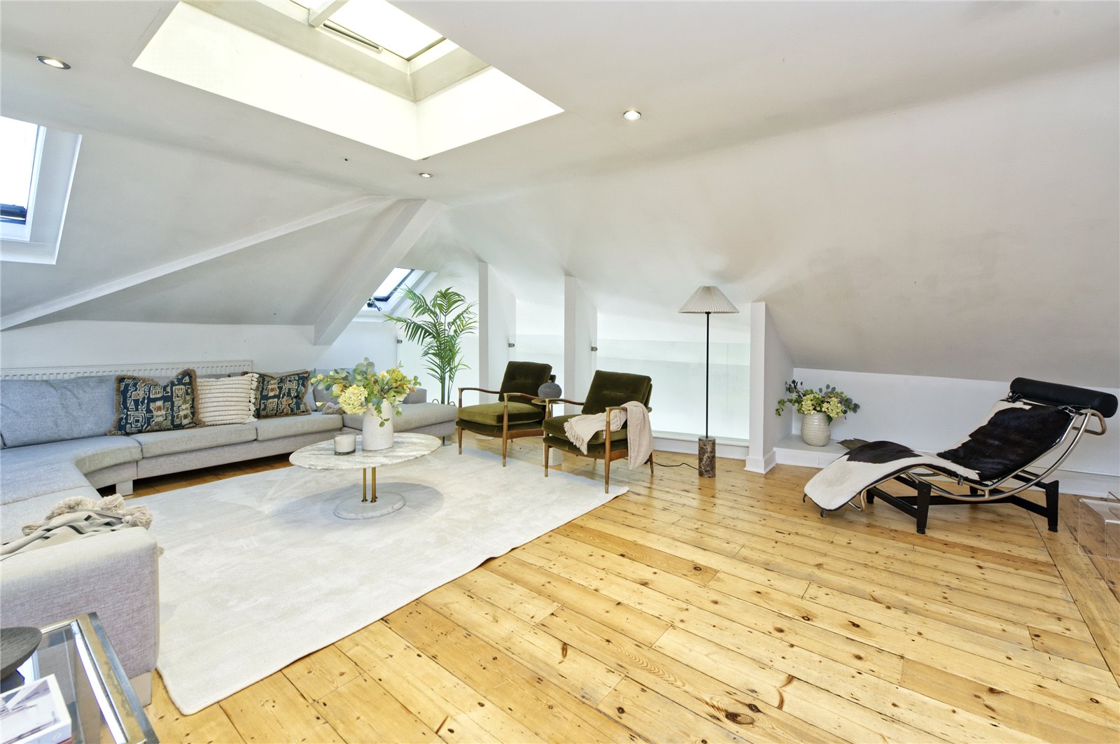 The property is configured over the second and third floors of this most attractive period building and offers fantastic flexible accommodation. The second floor comprises excellent open plan dining space which includes a contemporary designed, fully integrated kitchen with a bright southerly aspect, three bedrooms, including a study and a smartly finished bathroom. The upper floor features superb additional reception space, another large double bedroom and an additional en-suite bathroom with a bath.
