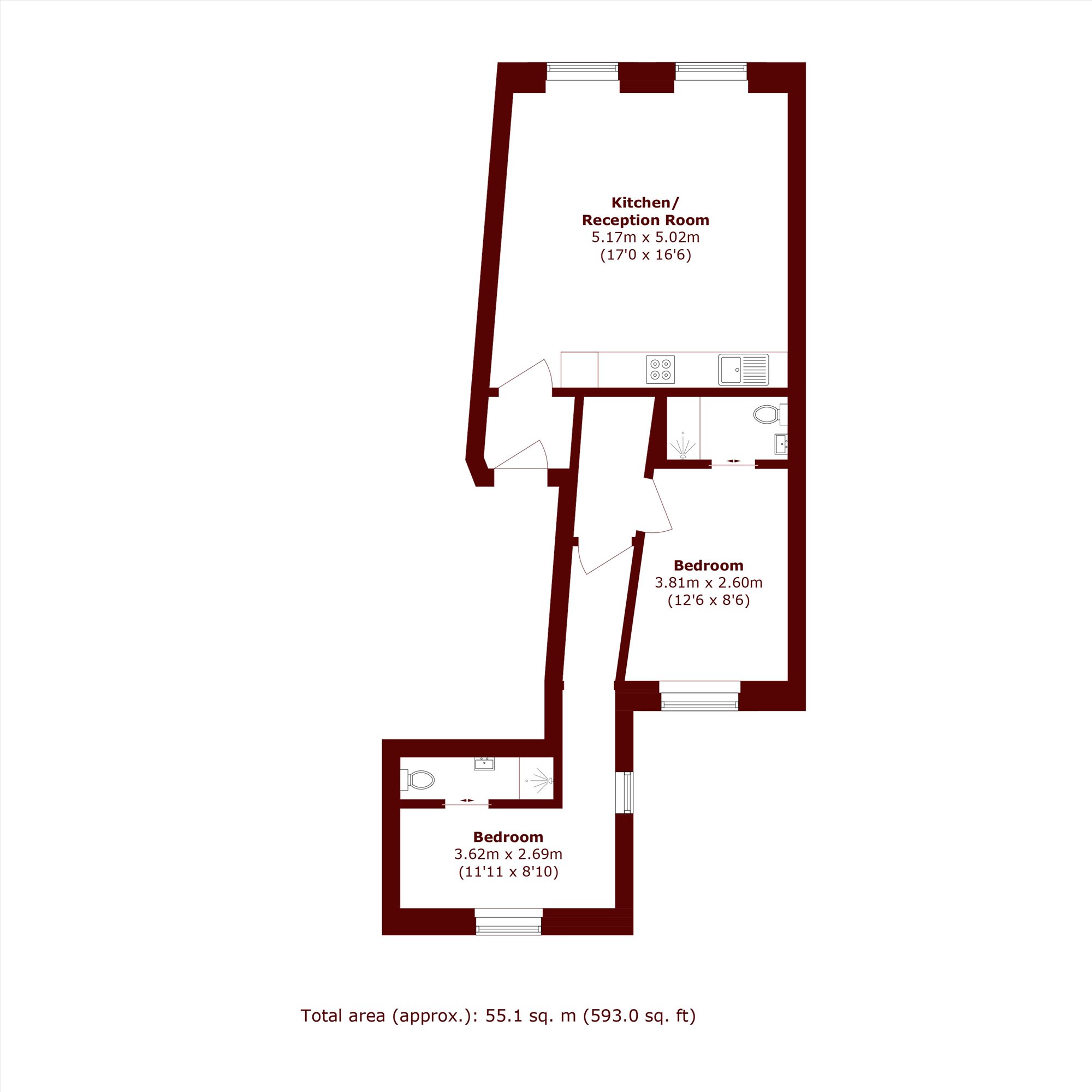 A beautifully refurbished first-floor apartment featuring two equally sized double bedrooms, each with its own modern en suite shower room. The property offers a large open-plan, fully fitted kitchen and reception area, complemented by wooden floors throughout and a high-quality neutral finish.