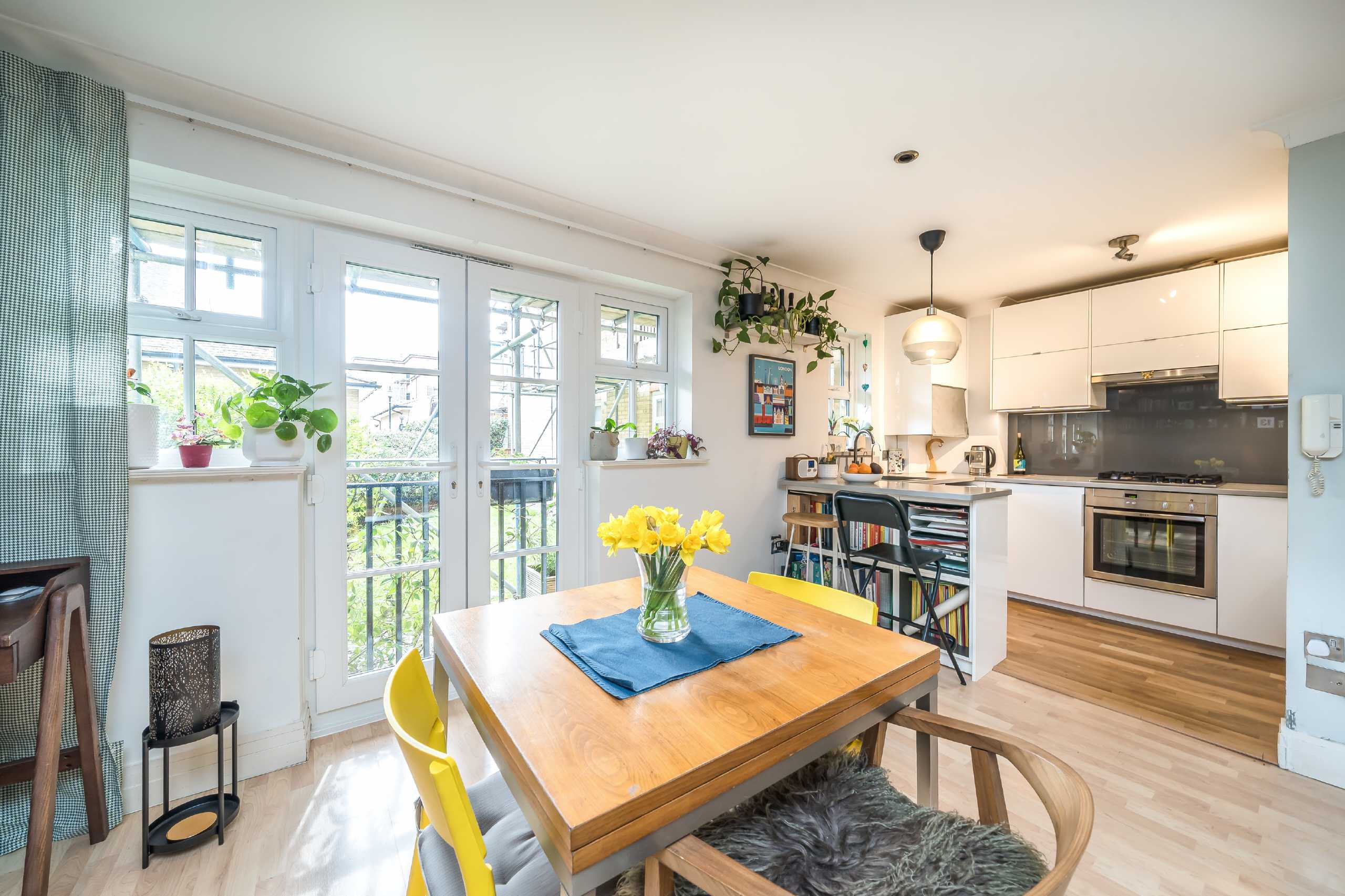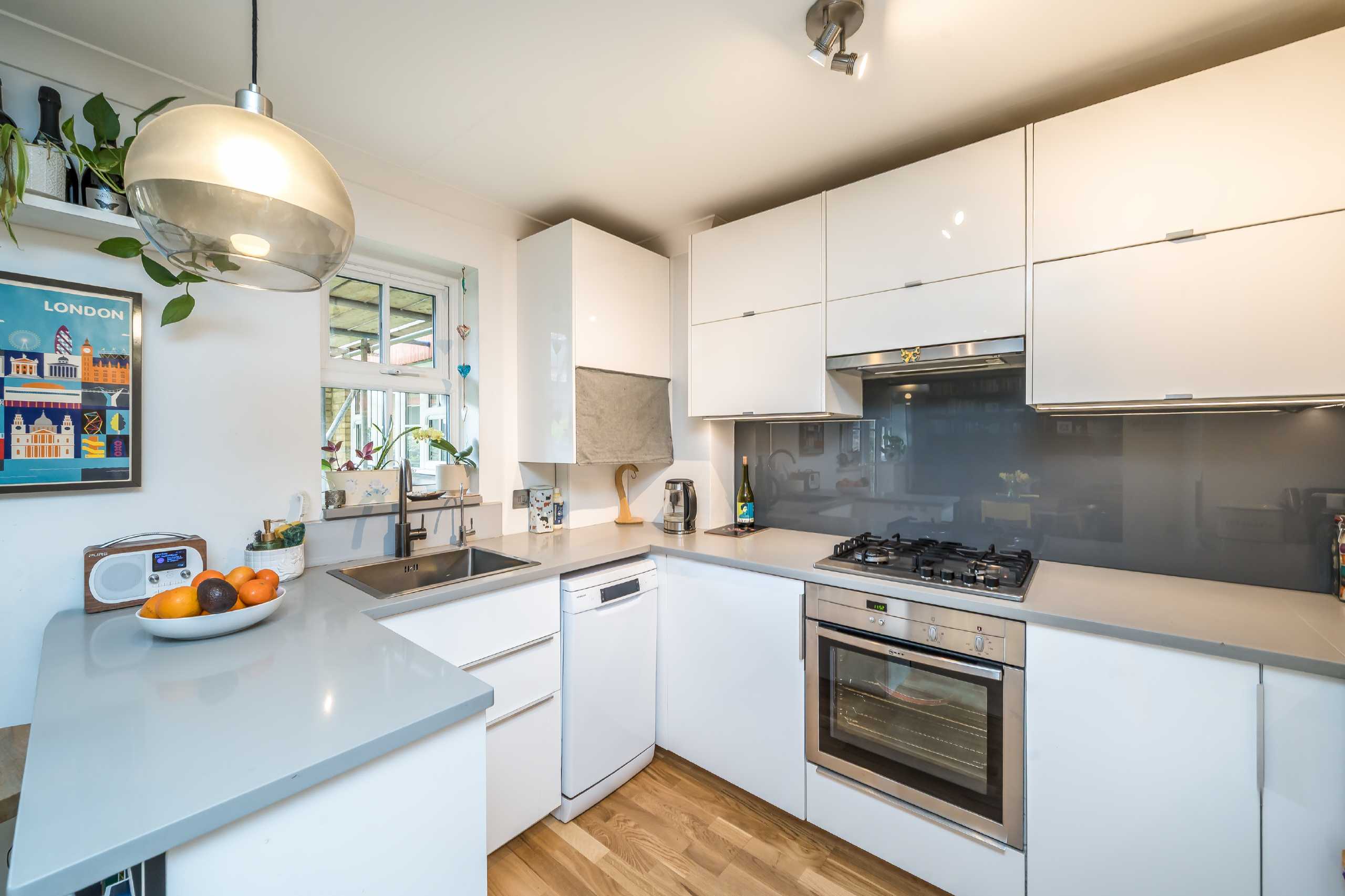 The kitchen is well-equipped with ample storage and worktop space, seamlessly connecting to the living area which benefits from multiple windows and french doors overlooking a charming communal garden. The property features two bedrooms, including a generous principal bedroom with en-suite shower room. A contemporary family bathroom is conveniently positioned off the hallway, while additional storage enhances everyday practicality. The property also benefits from a private of-street parking space.