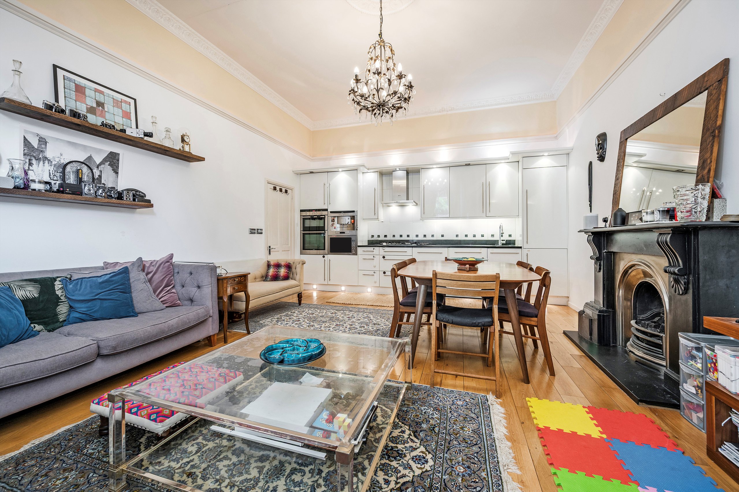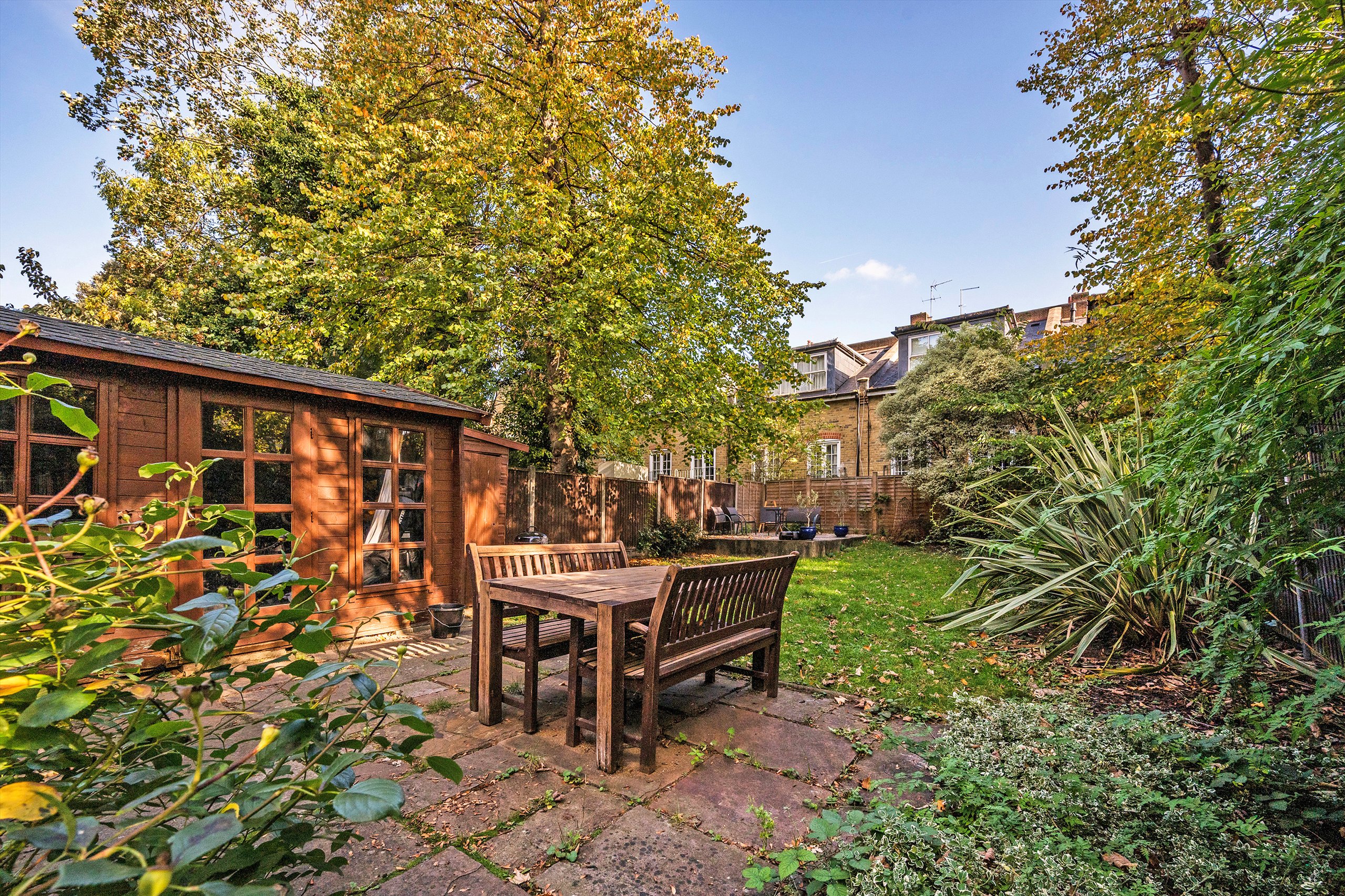 This lovely bright raised ground floor flat has many special features including excellent floor to ceiling height, large bay window and direct access to a spacious private garden with a pretty summer house (which would make an ideal home office/gym). The accommodation includes an open plan kitchen/reception room with exceptionally high ceilings, two evenly sized double bedrooms one with an en-suite, a family bathroom with a built in steam room and mezzanine study area with access to extra storage.