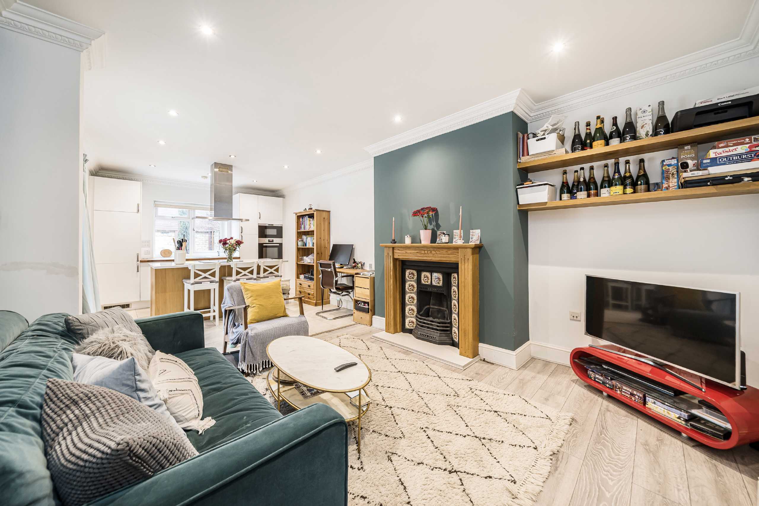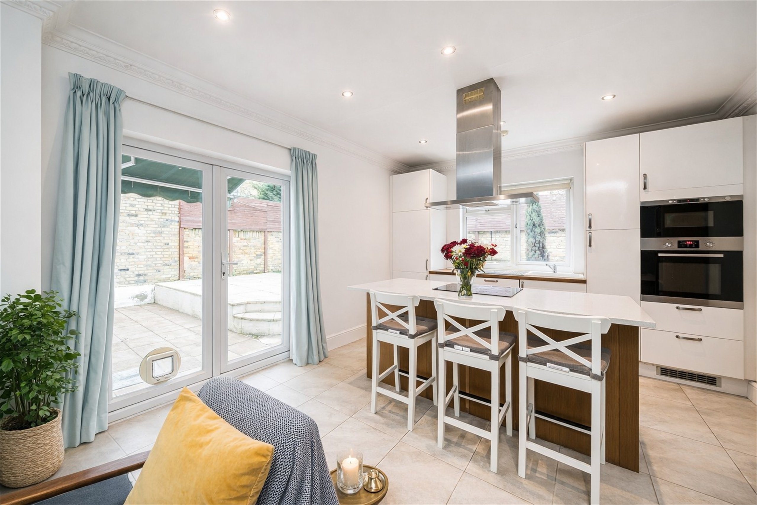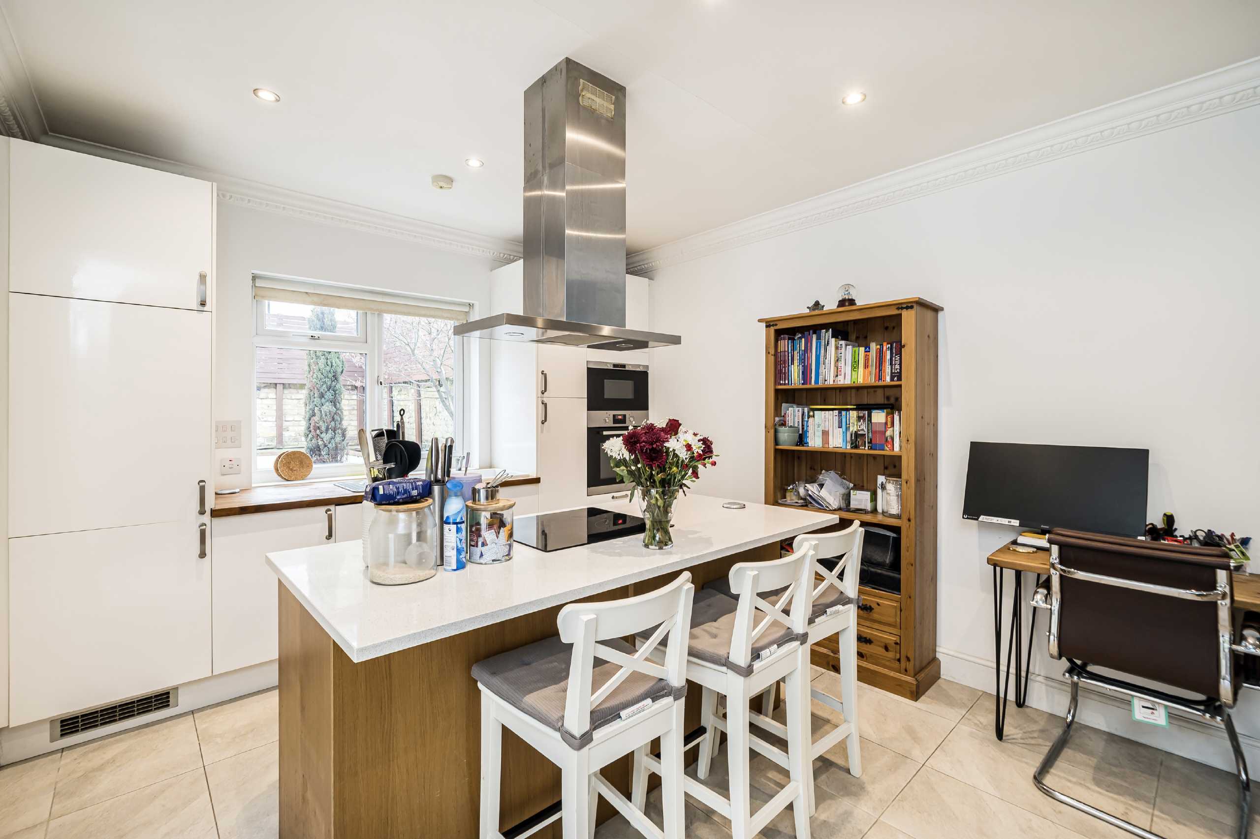 The rear of the property opens into the spacious open-plan kitchen reception room. The kitchen itself benefits from quality integrated appliances, and a stylish central island. The space bodes well for everyday living and entertaining. French doors open out to the exceptional garden.