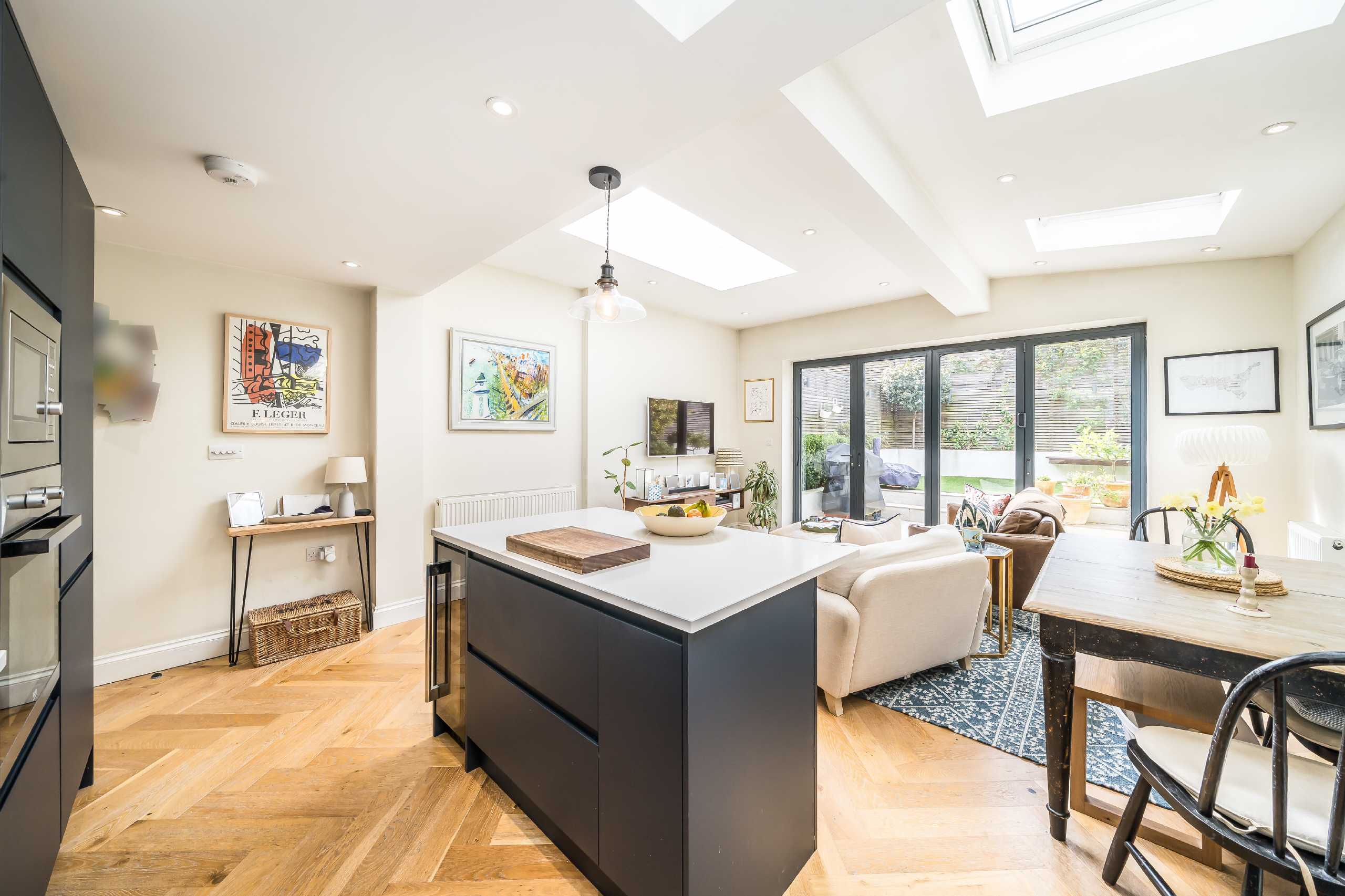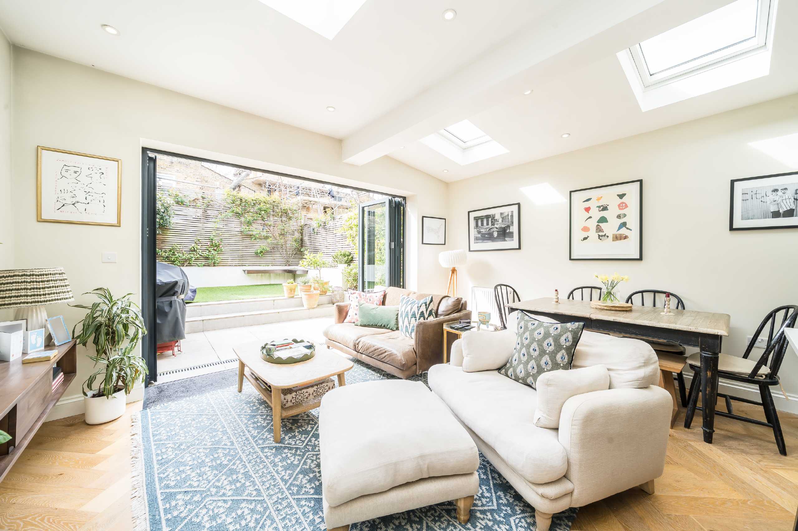 An impeccable two bedroom ground floor garden flat set within an impressive period conversion, boasting a superb open-plan kitchen reception room with solid herringbone floors, a bespoke fitted kitchen with integrated appliances, solid worktops and floor to ceiling bi-folding doors leading to a landscaped south-west facing garden. Two well proportioned bedrooms are located to the front of the property both offering built-in cabinetry complimented by a modern family bathroom. The property further benefits from a share of the freehold.
