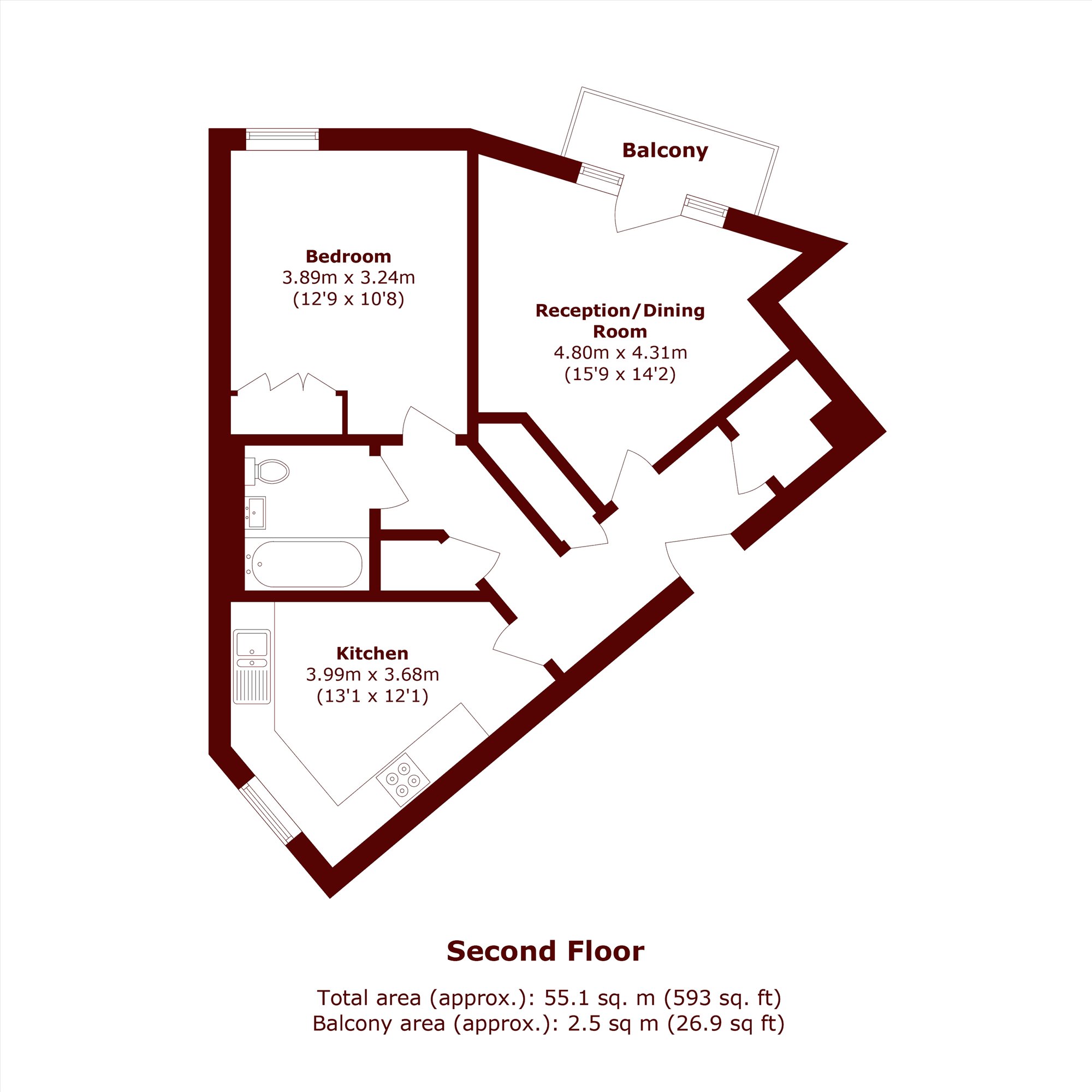 The property offers well-balanced and spacious accommodation, comprising a large double bedroom with built-in storage, a contemporary bathroom featuring both a bathtub and overhead shower, a fully fitted eat-in kitchen, and a separate reception room with direct access to a private balcony.