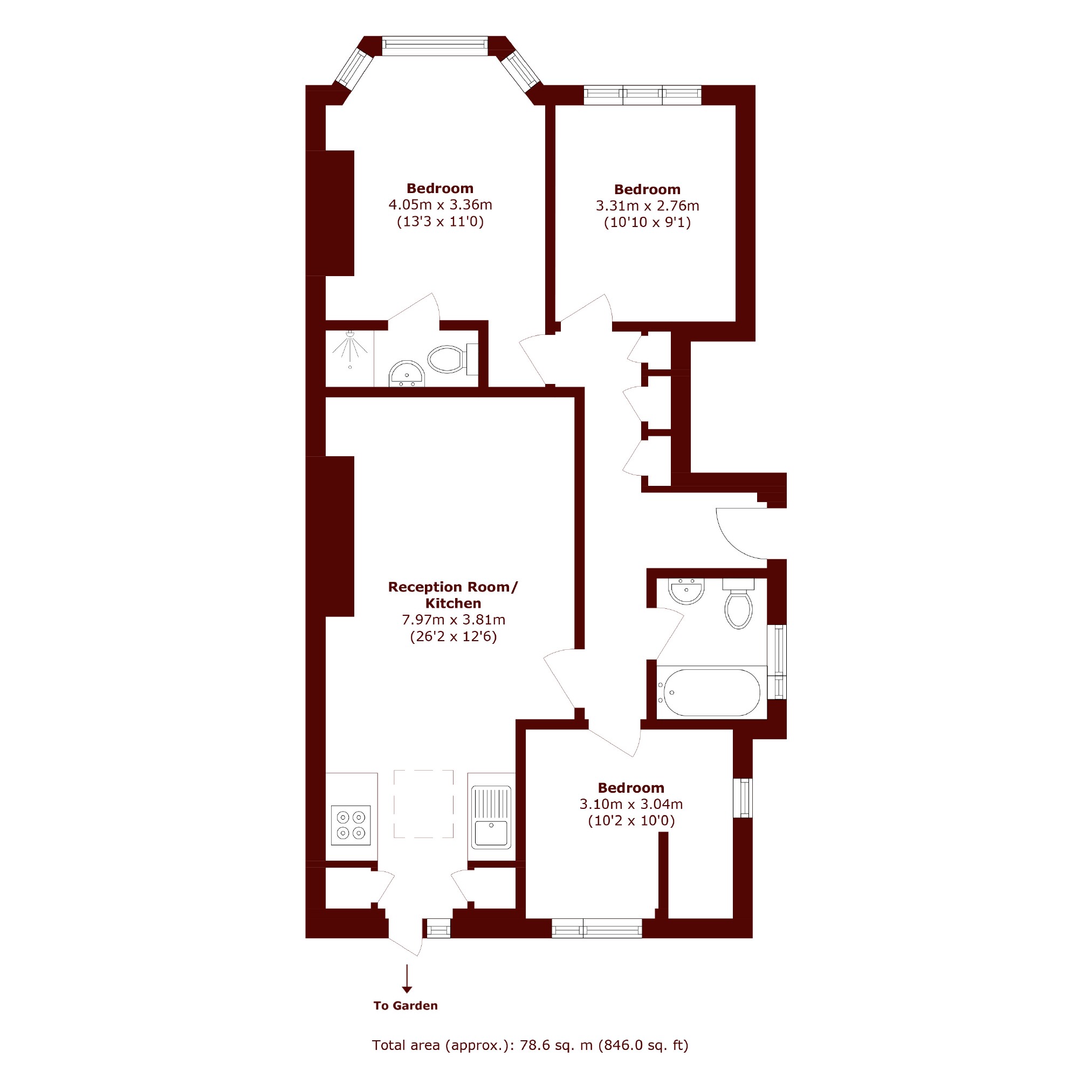 This modern, ground floor maisonette is arranged over 846sqft and comprises a spacious, open plan kitchen living room with direct access to a private rear garden, three bedrooms, a three-piece family bathroom, an en suite with walk-in shower, and ample storage space.