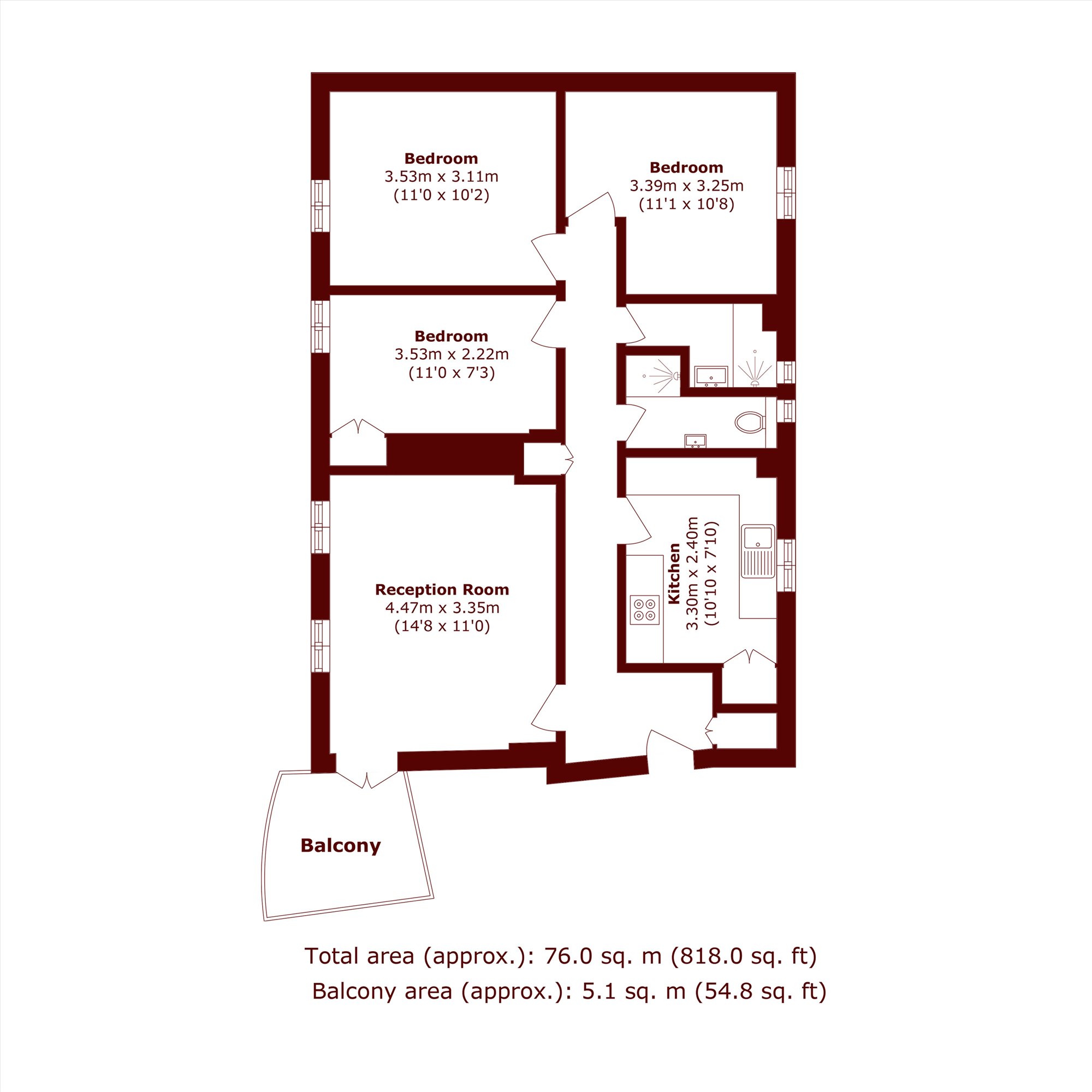 Spacious and newly refurbished throughout, this impressive flat offers almost 900 sq ft of well-proportioned living space. The property has three generous double bedrooms, two shower rooms, a bright and spacious reception room, a separate kitchen, and a large private balcony.