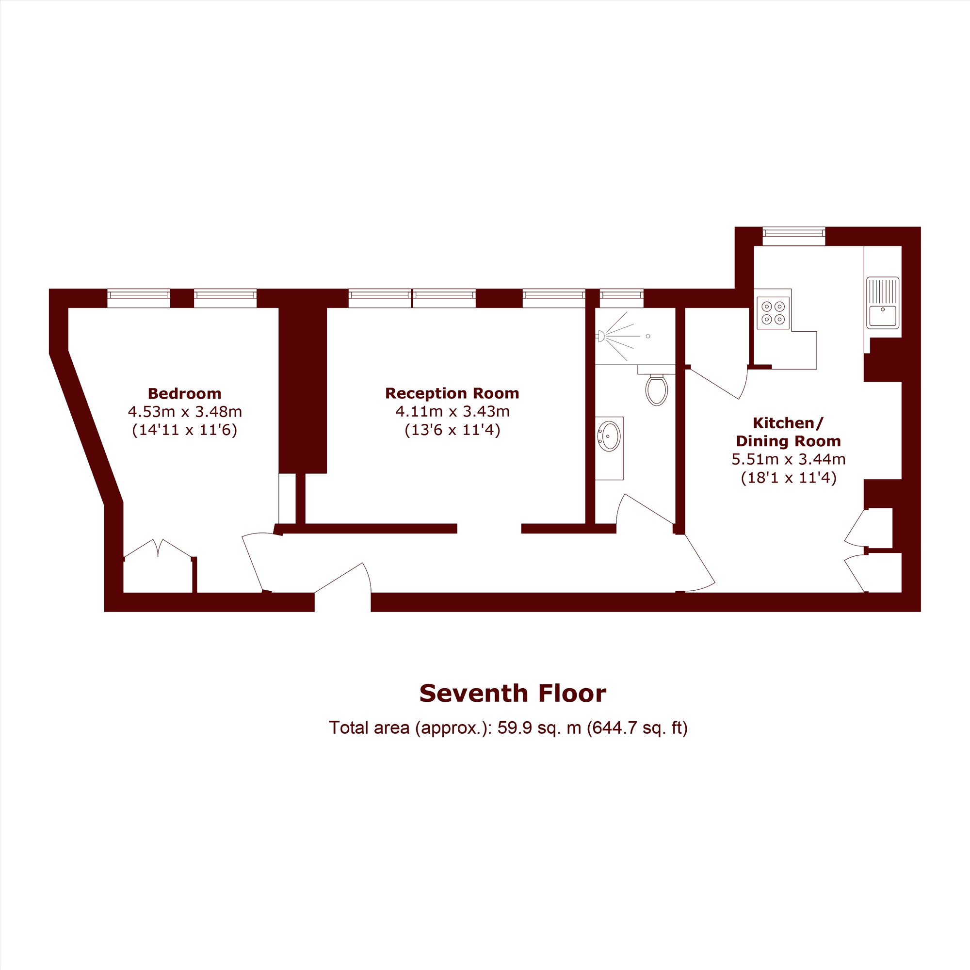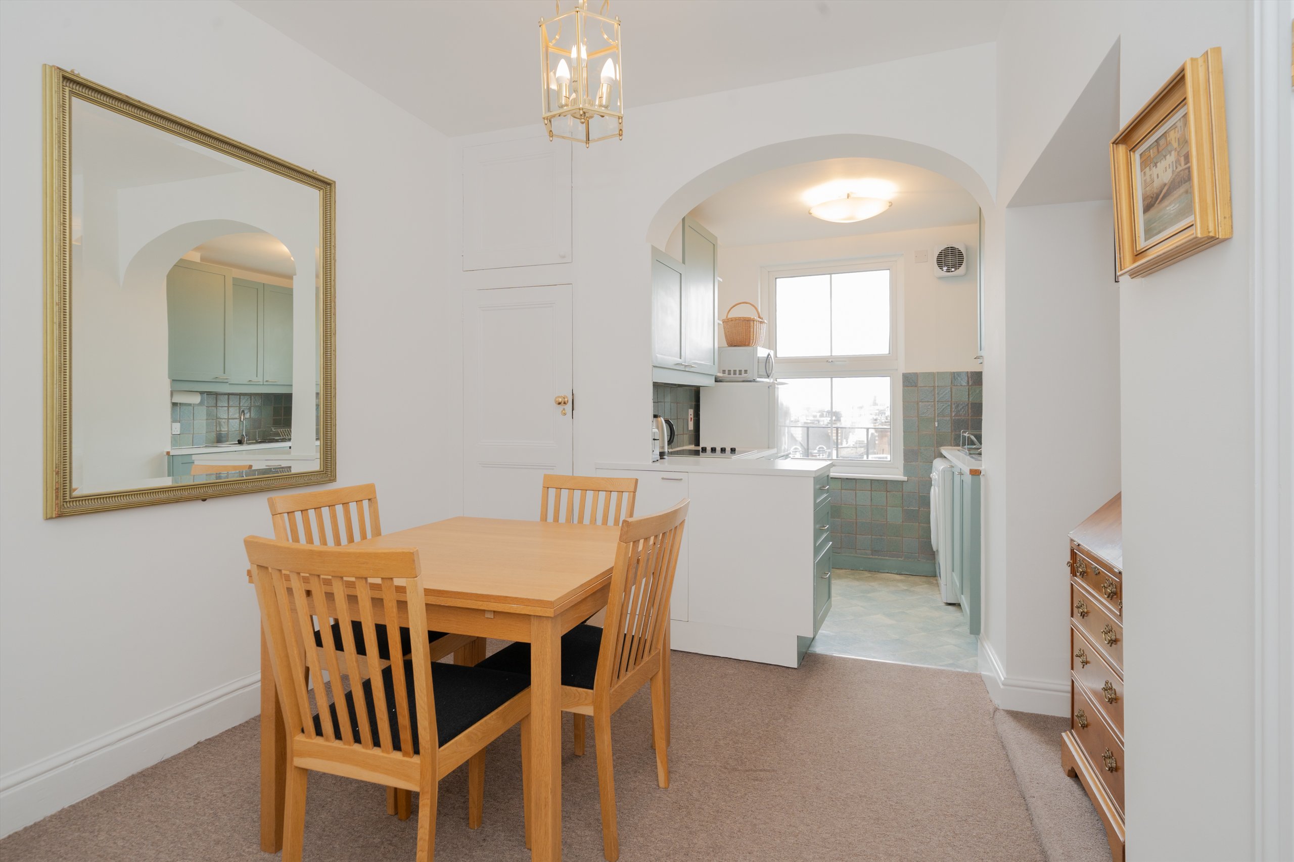 The well-proportioned bedroom provides a tranquil retreat with generous storage, while the contemporary kitchen is thoughtfully designed with integrated appliances and sleek cabinetry. A stylish bathroom completes the accommodation.