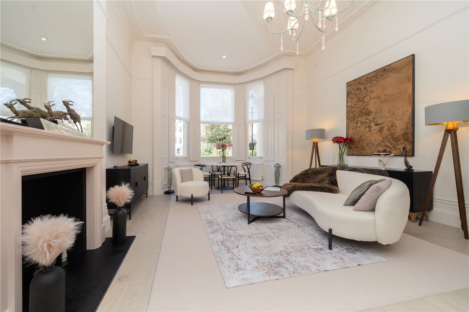 Rare to market is this truly exceptional property offering grand proportions combined with a beautifully crafted interior. The property occupies the preferred raised ground floor of this beautiful character conversion, though also benefits from a private south-west facing rear garden. The main reception room overlooks the residents' gardens showcasing a bay window inset with shutters, and boasts vast ceiling heights, wonderful period detailing, and a feature fireplace. Adjacent to this is a semi-open fully equipped kitchen. There are two double bedrooms, two bathrooms, and plenty of storage. Considered best-in-class, this statement property is not to be missed.