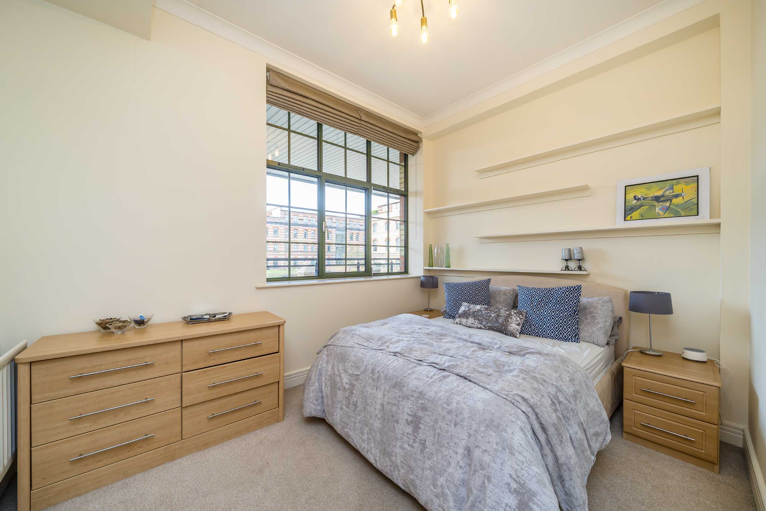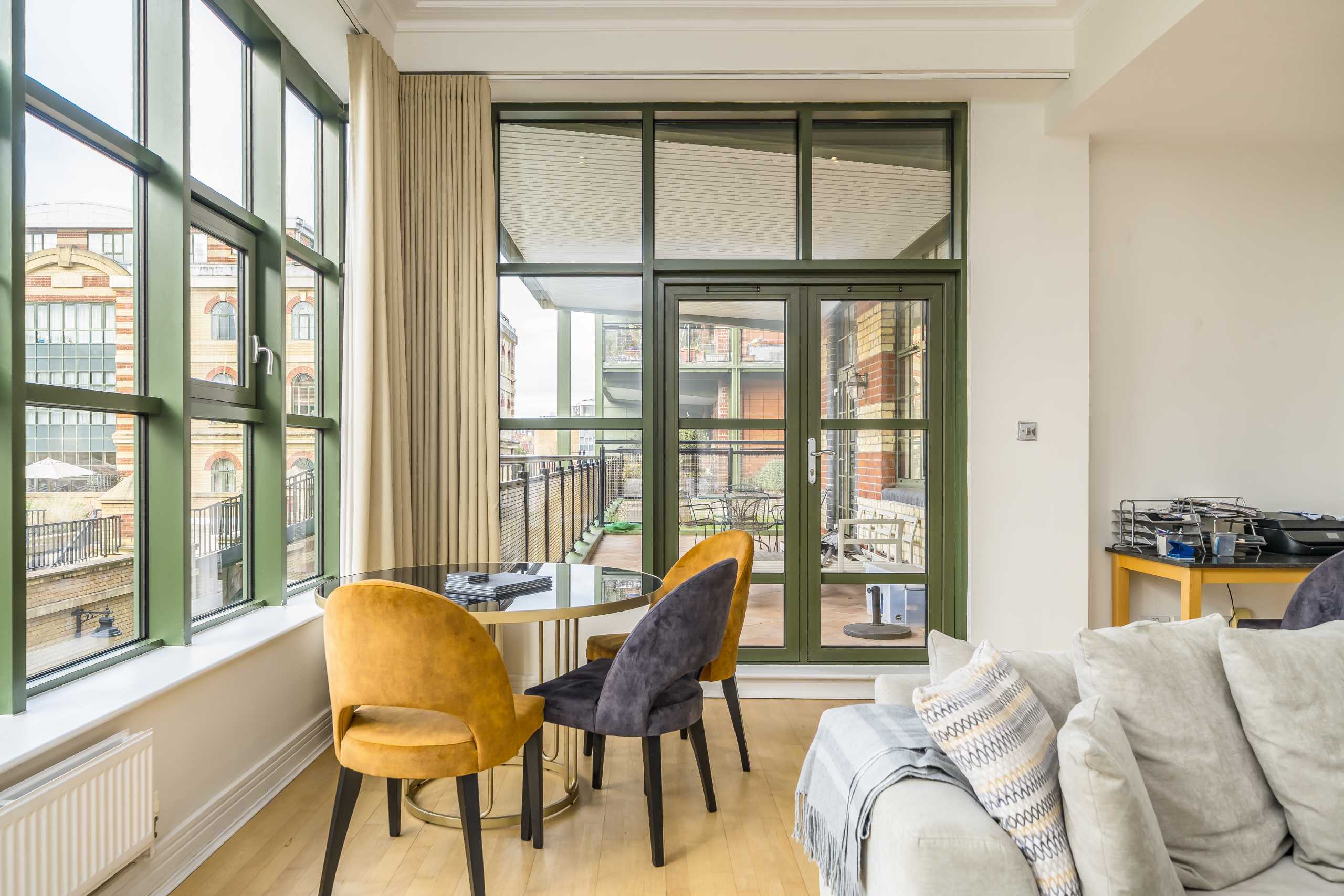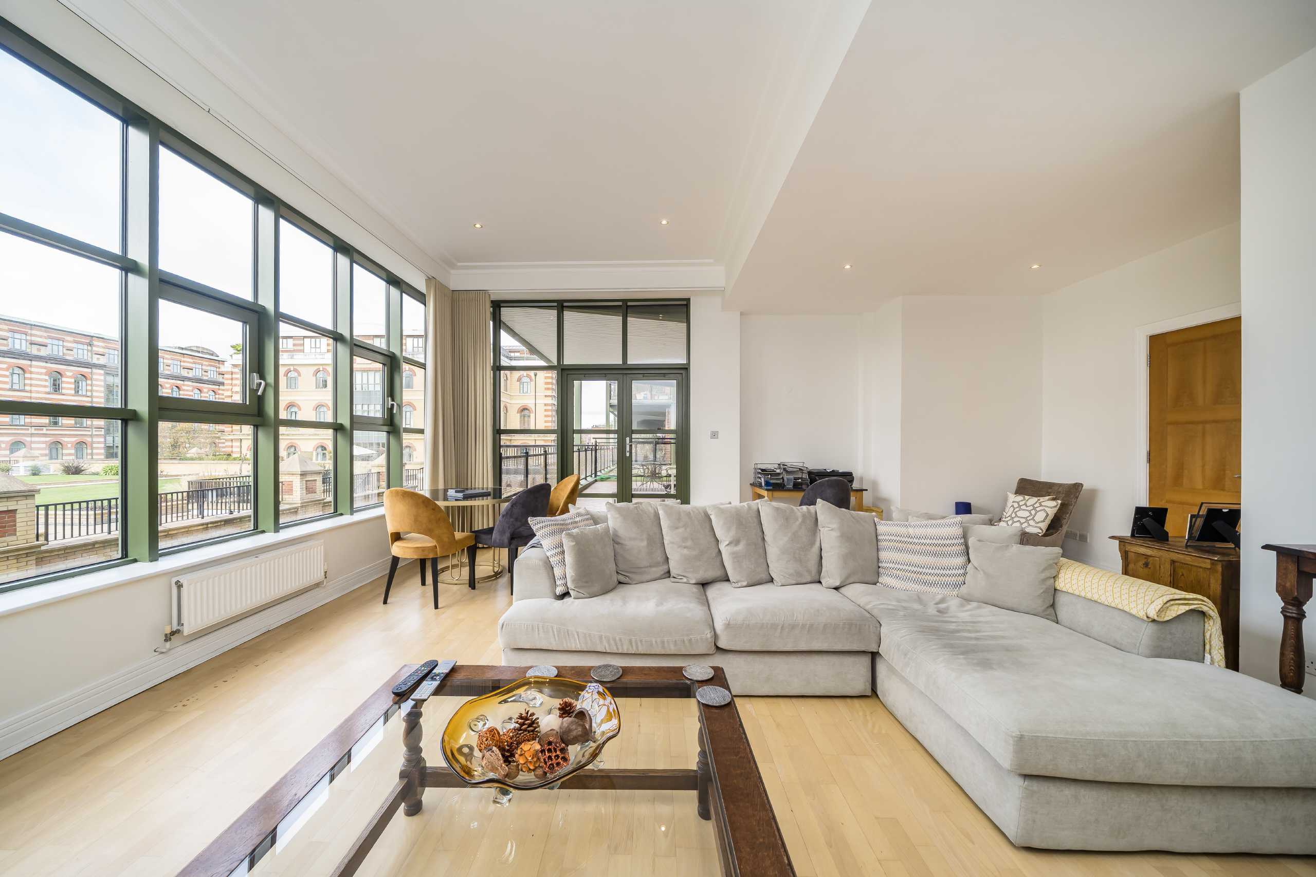A beautifully apartment with a large private balcony. On the first floor of this iconic riverside depository building in the exclusive Harrods Village, Barnes. Situated on the same level as the communal garden, this spacious home features high ceilings, stunning river views from both the reception room and the principal bedroom, and benefits from lift access and an allocated parking space.