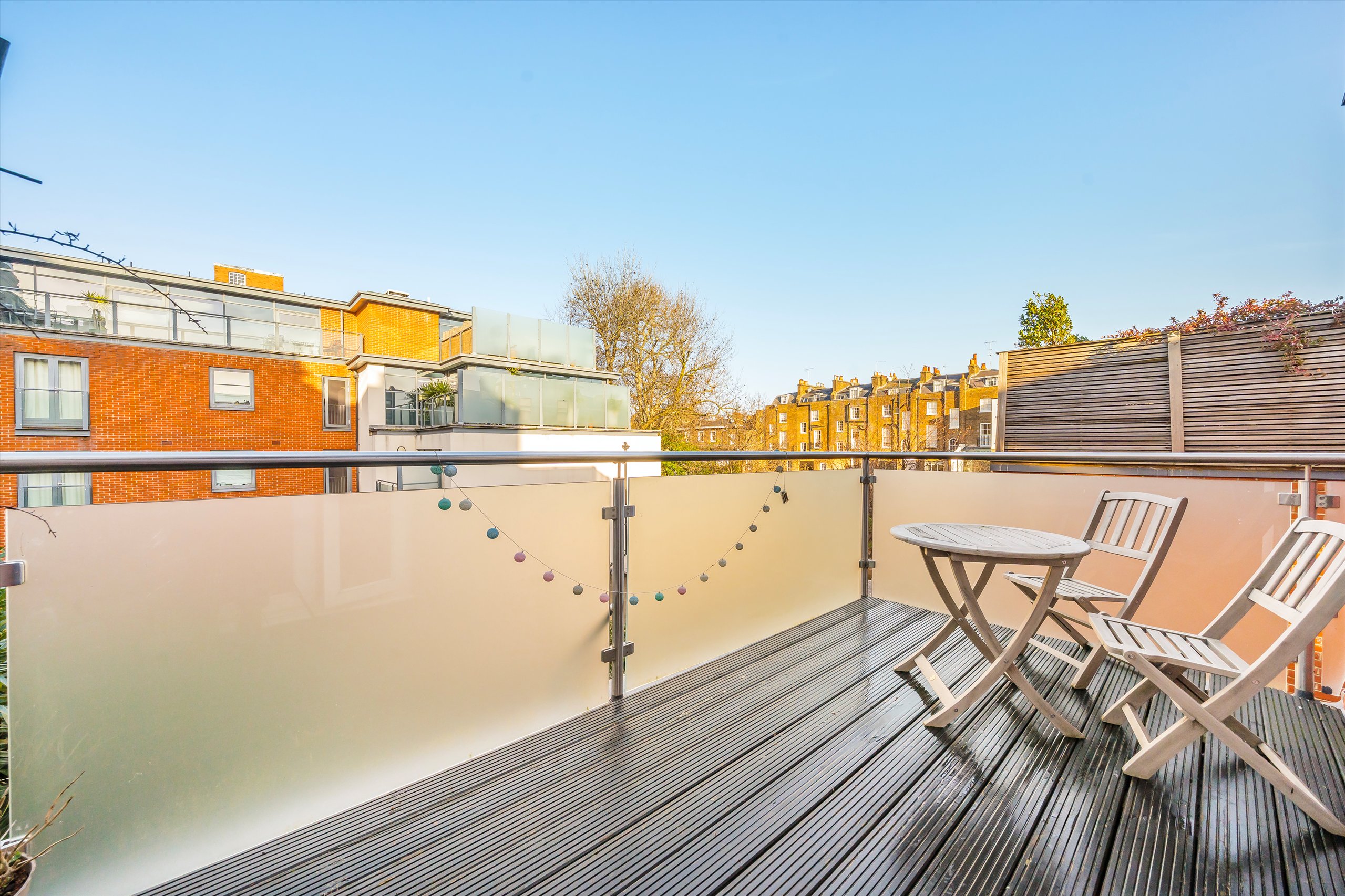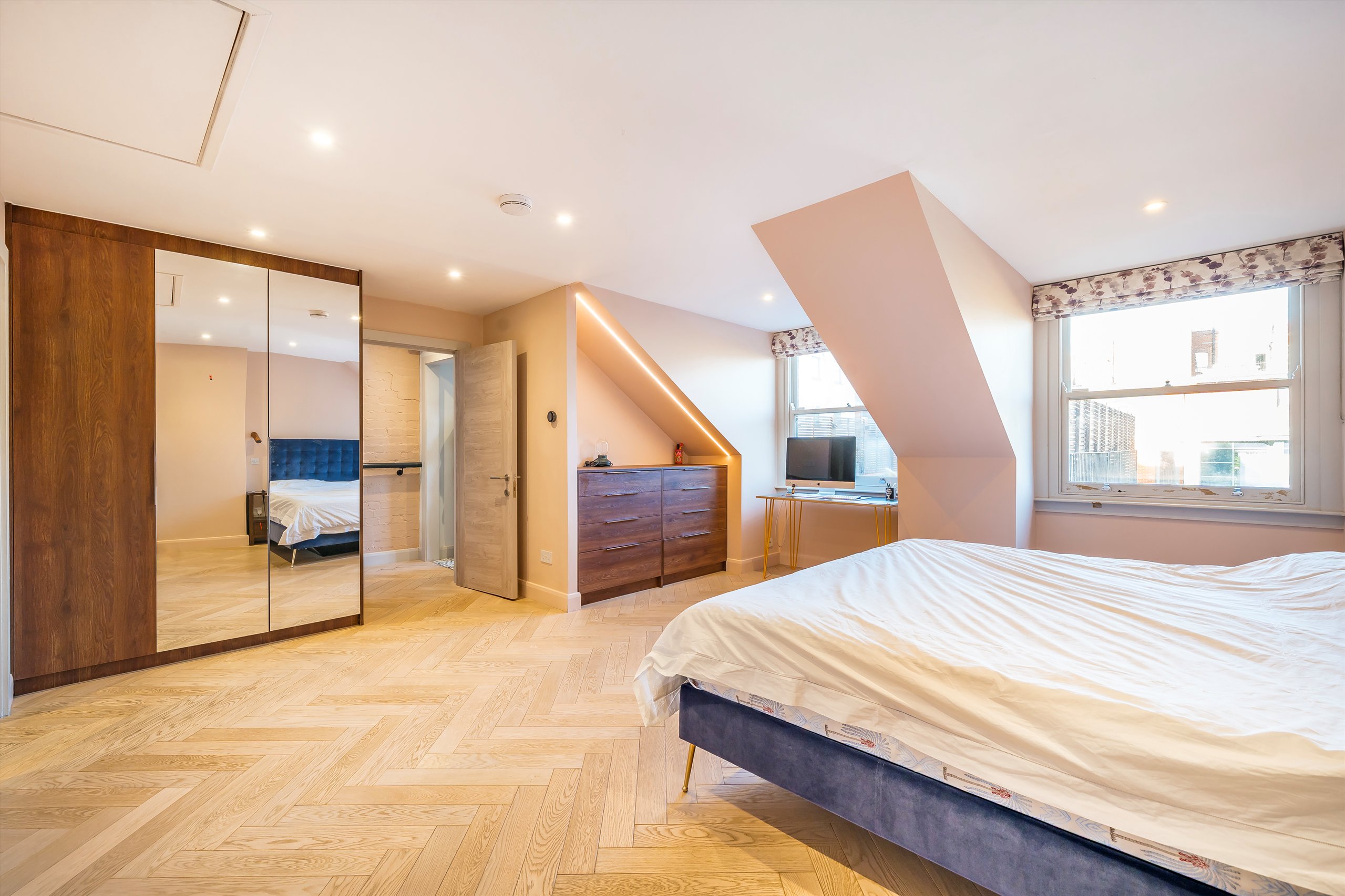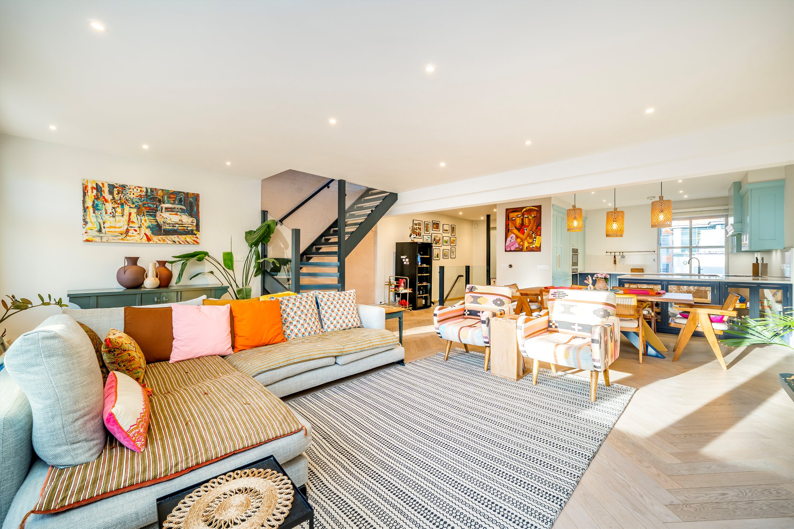 The property comprises three generous double bedrooms and three contemporary bathrooms. The main living space features a stylish open-plan living and dining area, complemented by a refitted Herringbone kitchen. Full-width windows flood the space with natural light, enhancing the sense of openness throughout.