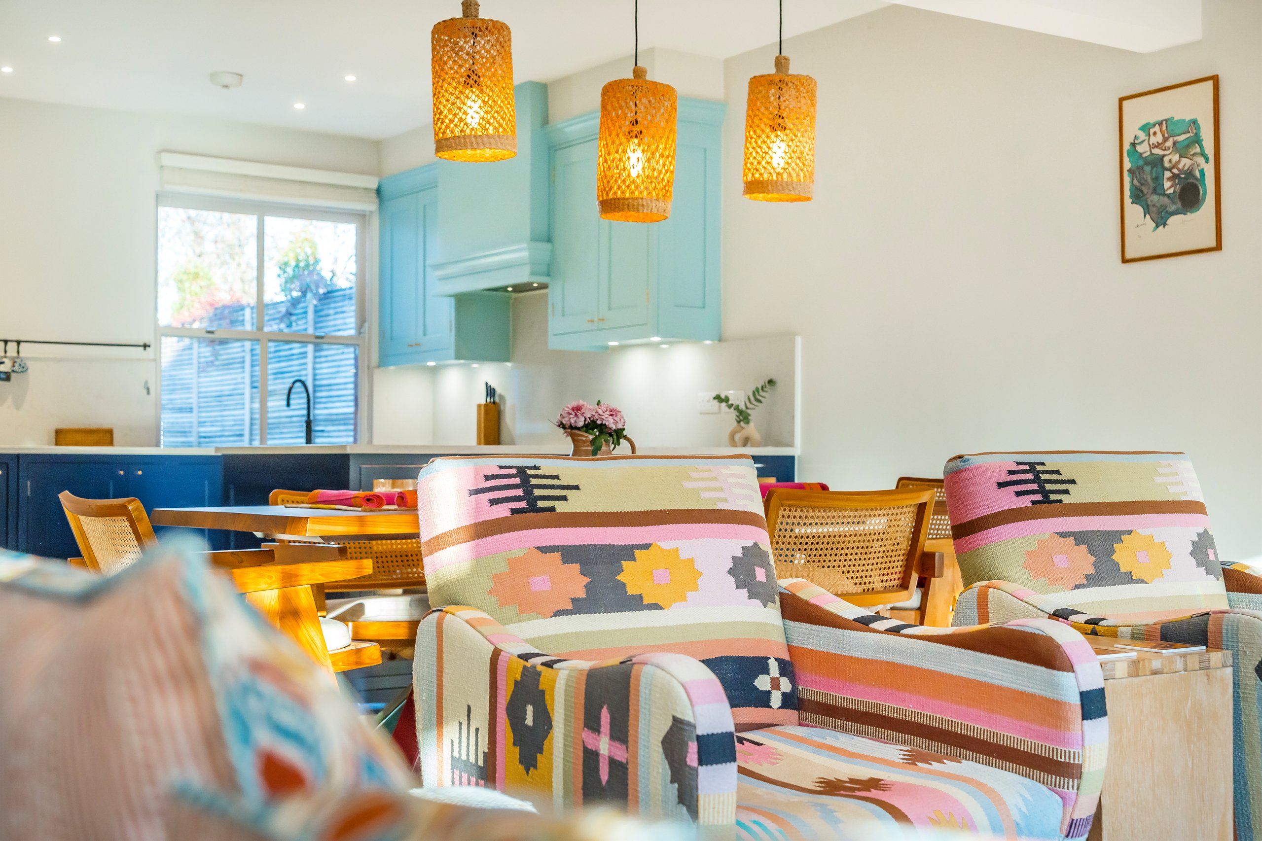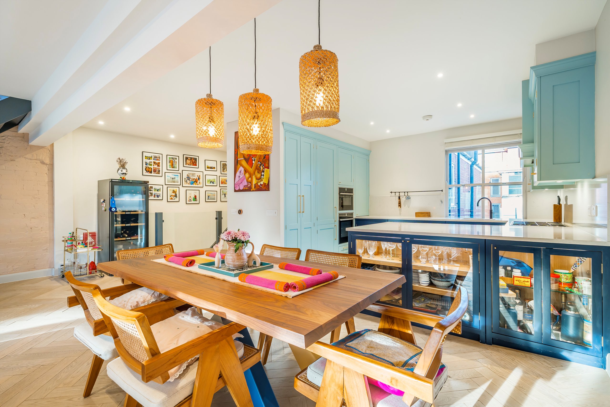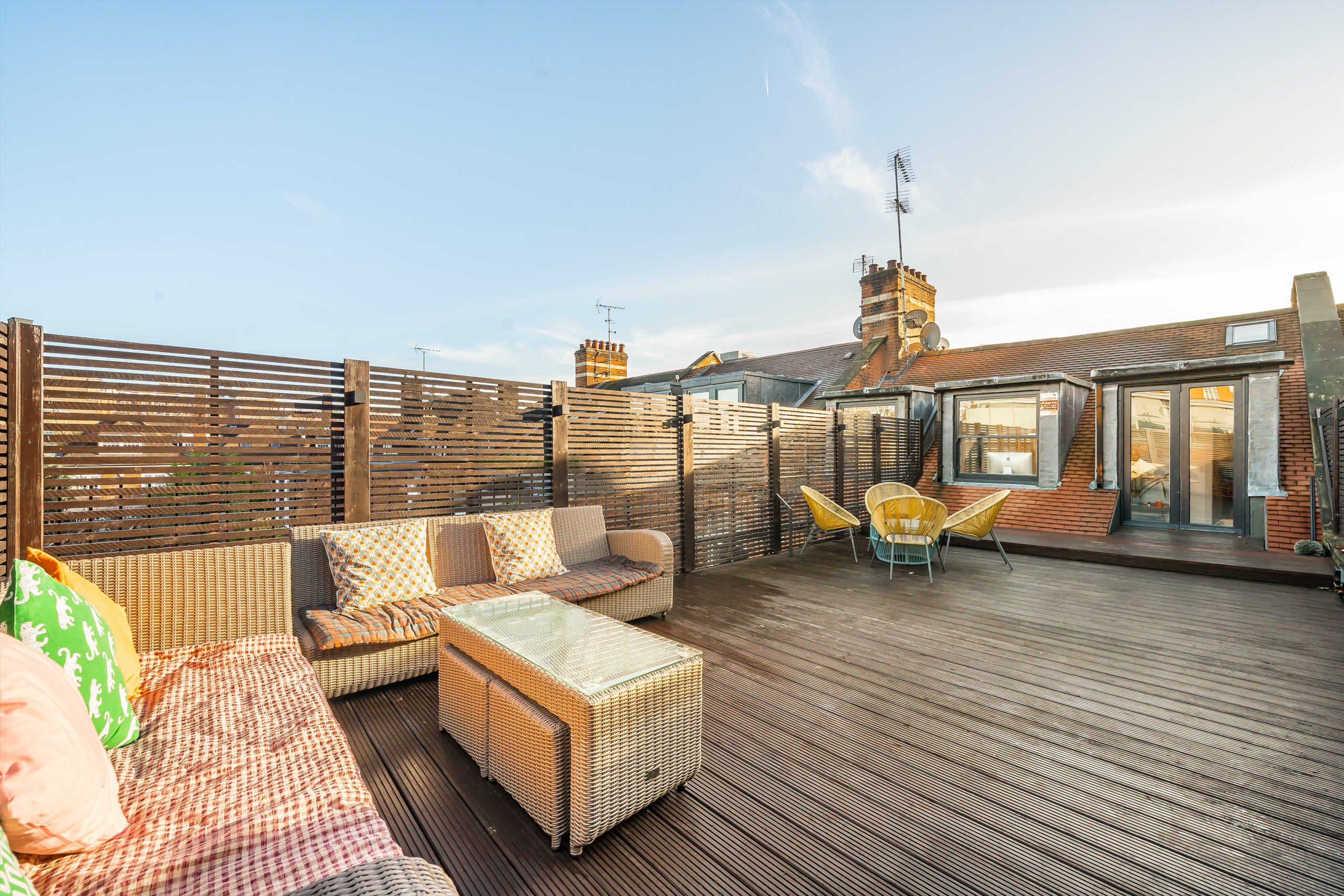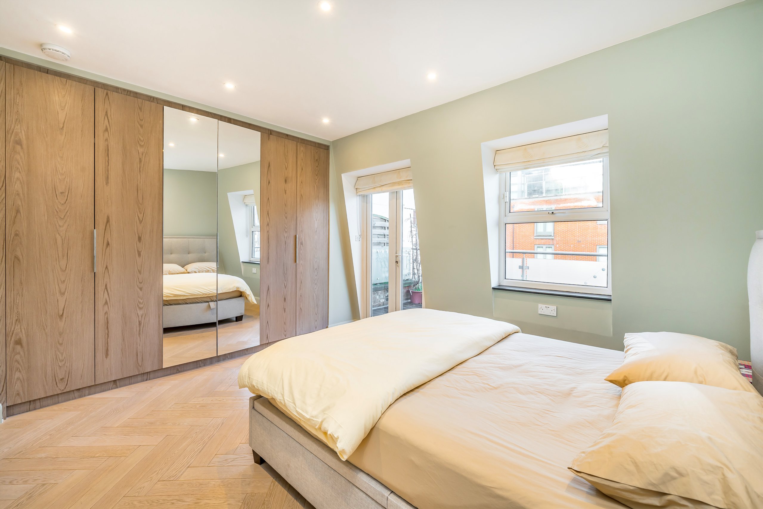 The property comprises three generous double bedrooms and three contemporary bathrooms. The main living space features a stylish open-plan living and dining area, complemented by a refitted Herringbone kitchen. Full-width windows flood the space with natural light, enhancing the sense of openness throughout.