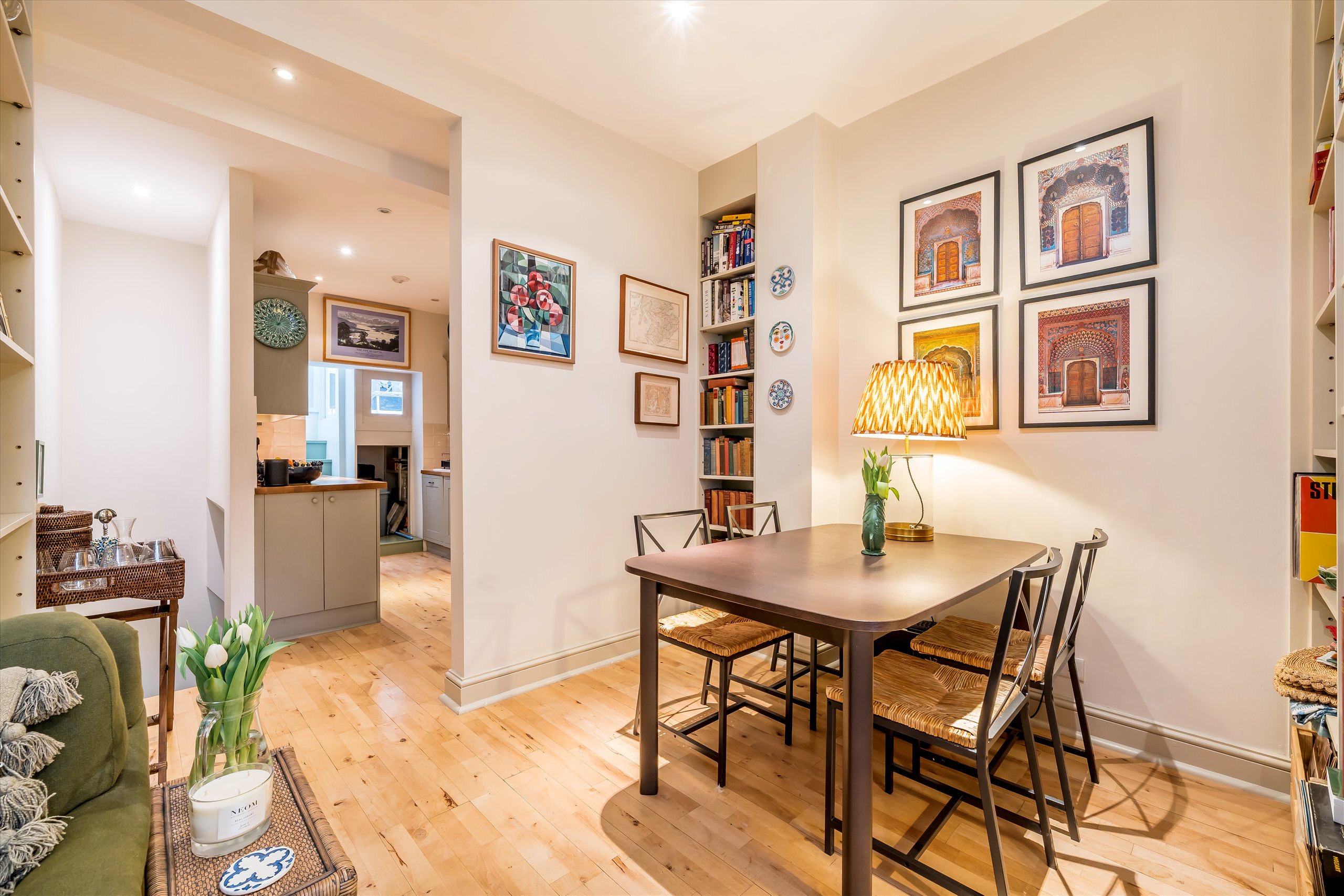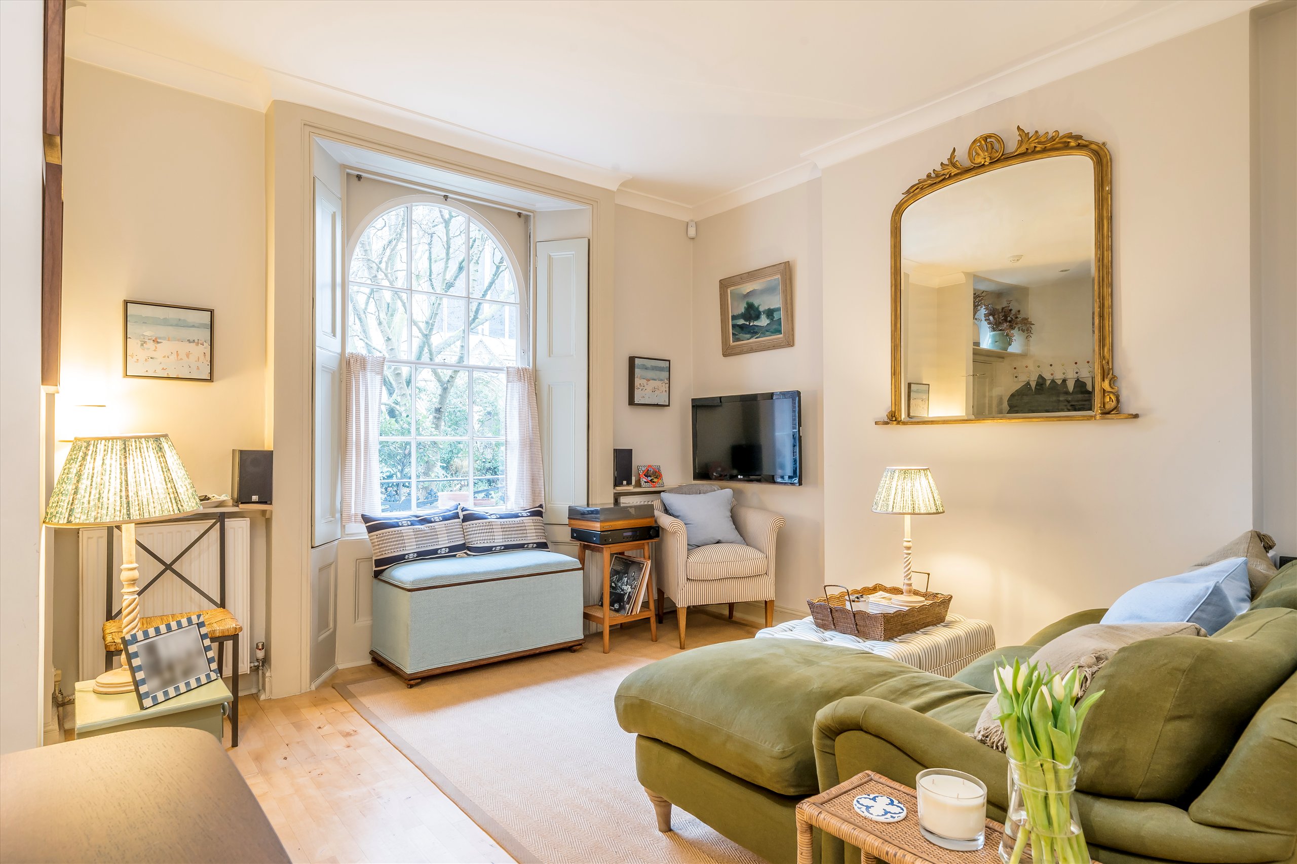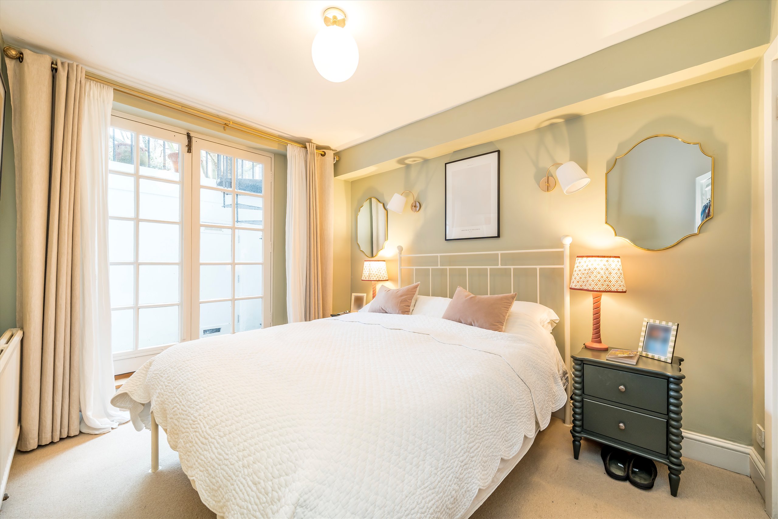 Benefitting from its own private entrance, this charming duplex is arranged over the raised and lower ground floors. The raised ground level features high ceilings, original shutters and large west-facing windows overlooking communal gardens, alongside a spacious separate kitchen. The lower ground floor offers a generous principal bedroom with French doors to a patio garden, a second bedroom/study, and a bathroom.