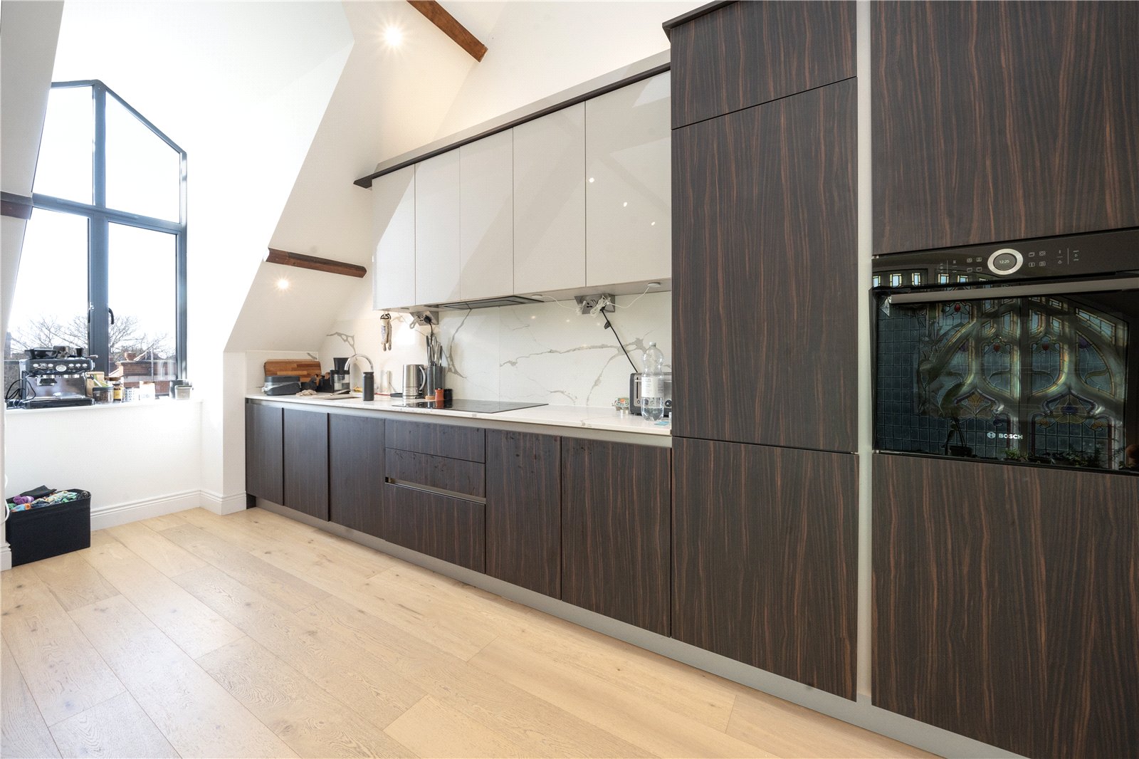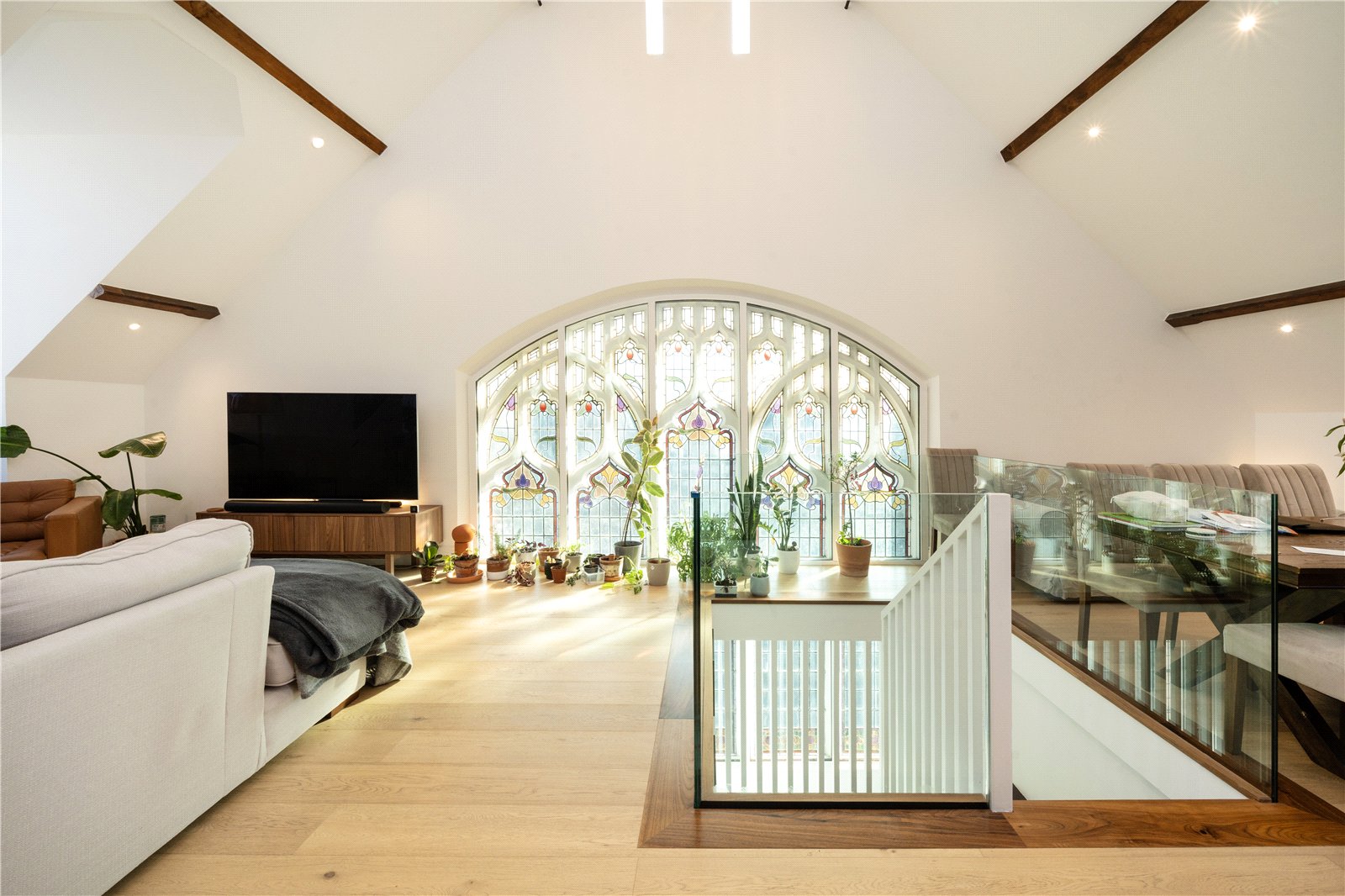 This bright, two-bedroom, two-bathroom apartment is arranged over the first and second floors of a charming church conversion, comprising an impressive 575sqft kitchen/living space with integrated appliances, vaulted ceilings and beautiful stained glass windows, two double bedrooms with fitted storage, an ensuite with walk in shower, a three-piece family bathroom and hallway storage cupboards.