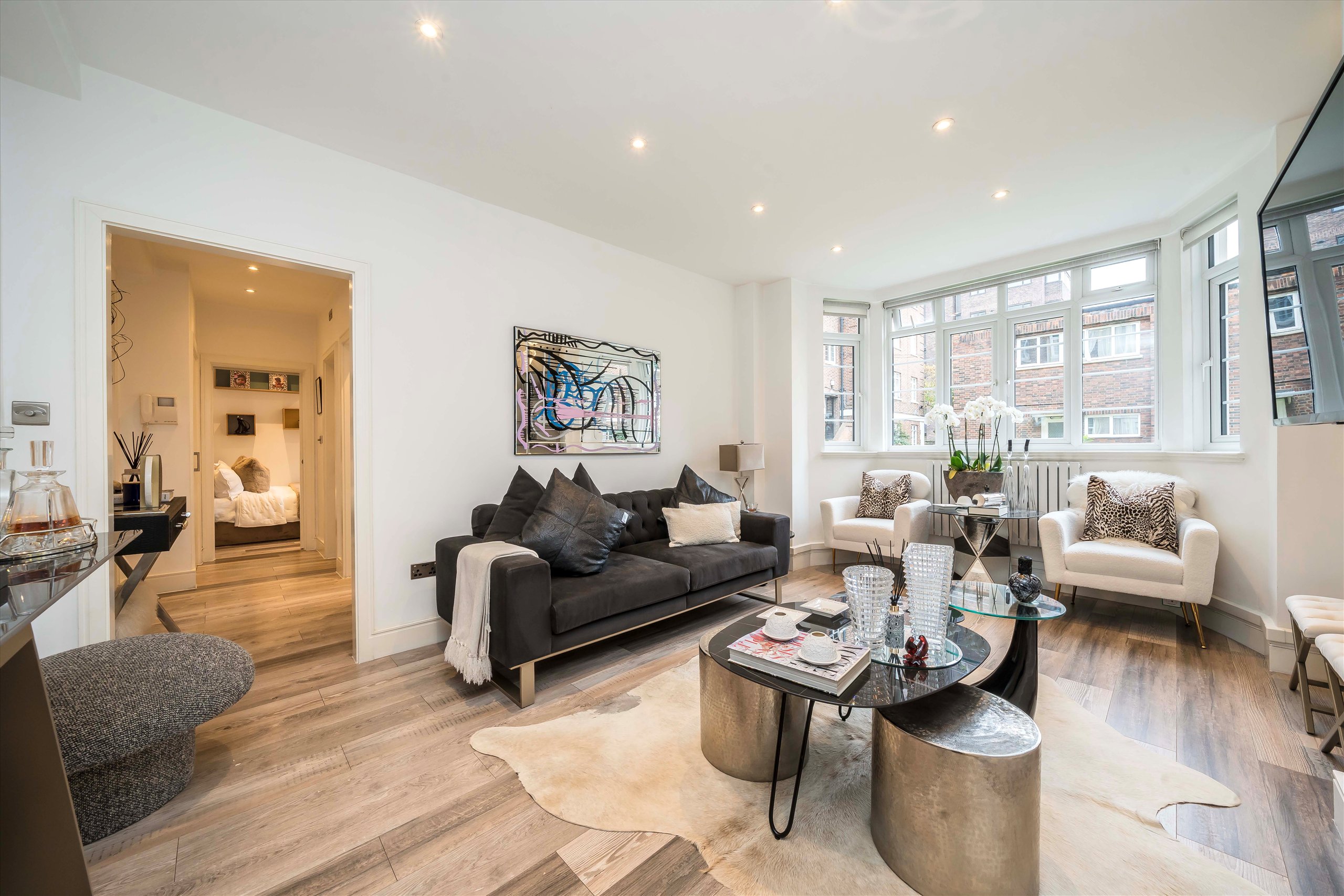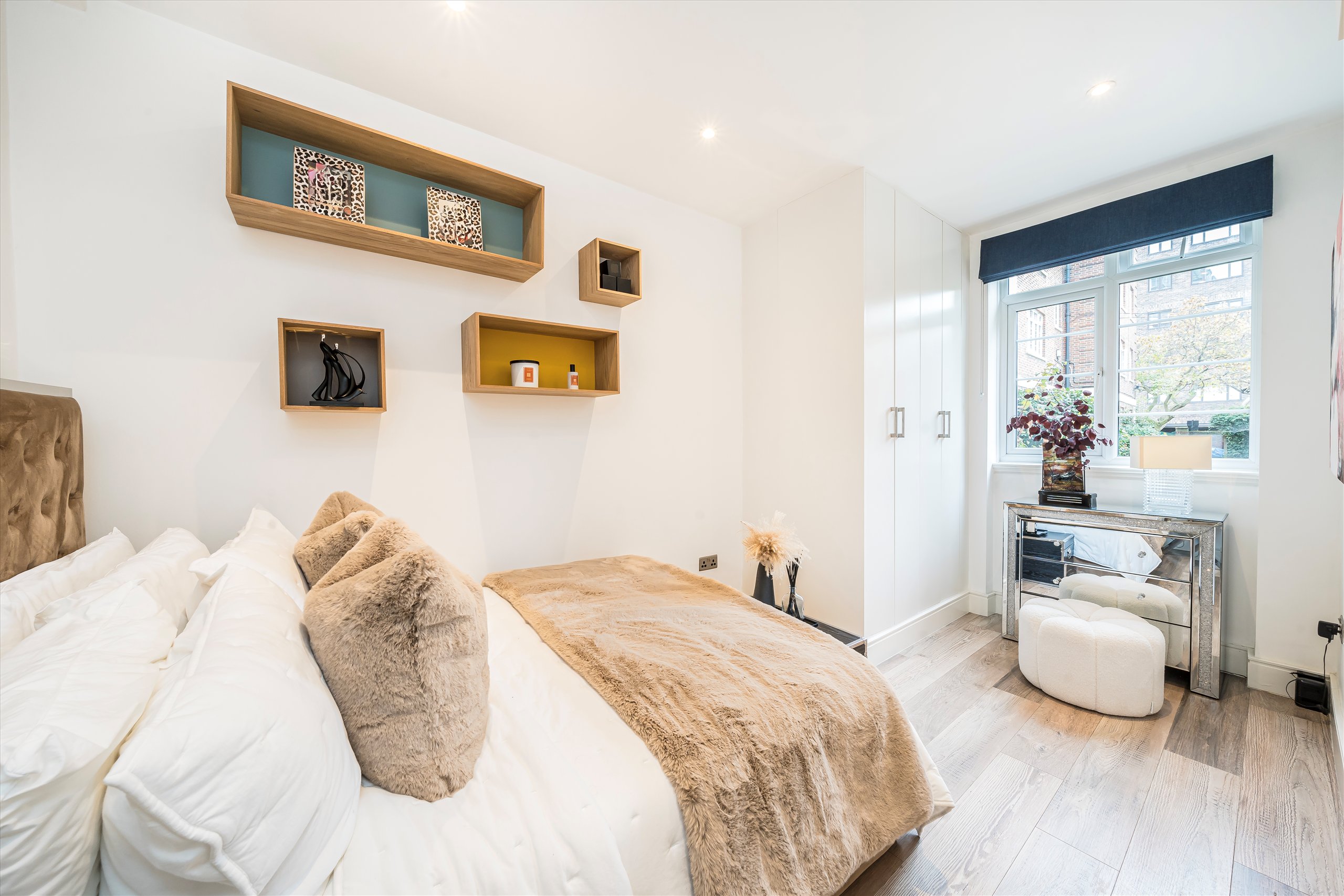 A bright two-bedroom flat in a prestigious mansion block featuring spacious reception, modern kitchen, ample storage, garden views, stylish shower room with underfloor heating, and 24/7 concierge.