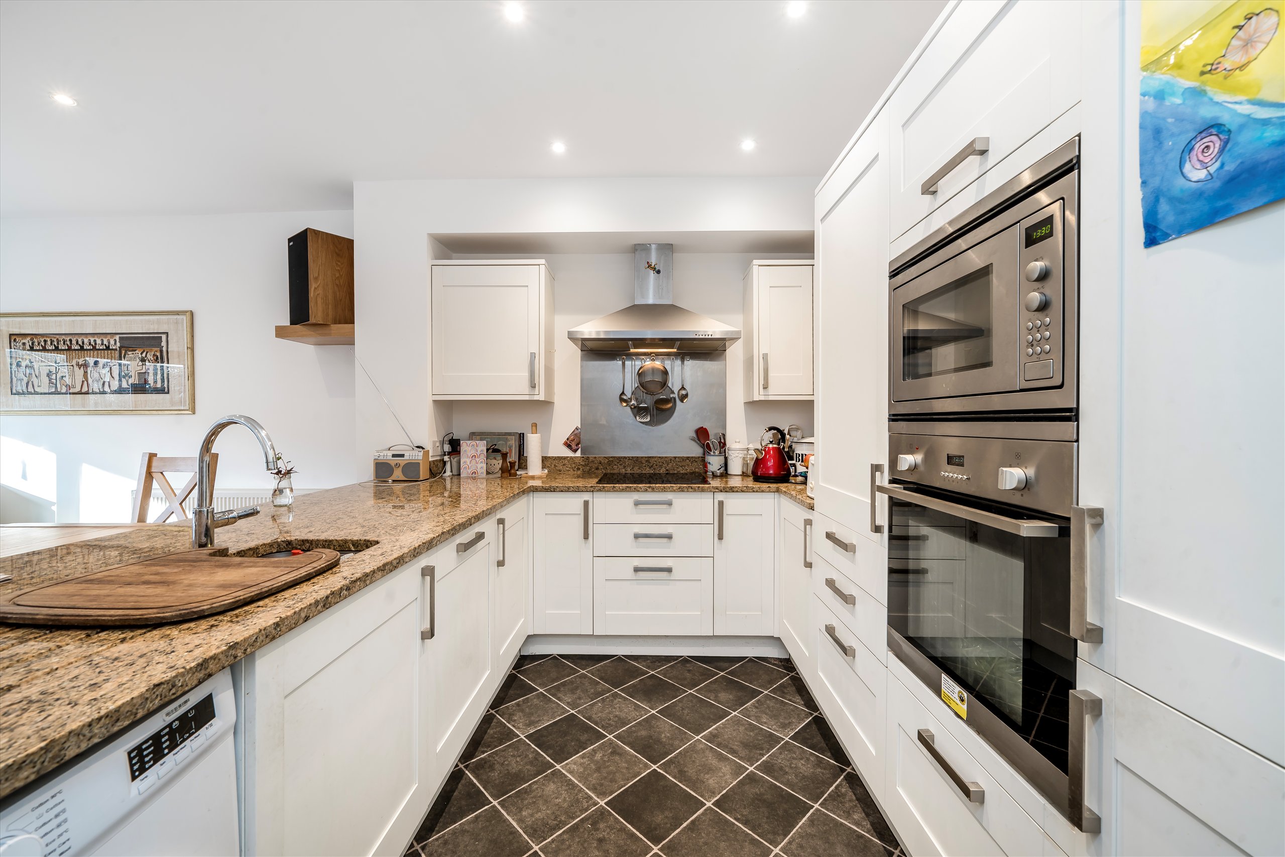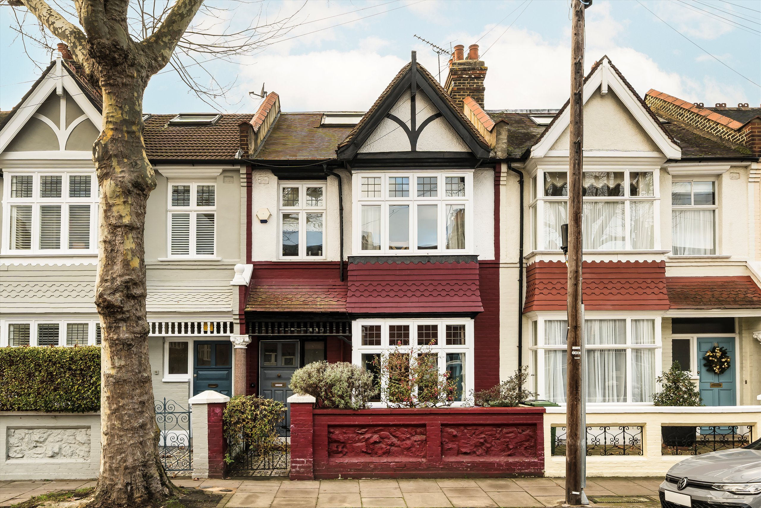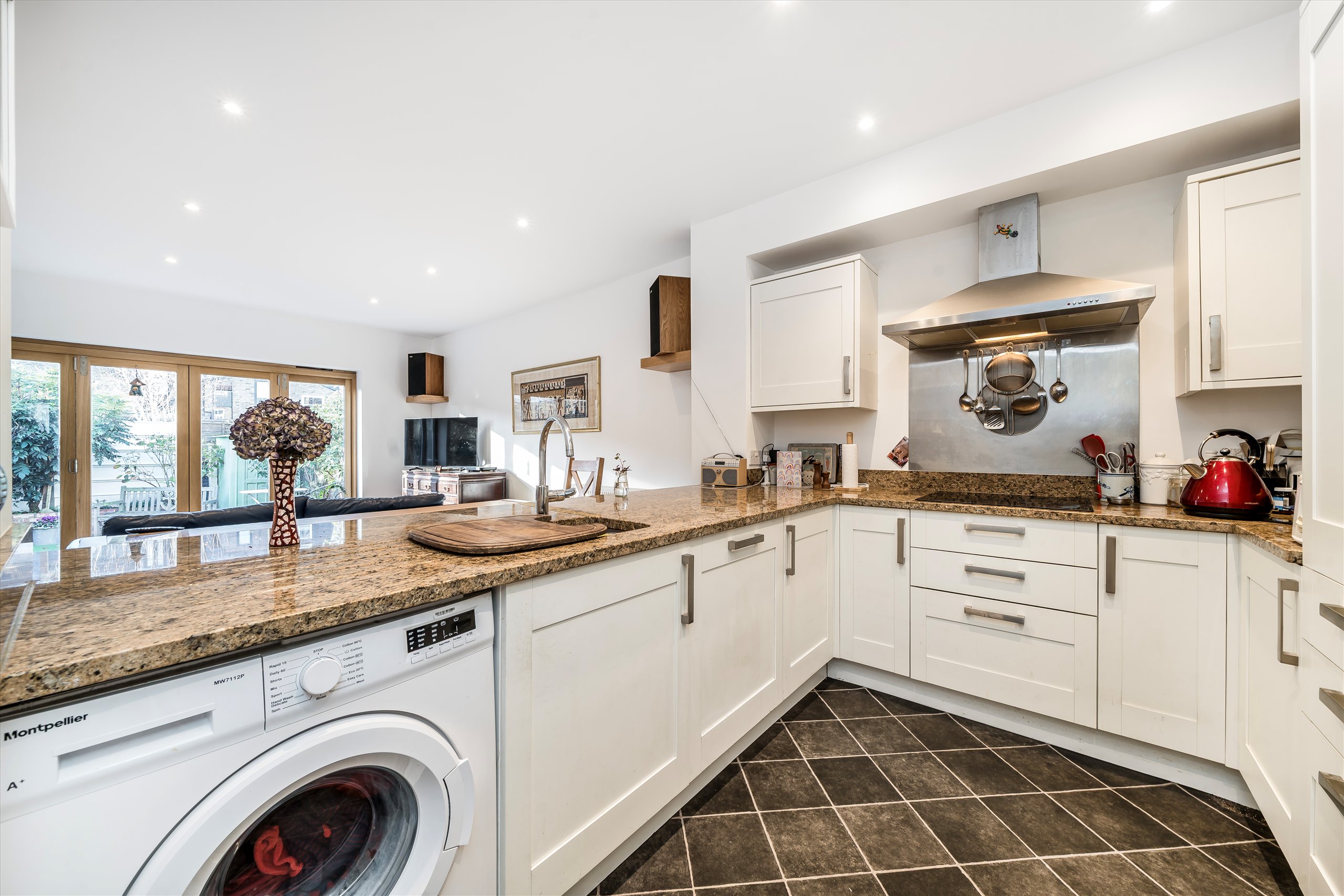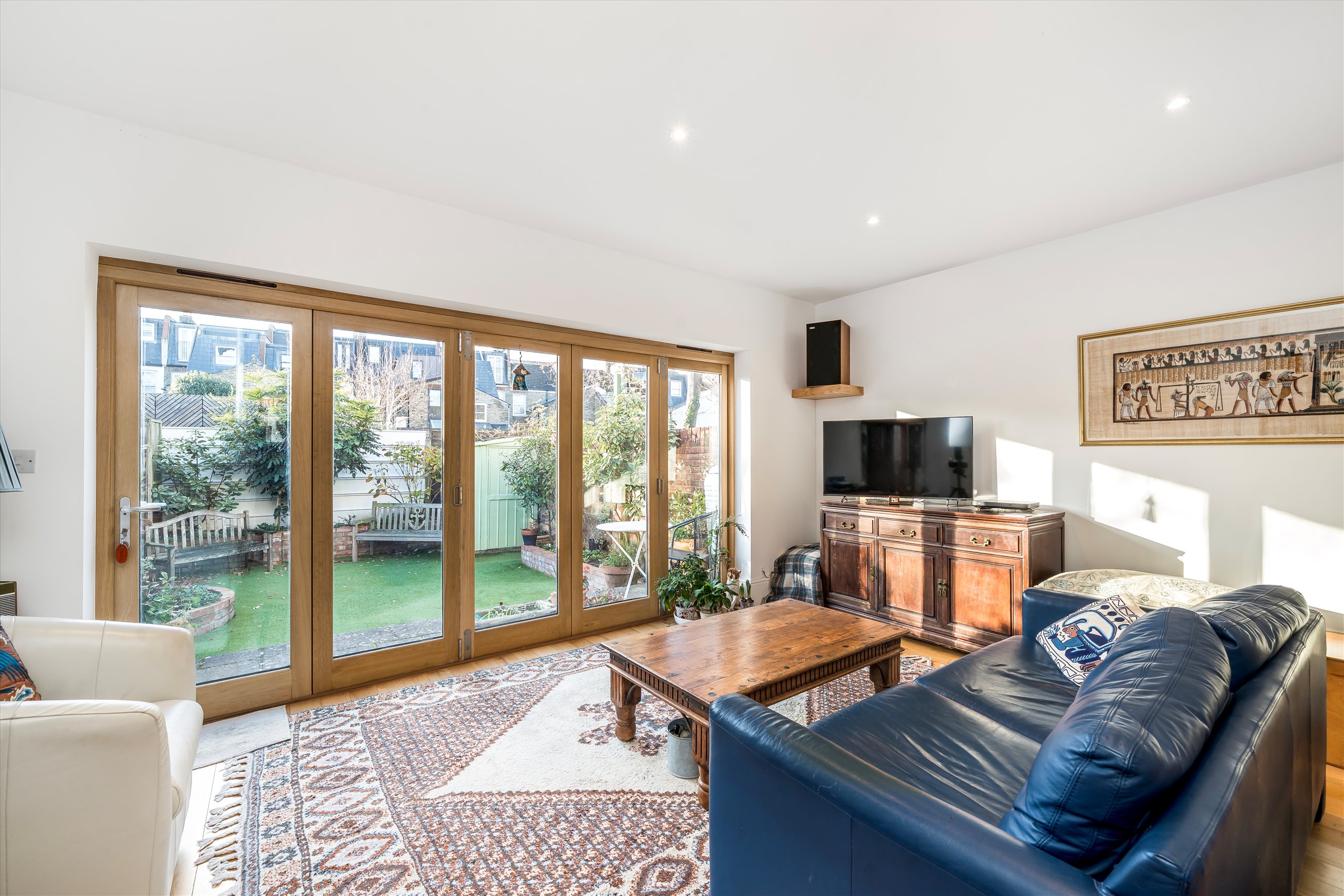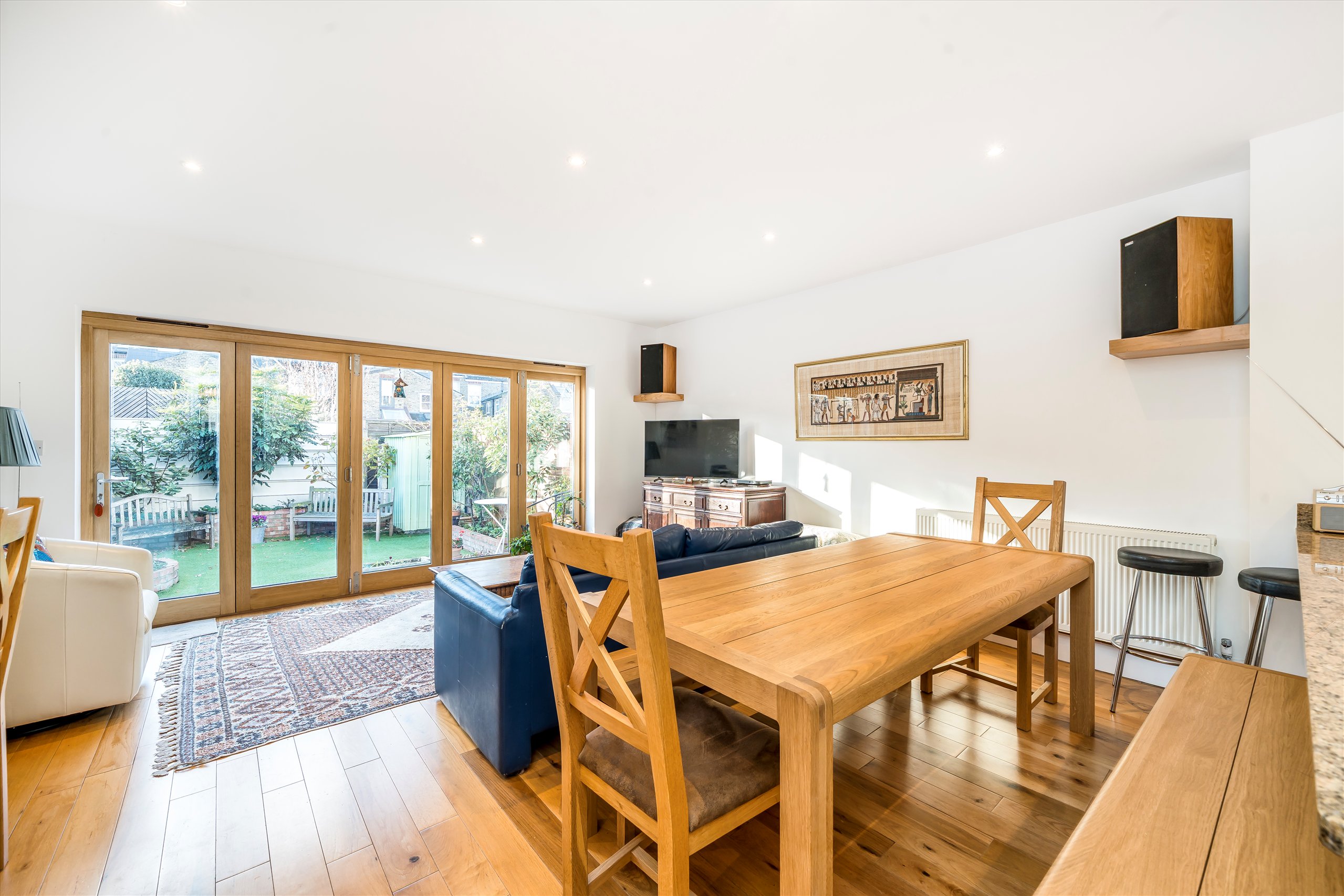 This superb four bedroom house retains many lovely features ranging from several fireplaces to the tessellated floor in the entrance hallway. On the ground floor to the front, is a living room with original cornicing and a bay window, along with a guest WC/shower room and a wonderful kitchen/family room with wooden bi-folding doors that open onto the west facing garden. The kitchen is gorgeous, with a full range of units, built-in appliances and a quartz worktop. The first floor has three bedrooms and a family bathroom and the top floor comprises a bright double bedroom with a modern en-suite bathroom.