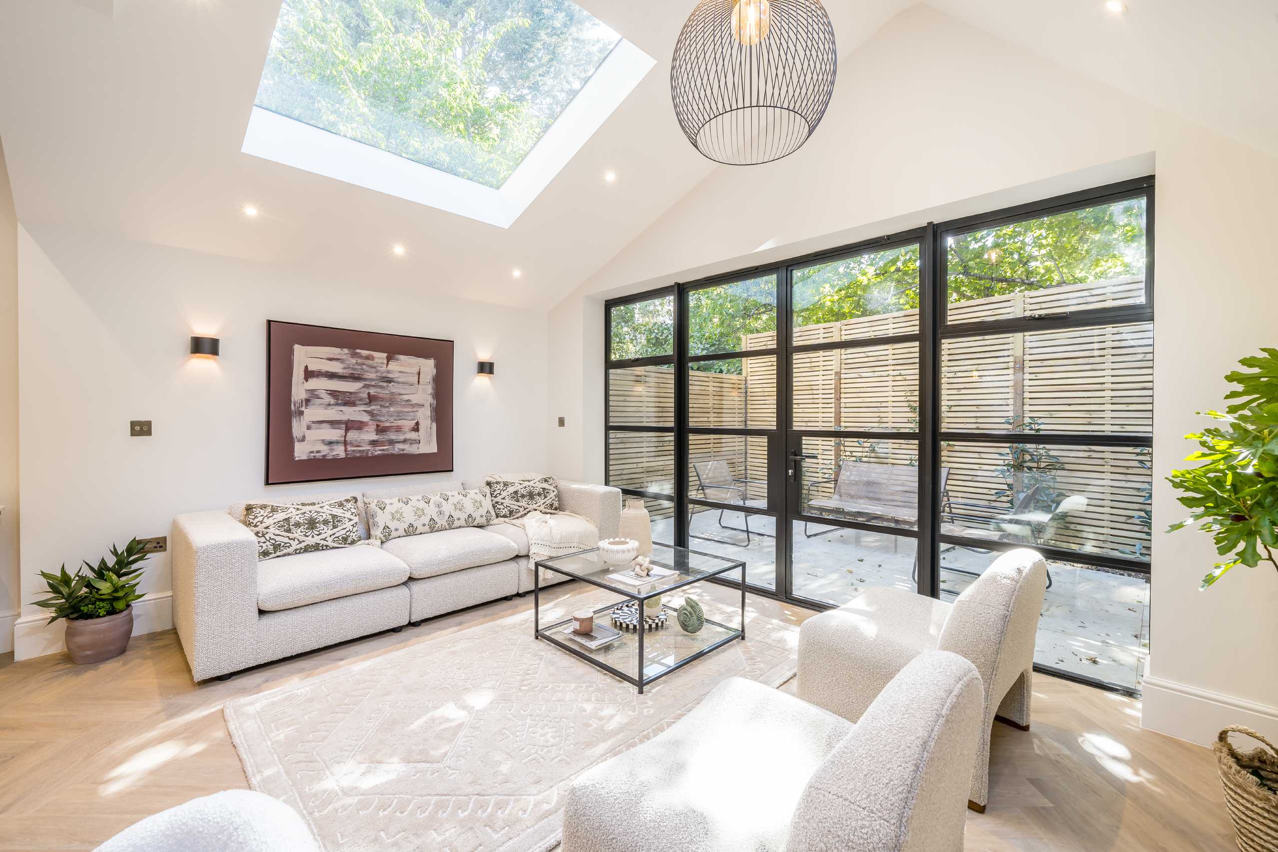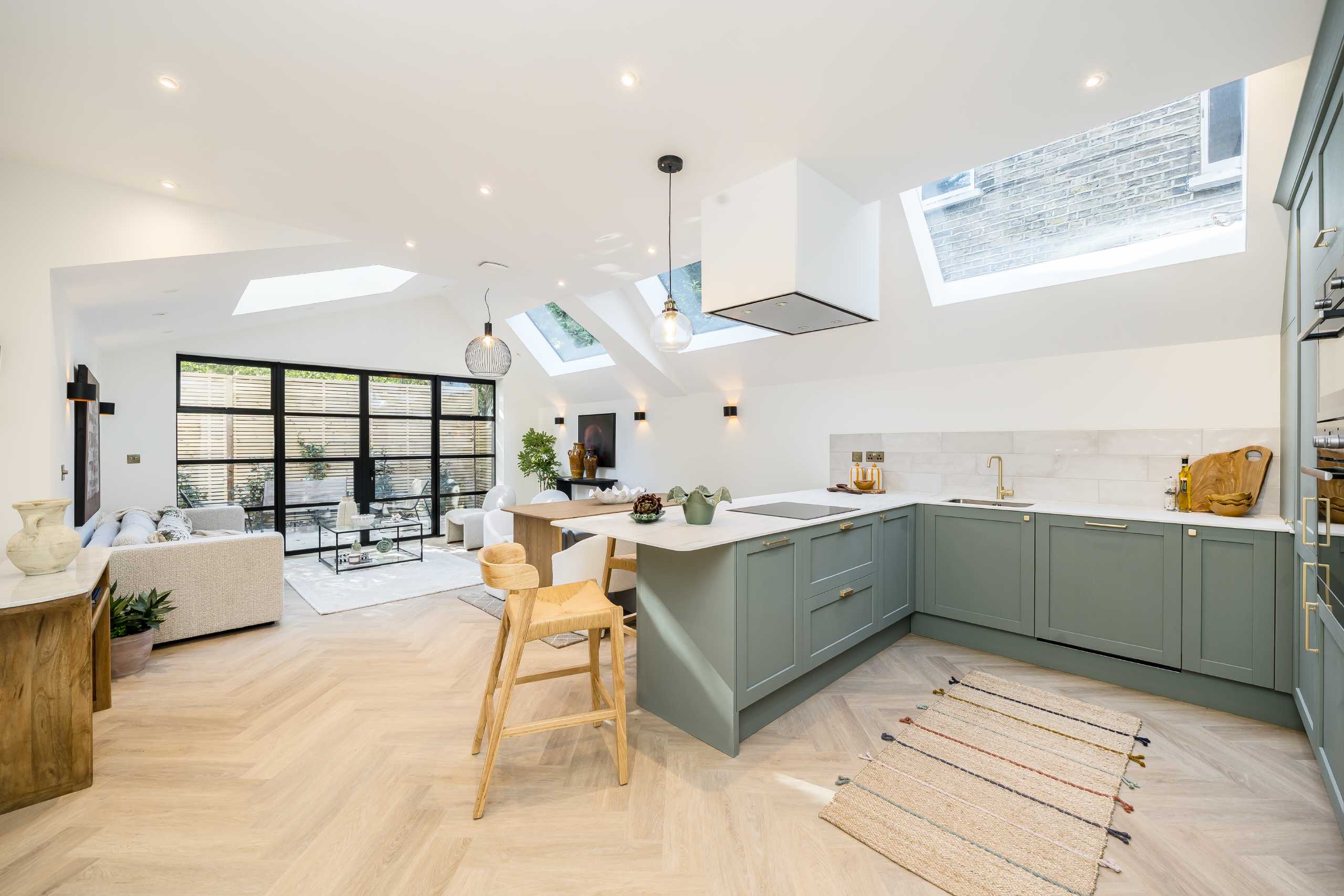 A spacious open-plan kitchen and living area forms the heart of the home, featuring elegant herringbone flooring, sleek AEG appliances, underfloor heating, and abundant natural light from well-placed skylights. Bi-folding doors open seamlessly onto a beautiful private garden, creating a true indoor-outdoor living experience.