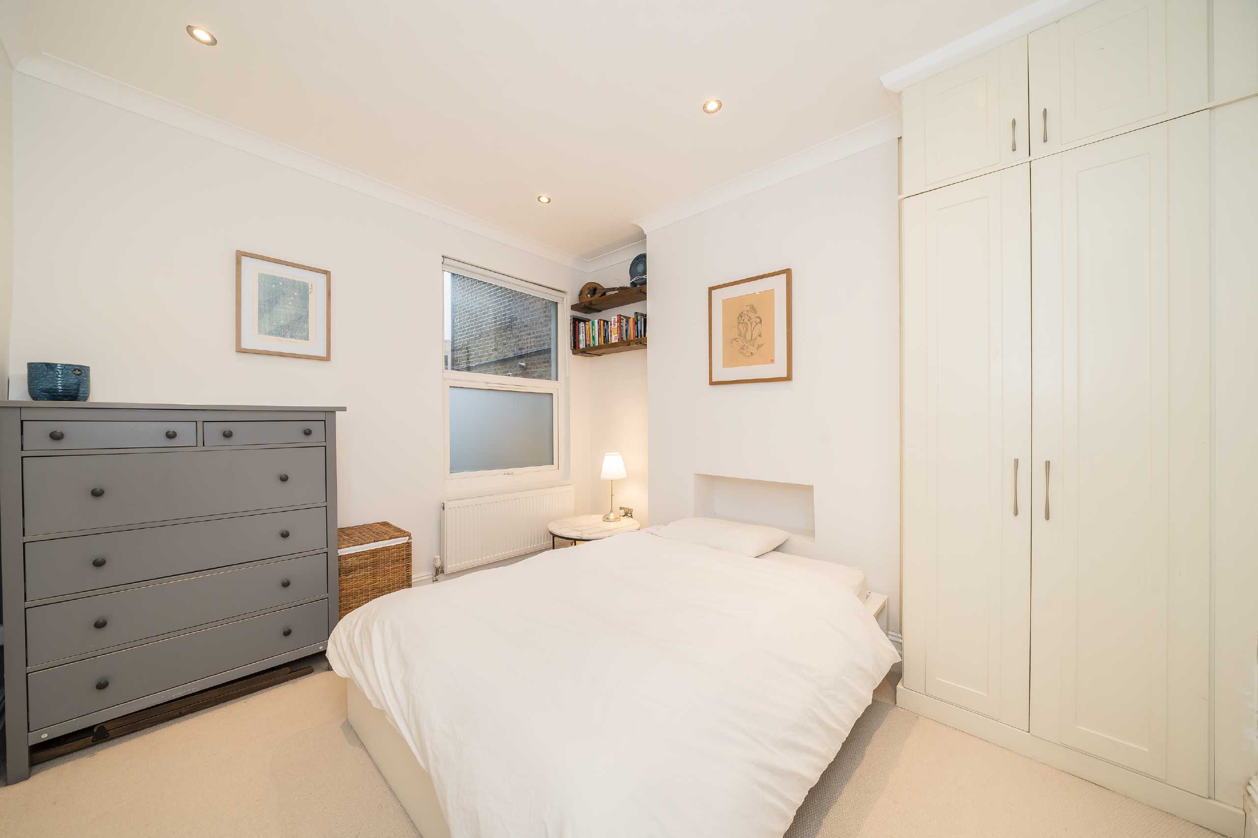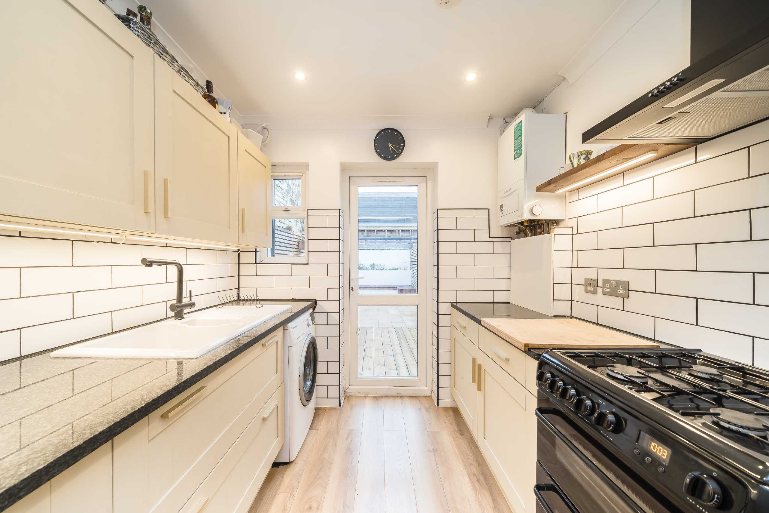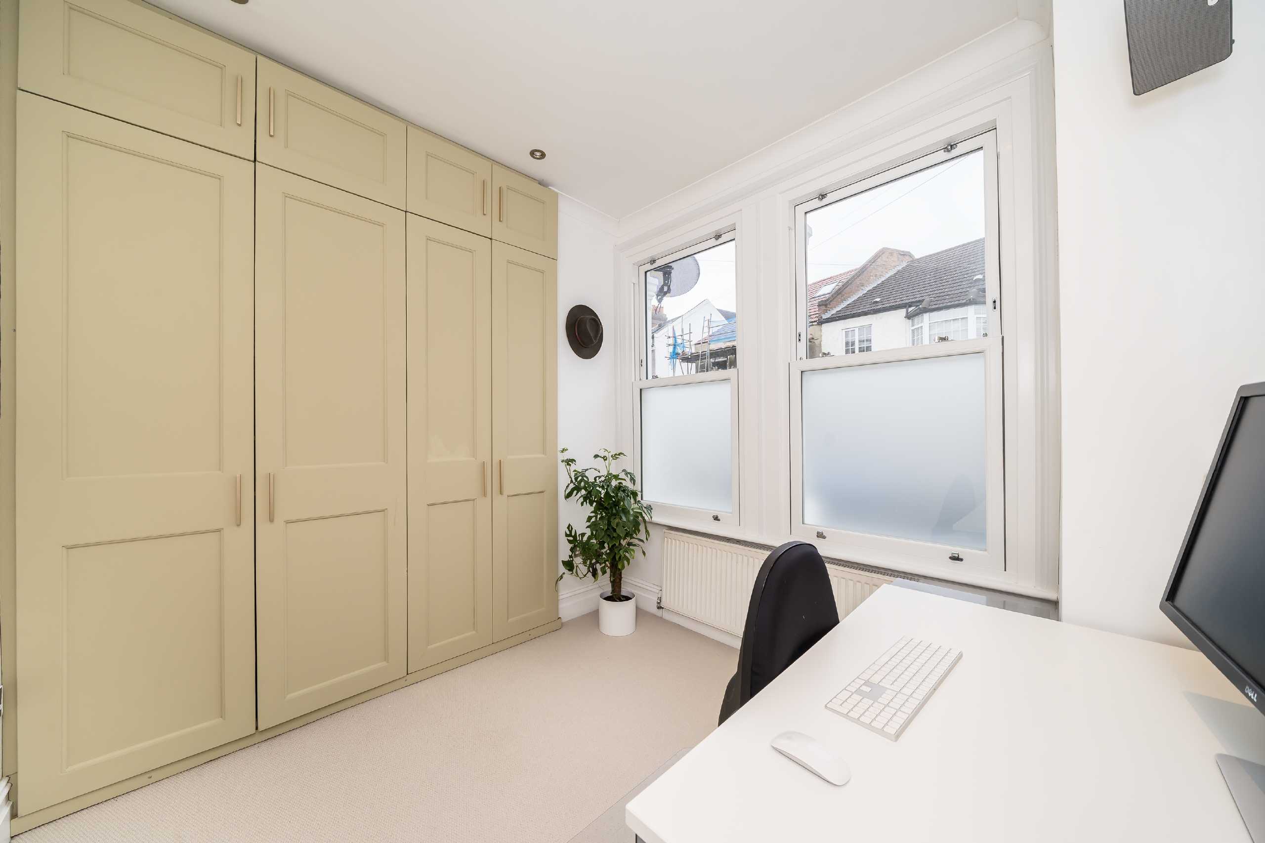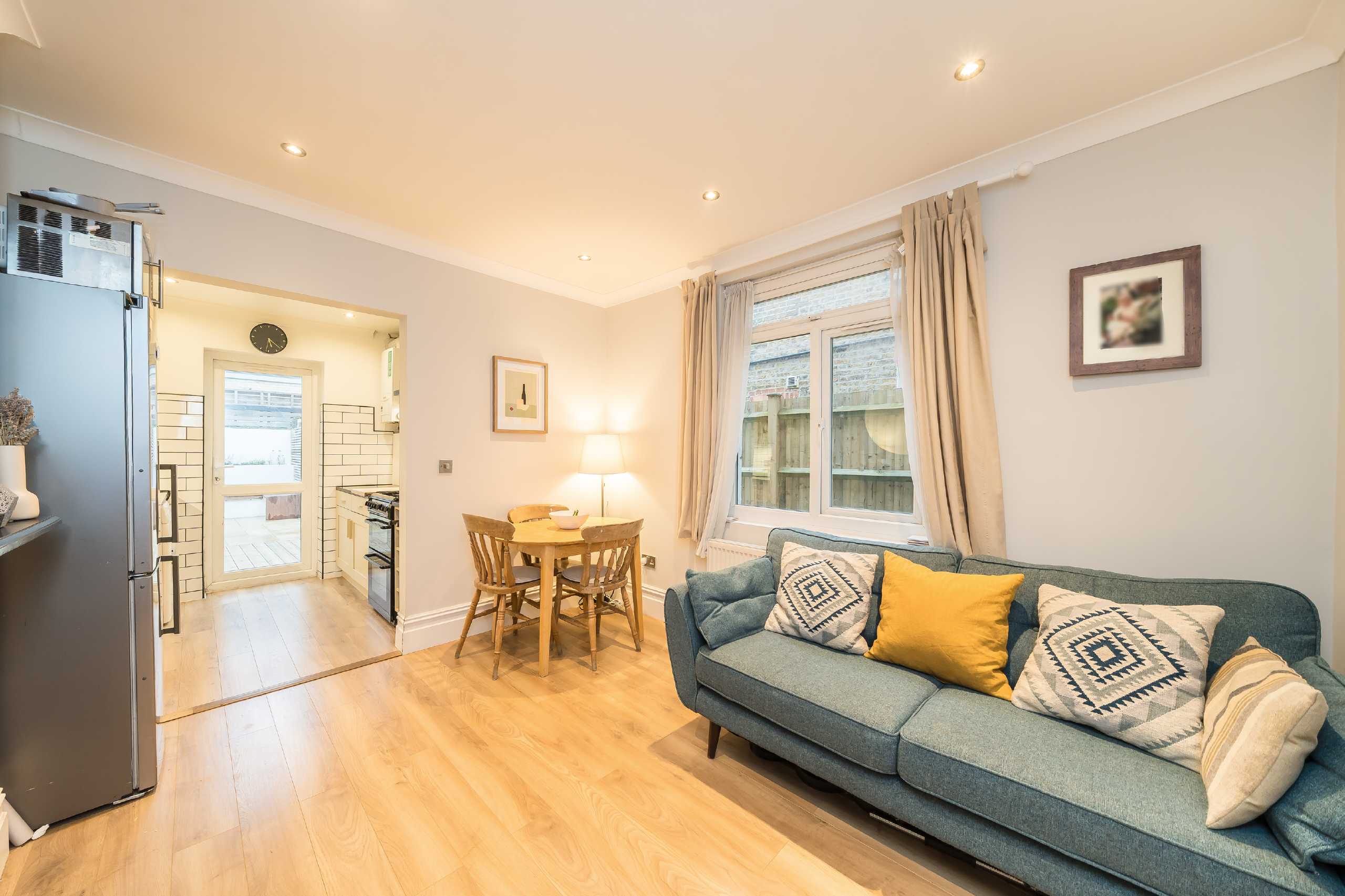 This ground floor maisonette set in a late Victorian conversion comes to the market in pristine condition. Two bedrooms are located towards the front of the property, both of which have built-in wardrobes and high ceilings. There is potential to use one room as study as it is currently set up, or a nursery. There is a contemporary family bathroom with a shower over the bath and wooden flooring which continues through to the reception room. A cased opening doorway provides partial separation between the living room and fully fitted kitchen. Completing this property is the neat private garden, with partial paving as well as horizontal slatted fencing for privacy, and built-in seating.
