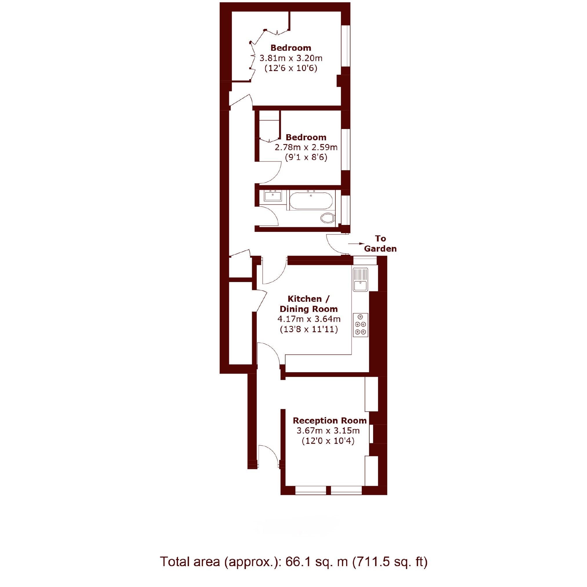 The accommodation includes a generous reception room, a spacious eat-in kitchen with direct access to a private rear garden, two bedrooms and a well-arranged bathroom. Thoughtful storage is also provided across the property.