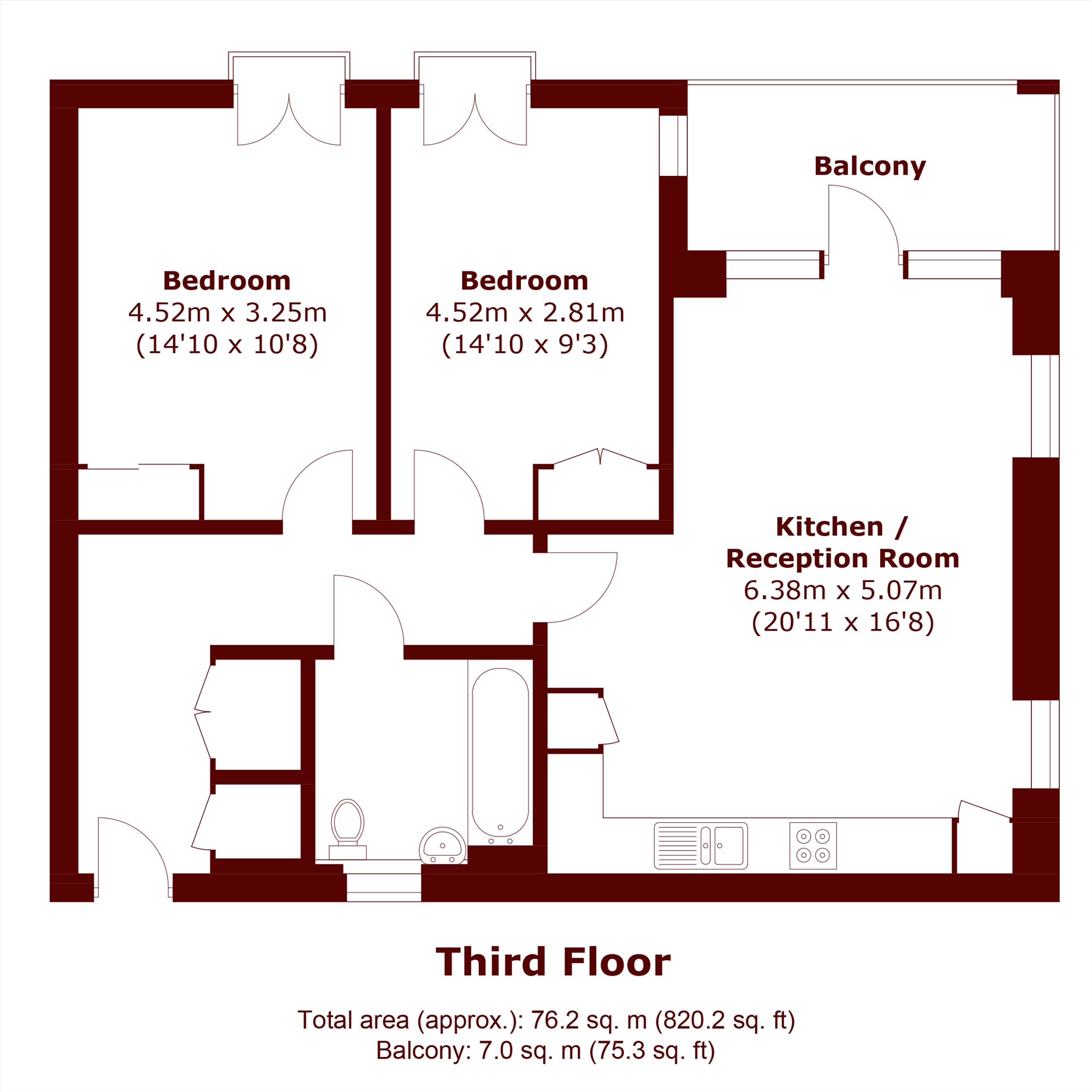 The property offers two generous double bedrooms, both featuring built in storage, and benefits from excellent natural light throughout thanks to impressive floor to ceiling windows. The spacious open plan living area incorporates a stylish contemporary kitchen and opens onto a private balcony enjoying far reaching views. A sleek, modern bathroom completes the accommodation.