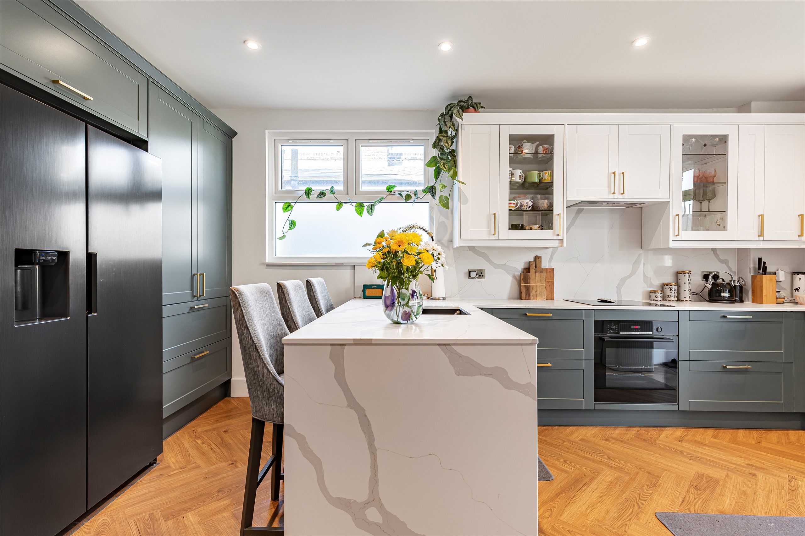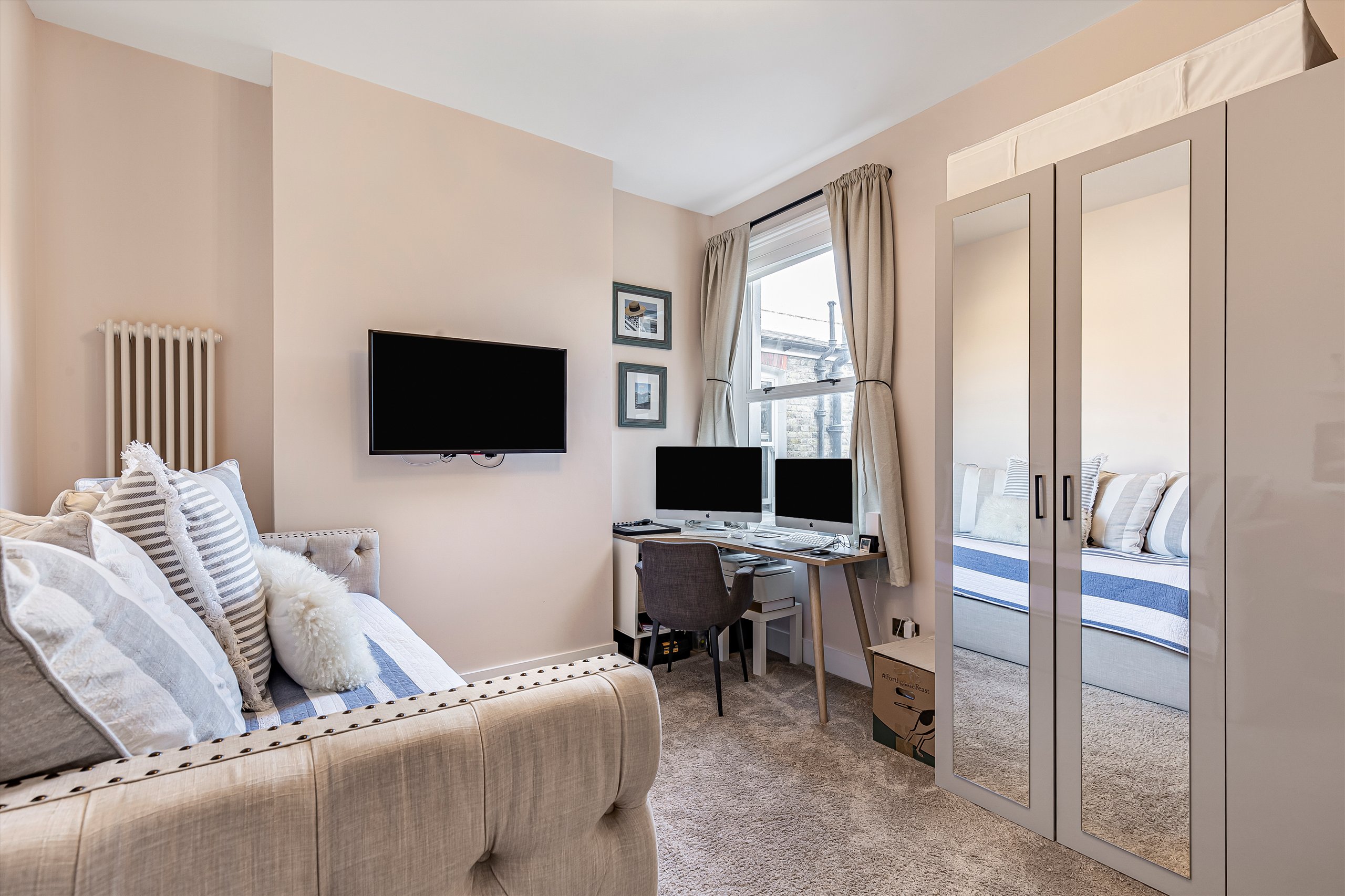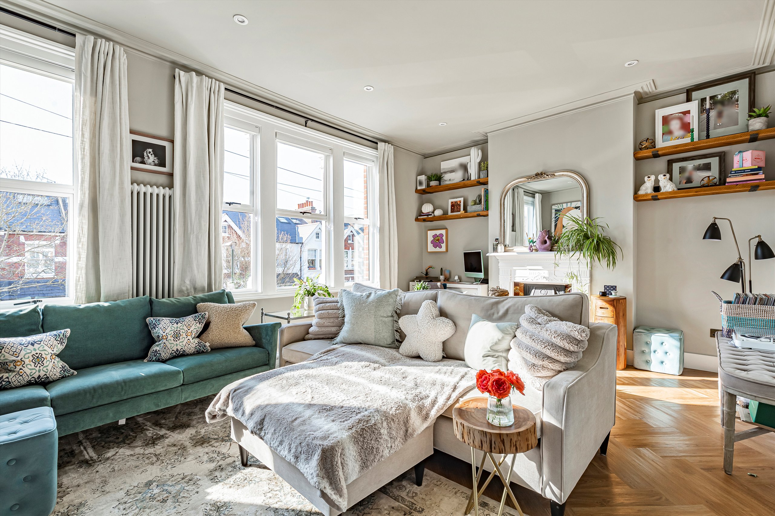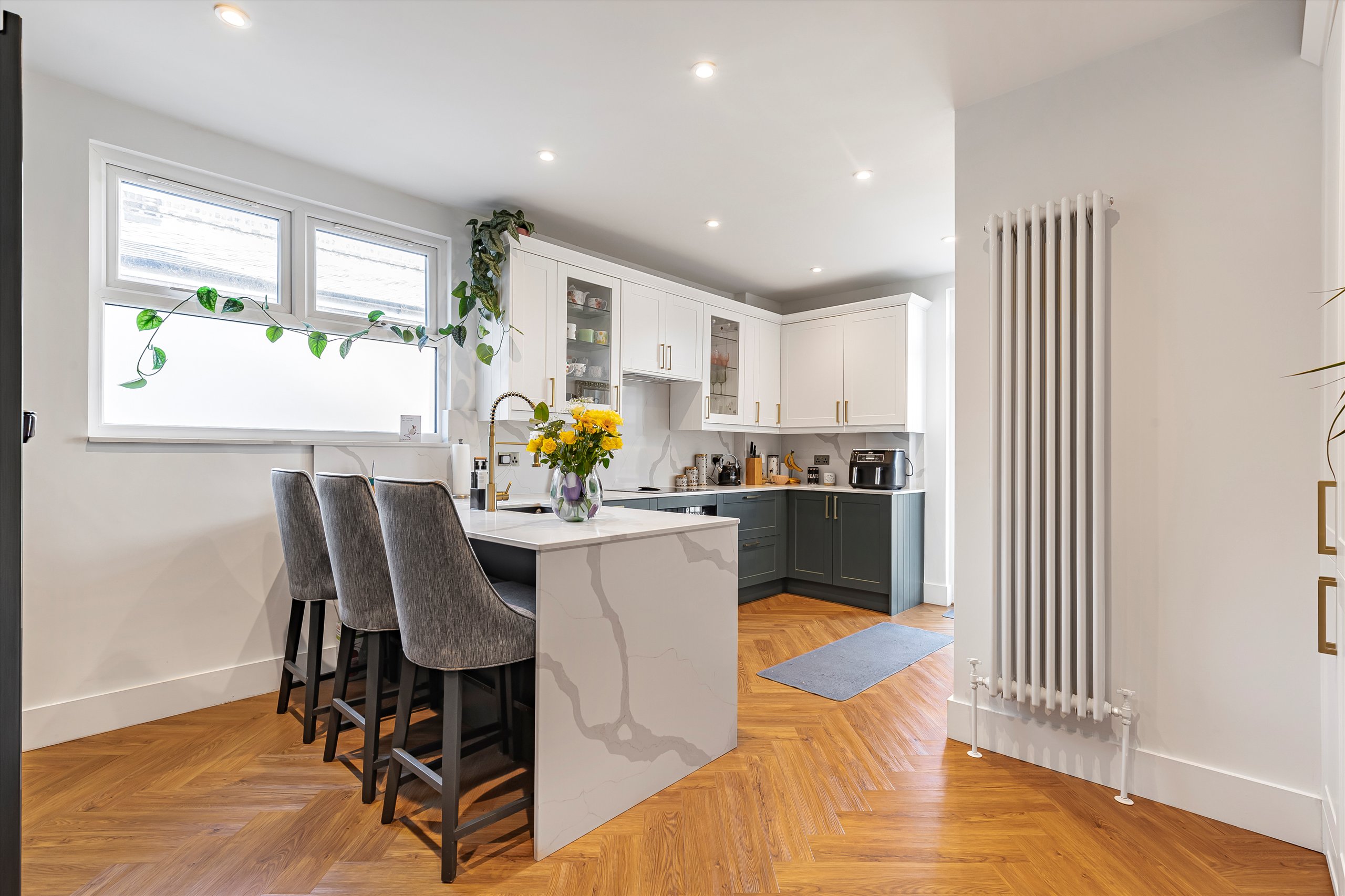 The flat comprises of it's own front door leading into a hallway entrance on the ground floor and the stairs take you up to a light and bright landing area. At the rear of the property is a modern kitchen with integrated Bosch appliances and Quartz worktops. There are French doors lead down onto a private courtyard garden with handy store room. On the first floor you have two double bedrooms and a front reception room running the full width of the house with Woodpecker herringbone flooring and the bathroom on the first-floor has Ravello terrazzo tiling. Upstairs as part of the new dormer extension is the principal bedroom, benefitting from stylish en suite and an incredible walk-in wardrobe.