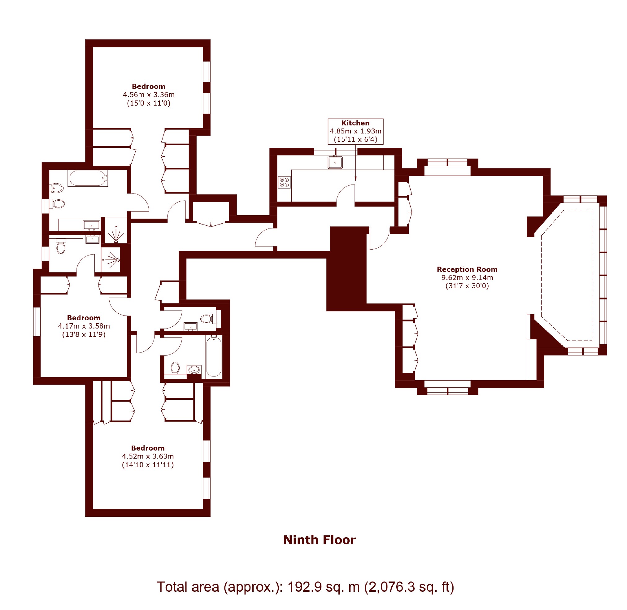 A stunning ninth-floor penthouse offering panoramic views across London and the River Thames. Accessed via a private landing, the apartment spans approximately 2,100 sq ft and features expansive living spaces designed to maximise natural light and showcase the exceptional outlook.