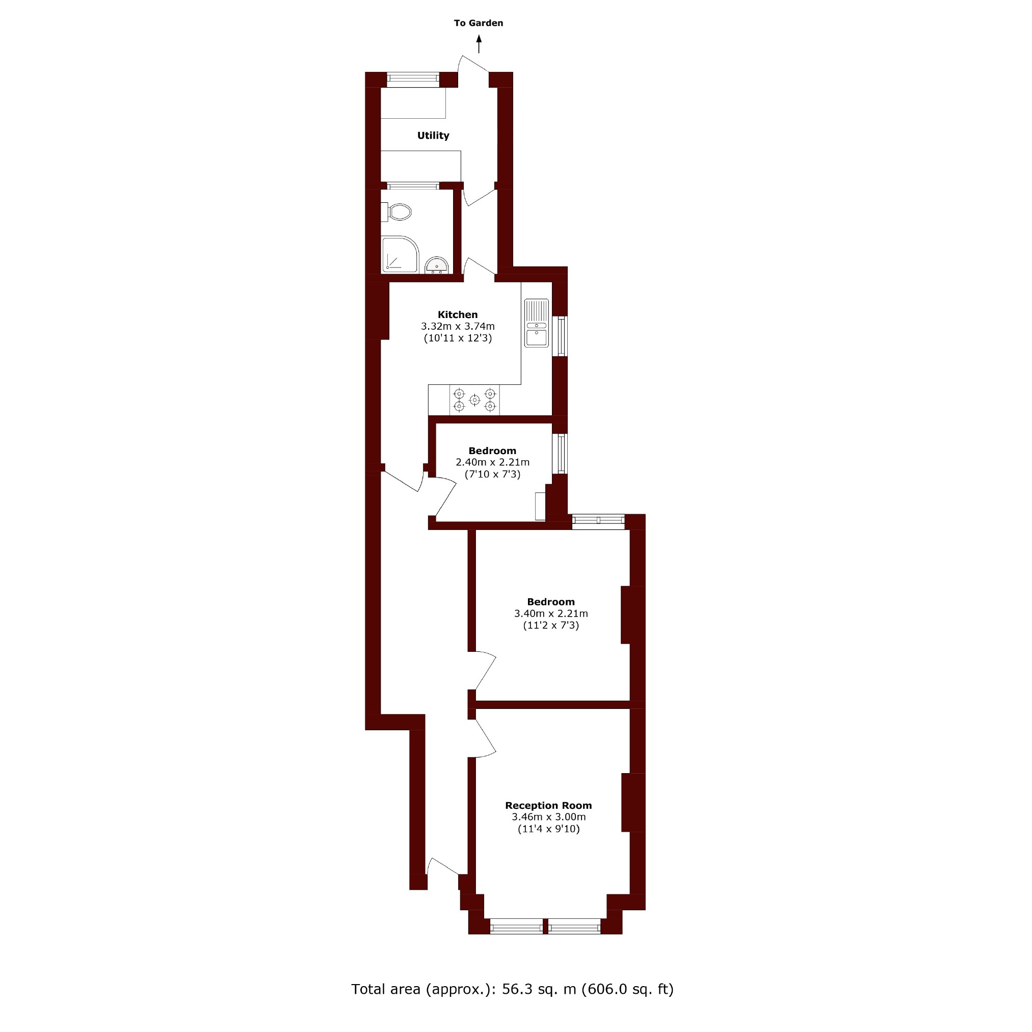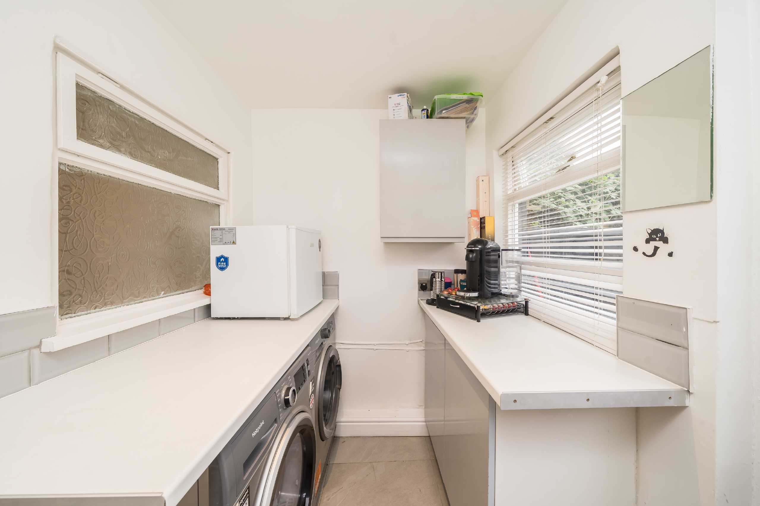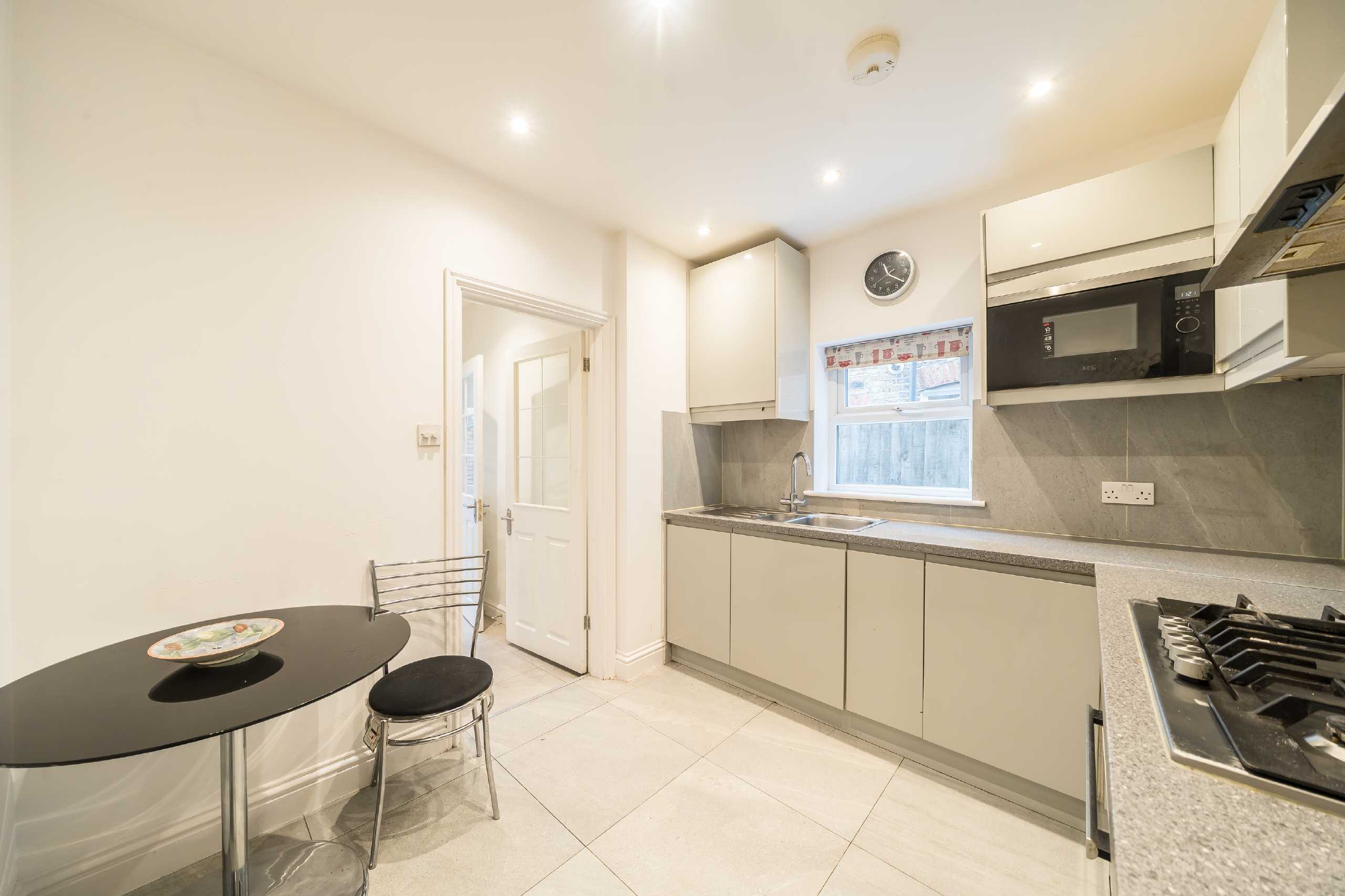 This lovely two bedroom property is located on the ground floor, and offers good proportions, high ceilings and wooden flooring throughout. The reception room is located towards the front of the property and benefits from large sash style windows. The master bedroom follows, along with a smaller second bedroom. Towards the back of the property is a kitchen/dining room with a fully fitted kitchen utilising the corner space of the room. A unique feature of this property is the separate utility room. Completing this maisonette is the neatly landscaped, partially paved private garden.
