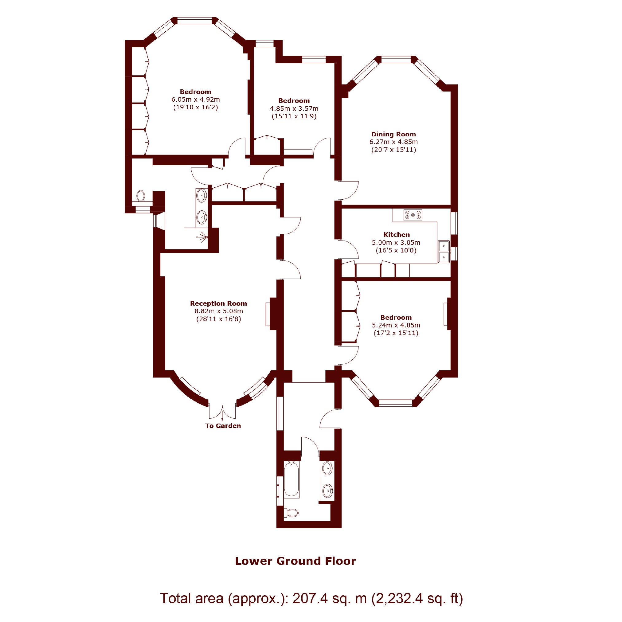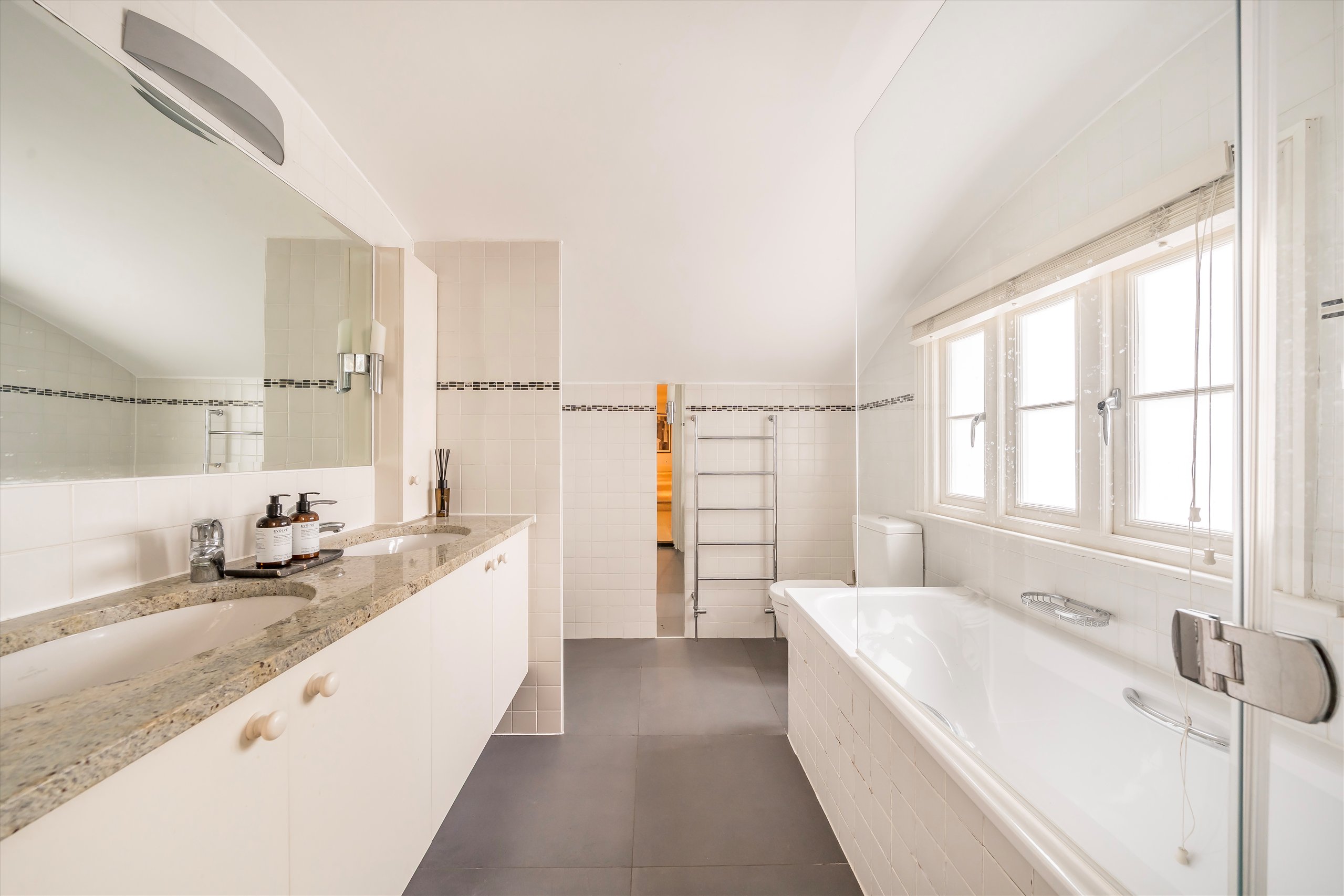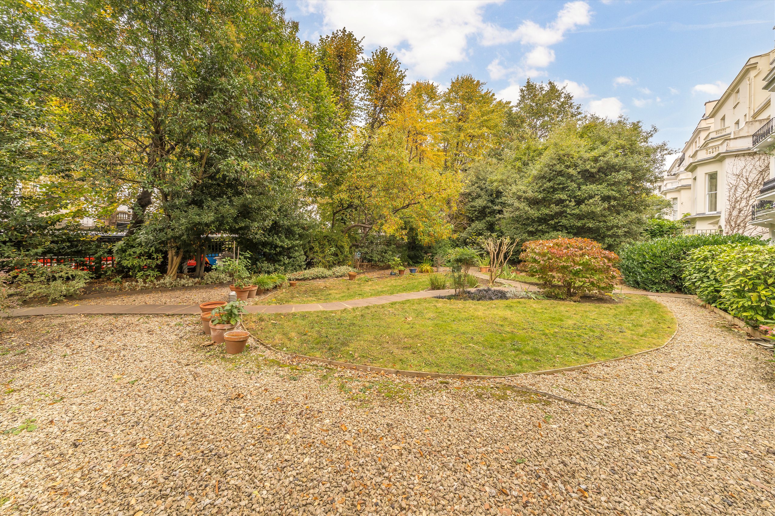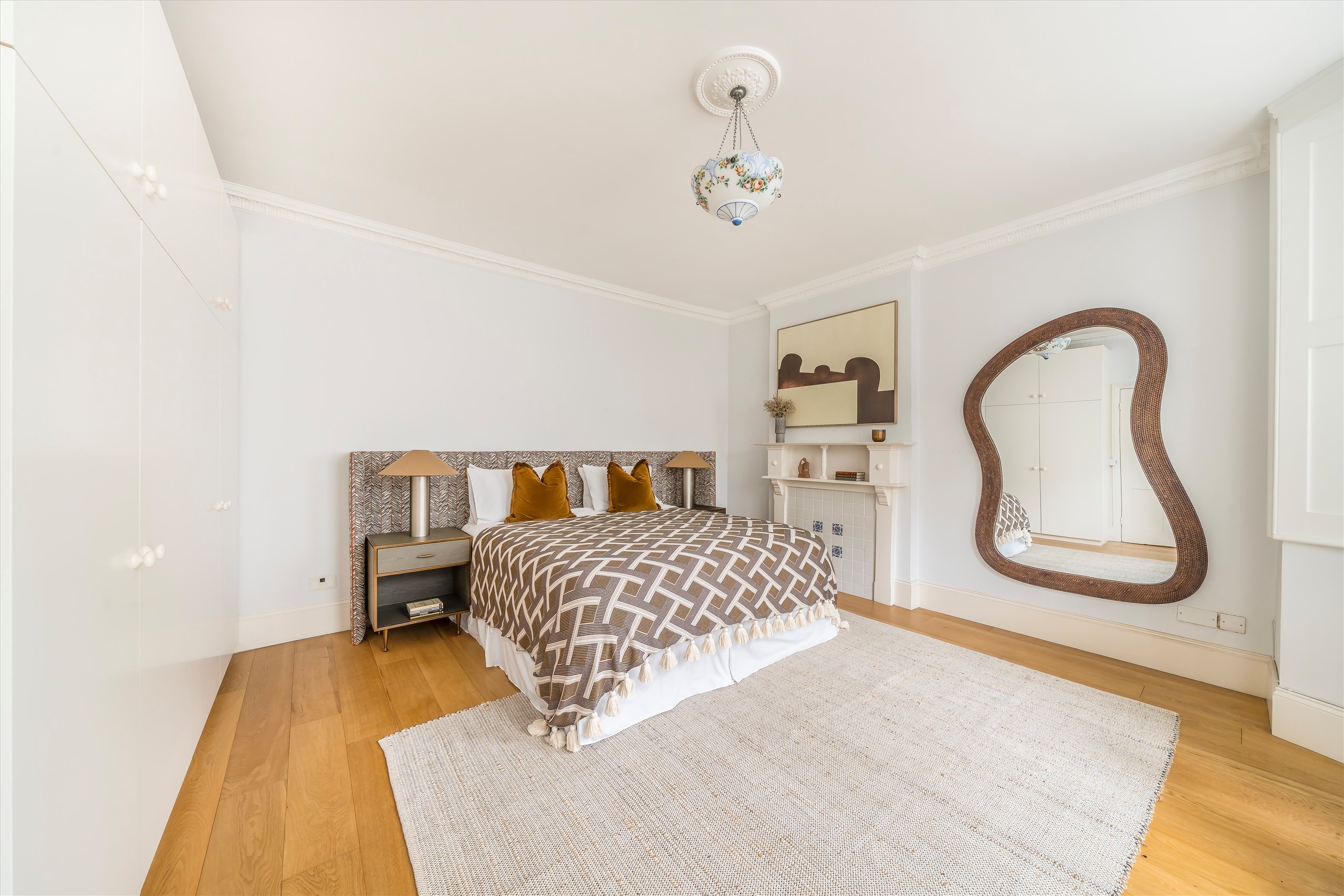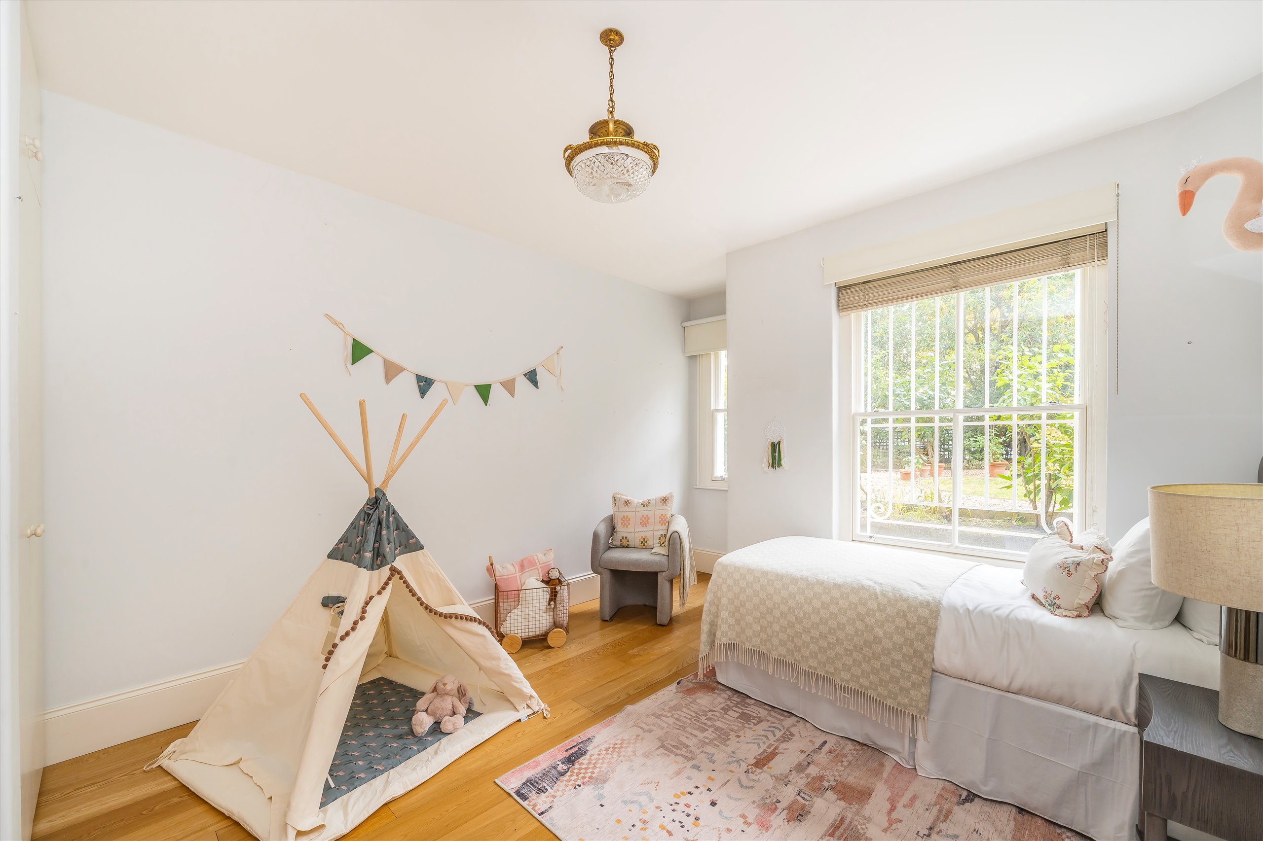 The apartment boasts four double bedrooms, two bathrooms, a spacious reception room, and a separate kitchen, all arranged laterally across the floor. Wooden flooring and original period details feature throughout the principal rooms. A private front patio and beautifully maintained communal garden shared between three villas complete this rare and desirable offering in one of London's most sought-after neighbourhoods.