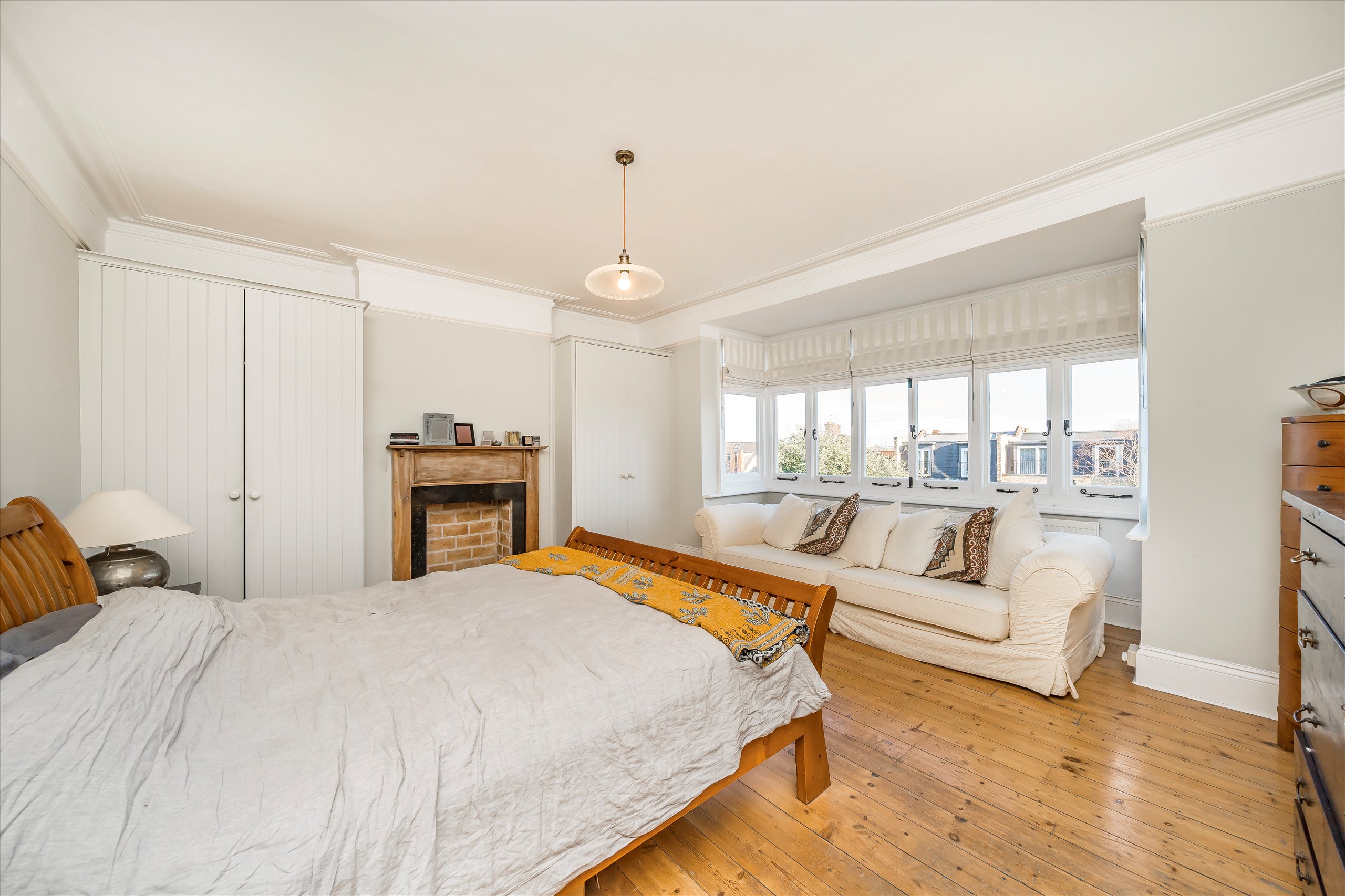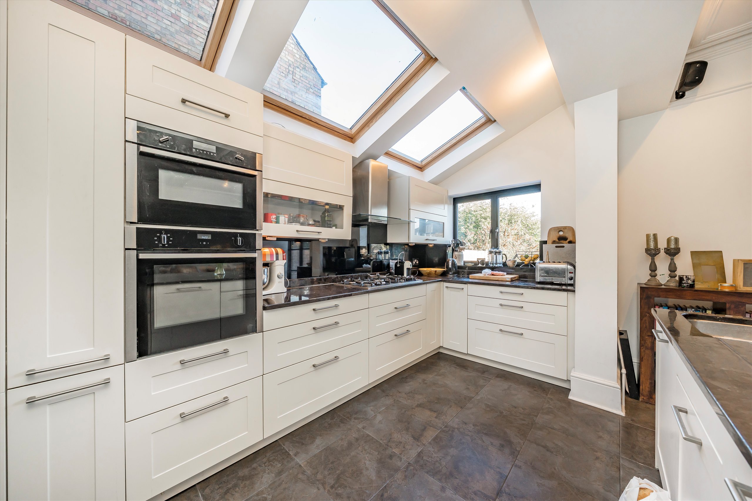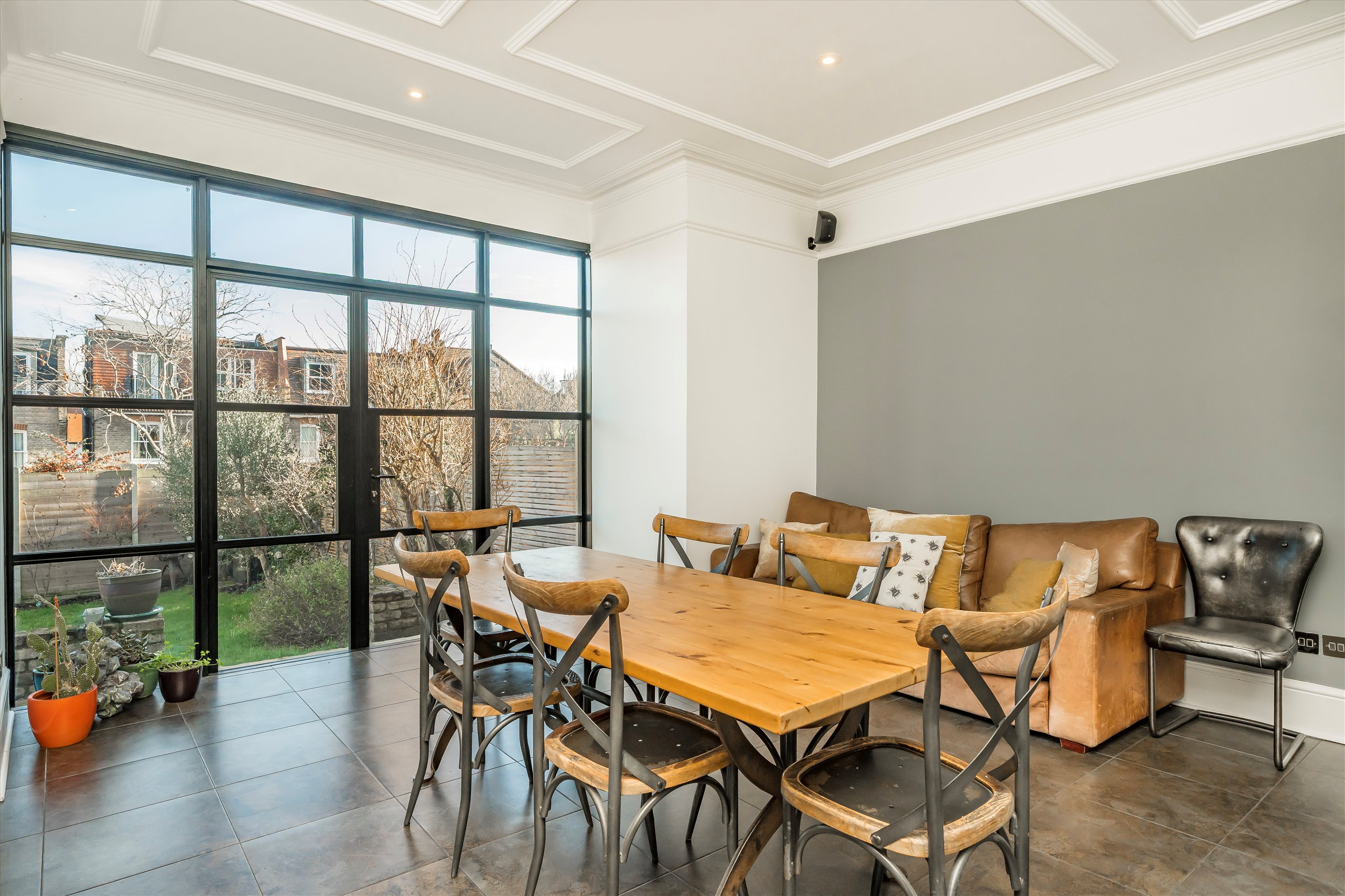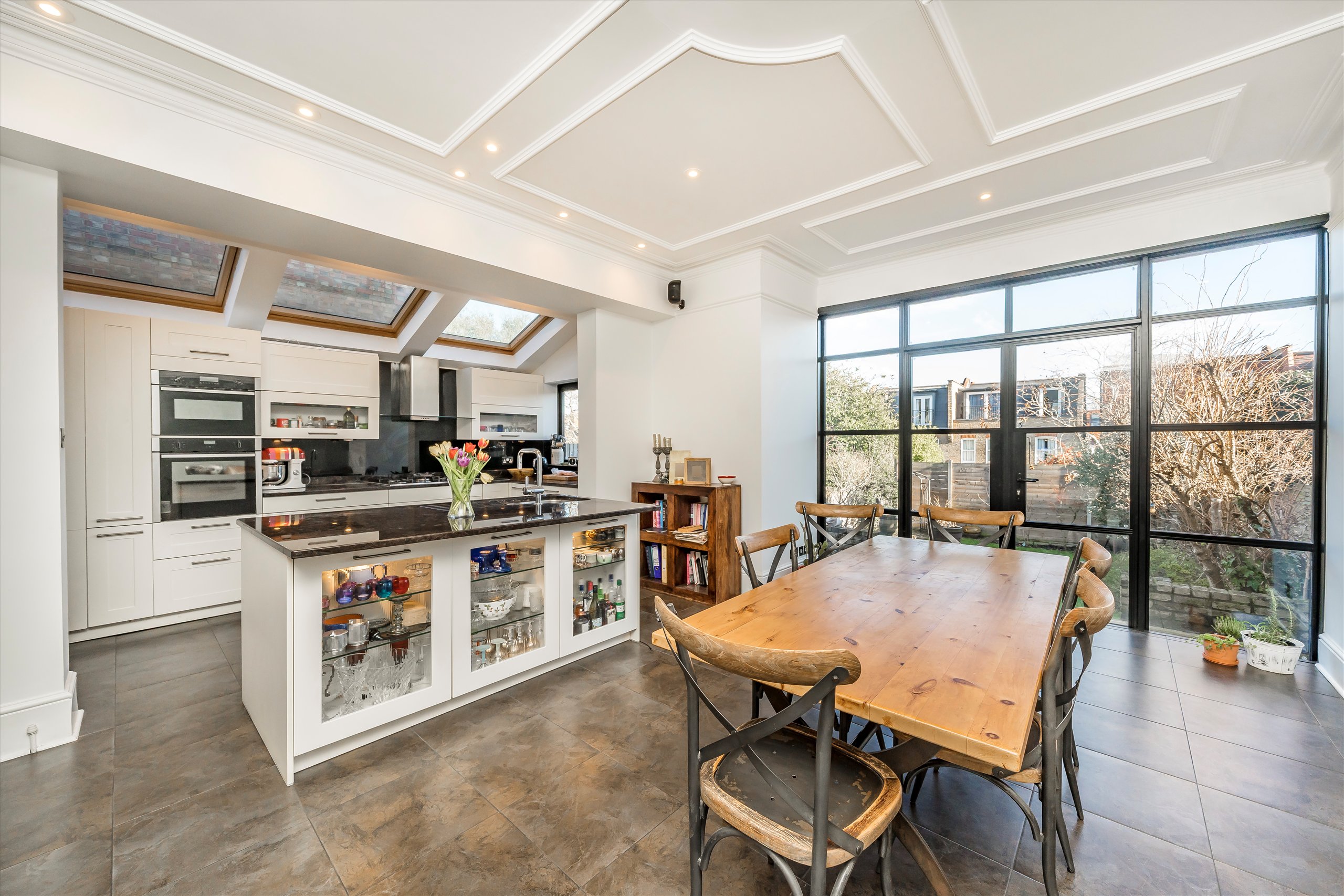 Perfectly positioned on the peaceful central stretch of Dora Road. This natural three storey house features a large family kitchen extended to the side. It offers ample space for a dining table, is stylishly fitted with built-in appliances and a large central island. Crittall glazed doors and windows lead onto a paved patio and large lawn with mature trees and shrub borders.
