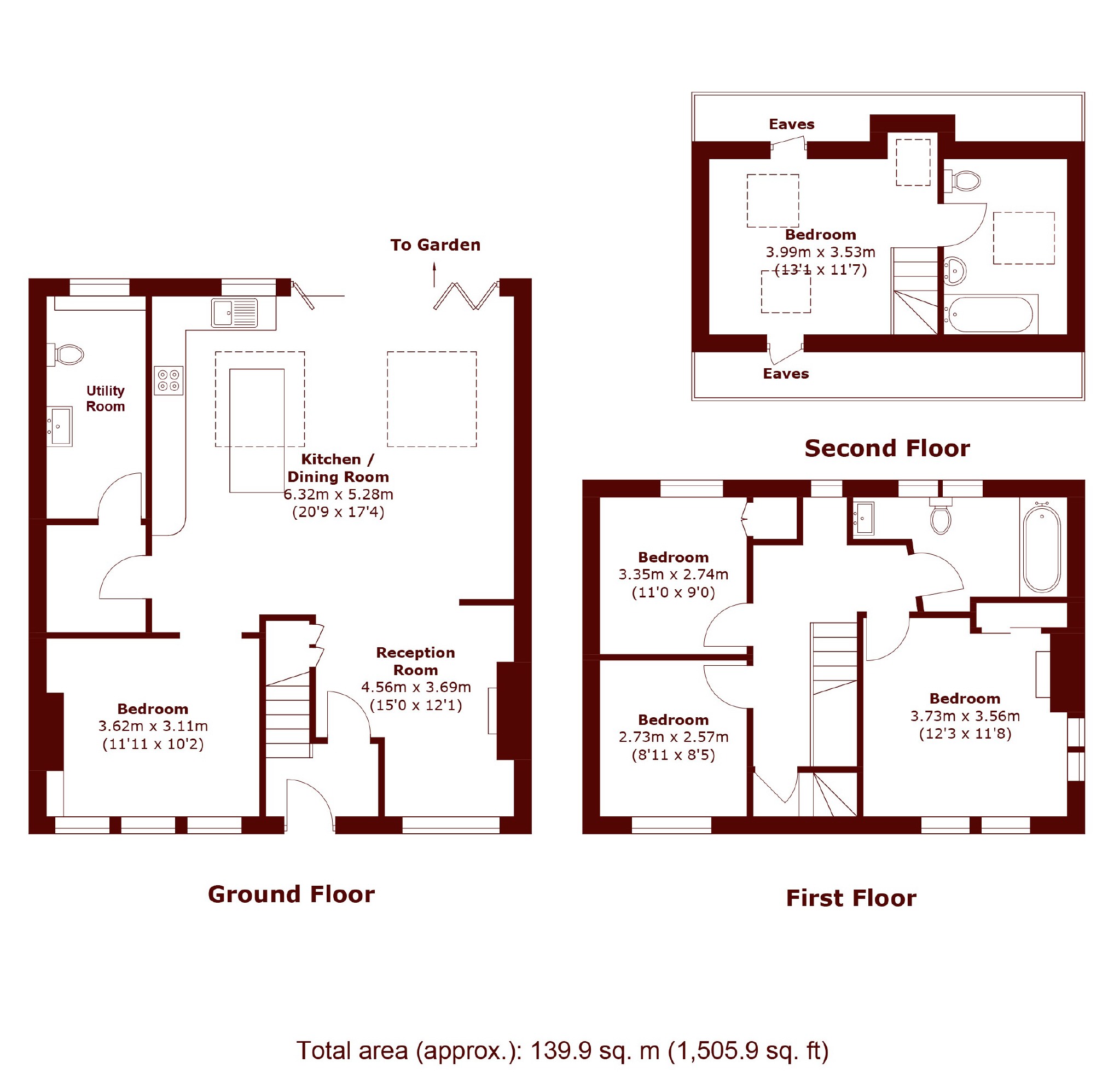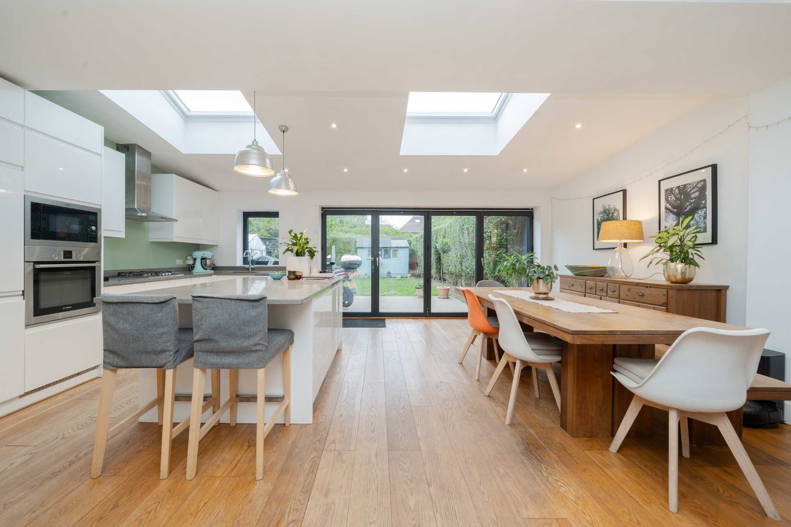 The property features an open-plan kitchen and dining area with bi-folding doors opening onto a large private garden, perfect for entertaining and family living. There are two full-sized bathrooms and a ground floor WC, providing both comfort and convenience.