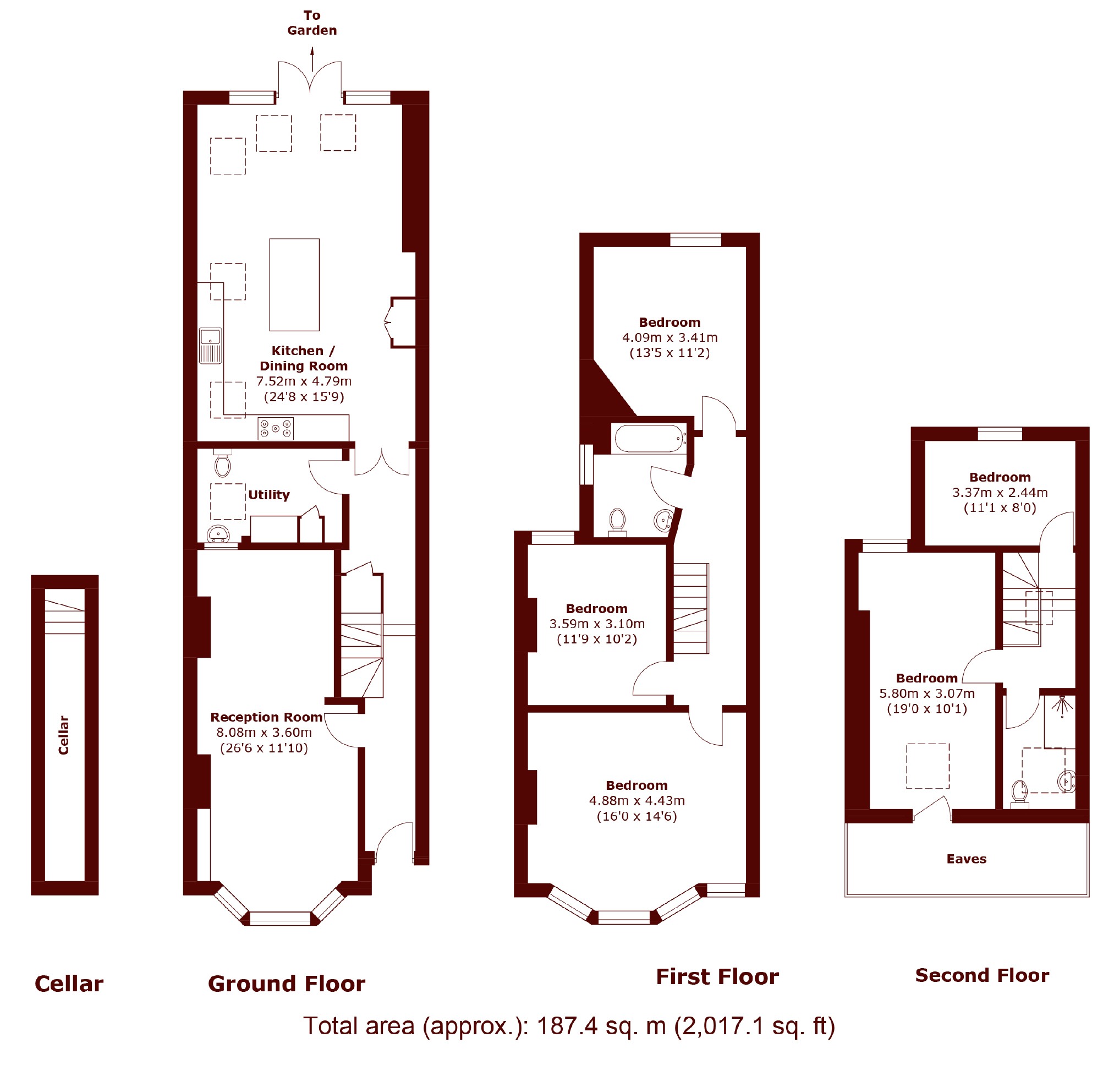 The upper floors comprise three well-proportioned double bedrooms and a family bathroom on the first floor, while the top floor offers a contemporary home office and a luxurious principal bedroom with its own family bathroom. Additional benefits include a useful cellar, providing excellent storage or potential for conversion.