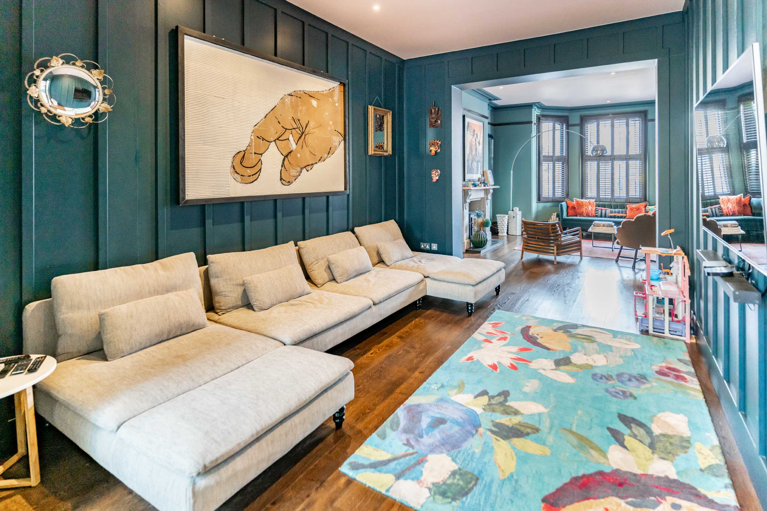 The ground floor offers exceptional entertaining space, including a stunning open-plan kitchen and dining area which has been fully extended and thoughtfully designed. Bi-folding doors open out to a beautifully maintained west-facing garden, complete with a versatile summer house/studio ideal as a home office or creative space.