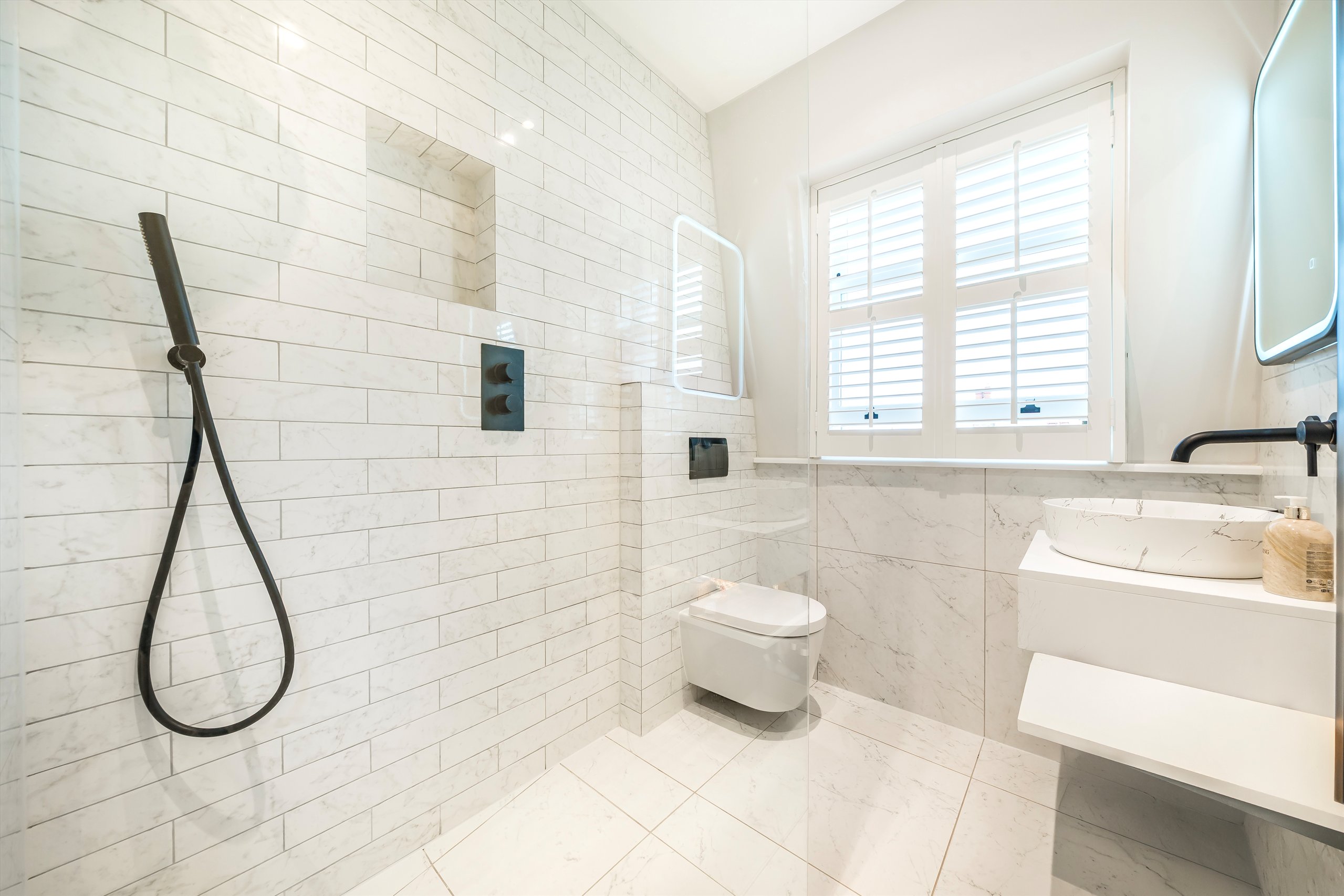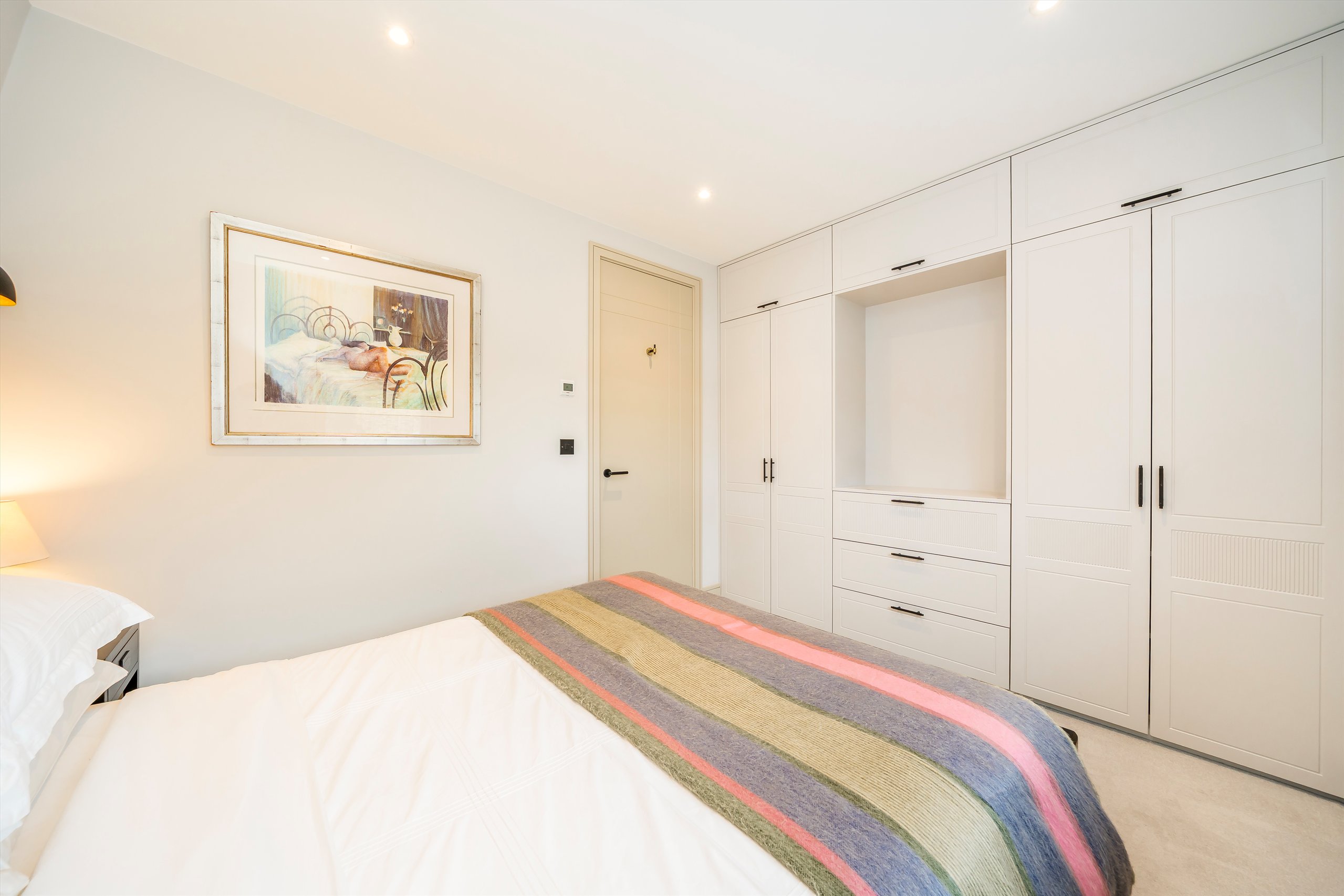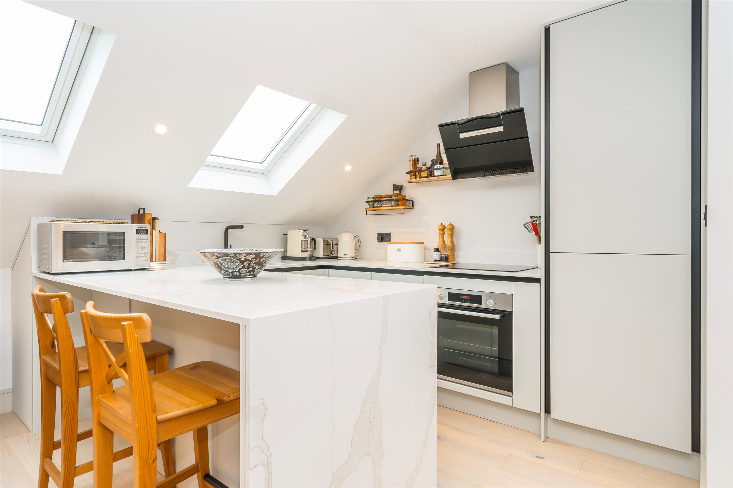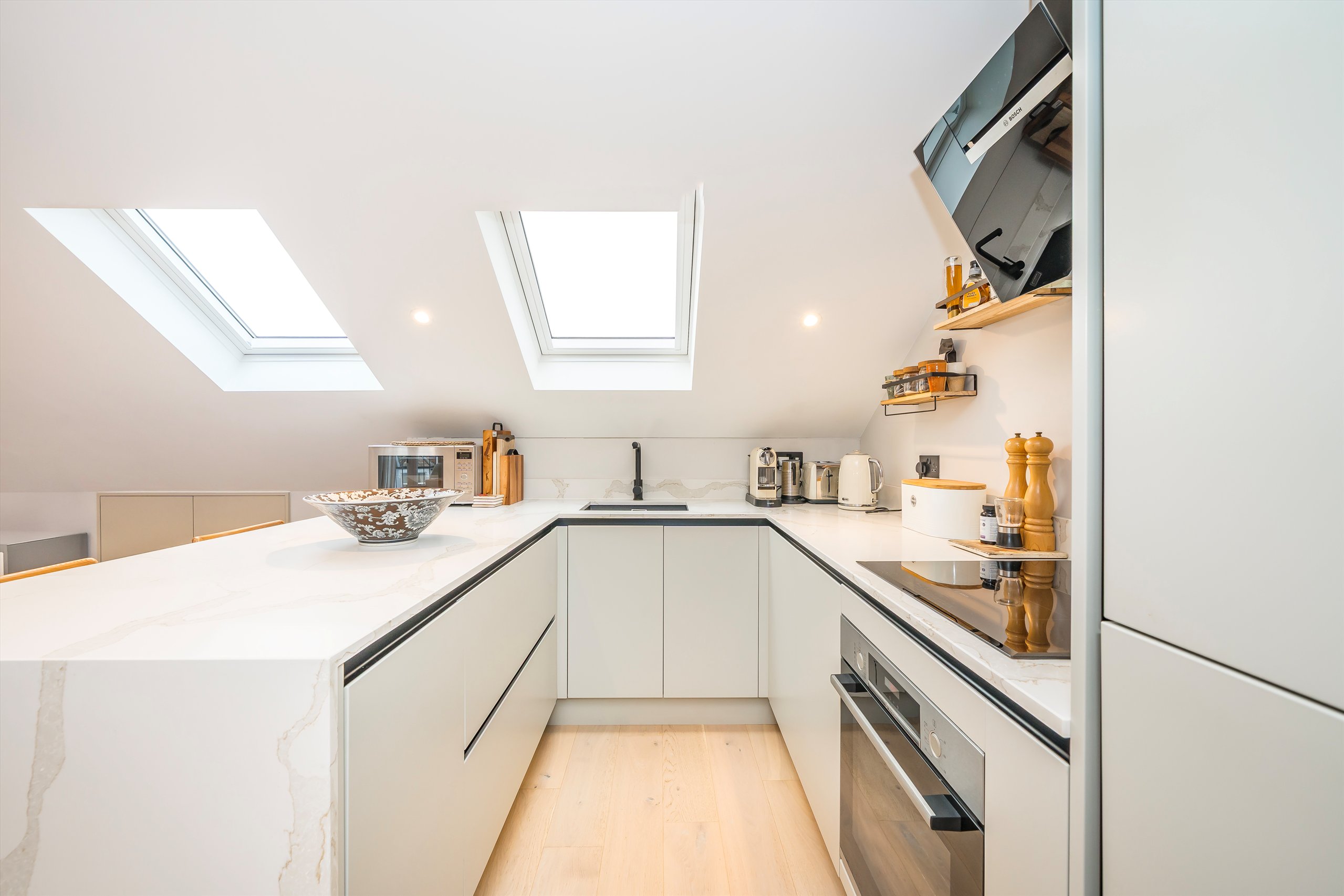 The open plan kitchen is both sleek and practical, finished in Matt Pearl Grey with quartz worktops and integrated Bosch appliances ideal for everyday living and entertaining. Cleverly planned joinery provides copious amounts of storage without compromising the clean, contemporary feel of the space. The bedroom is positioned at the rear of the property and benefits from a sunny southerly aspect, bespoke joinery, and generous built-in wardrobes. The bathroom is smart and contemporary, featuring a white suite, matte black fittings, and elegant Minoli wall tiles.